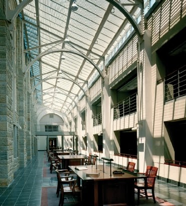 The atrium space had been constructed in the 1980s as a twenty-one-foot-wide airy link between the original early-20th century gothic revival structure and a more modern and understated rear wing, with a green roof housing the stacks. With a sloped glass roof and bris soleil mounted below, this void extends out one hundred and forty feet from the core of the structure, terminating in a glass curtain wall entryway at the east.