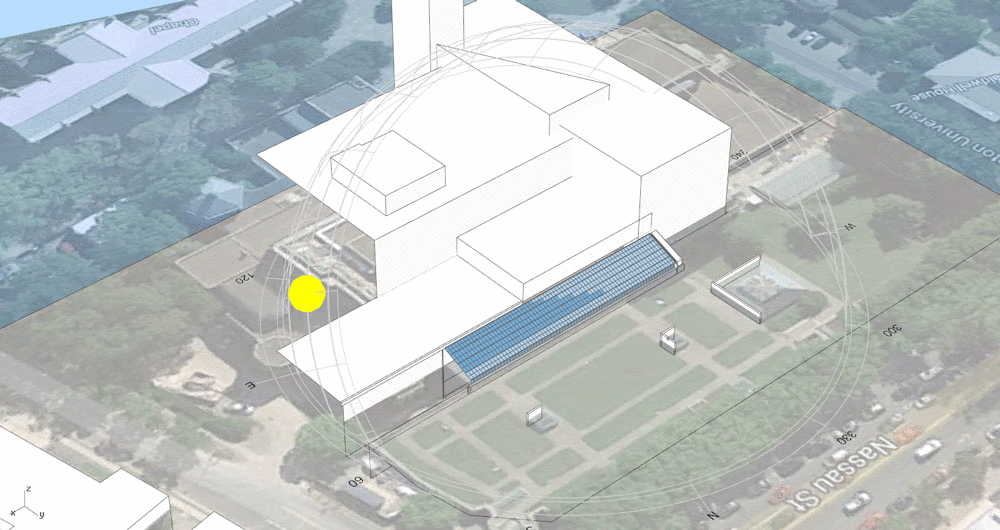 While the Solar Scene appears natural, like ever-evolving shadow patterns, design decisions were made and embedded into the algorithm that simulated this effect. If the patterns were designed, they may be changed, with the potential for maintaining the intended shading effects. The skylight is now essentially a low-resolution media display with 923 pixels; each pixel is capable of 4 shades of blue, and with a transition time of 2-15 minutes. Visiting artists could be commissioned to produce a scene that runs during a particular event, or program text to slowly scroll across the skylight, or even display Princeton’s crest. On gloomily overcast or dark winter days, abstract geometric patterns could slowly morph over time to provide dynamic visual interest. The possibilities are quite literally infinite. This suggests a new medium for architecture – the capacities of high-performance façades to be hybridized, producing both an effect and a performative act.
