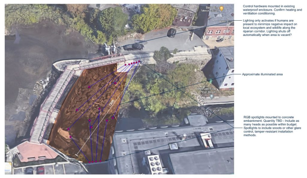 The Methuen Arts Council contacted Lam Partners based on our work with Beyond Walls Lynn, asking Lam to assist in developing a design to illuminate Methuen’s waterfall on the Spicket River. The project is made possible by a $25,000 grant from the Essex Country Community Foundation. The Eagle-Tribune featured the project in its March 2021 article, “Methuen’s Spicket River: Just like Niagra“.