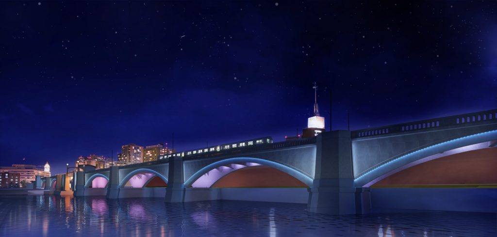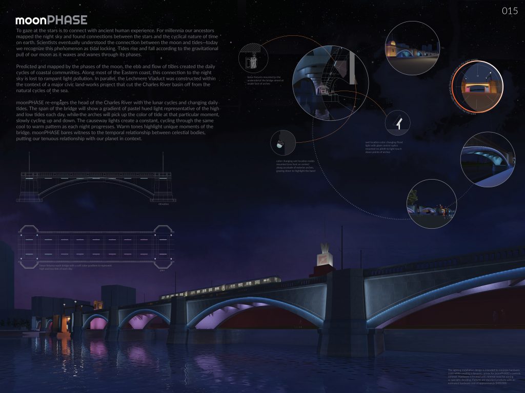 The first -place winner of the Lechmere Viaduct lighting competition, moonPHASE offers a lighting scheme with a tide created by light, engaging viewers.