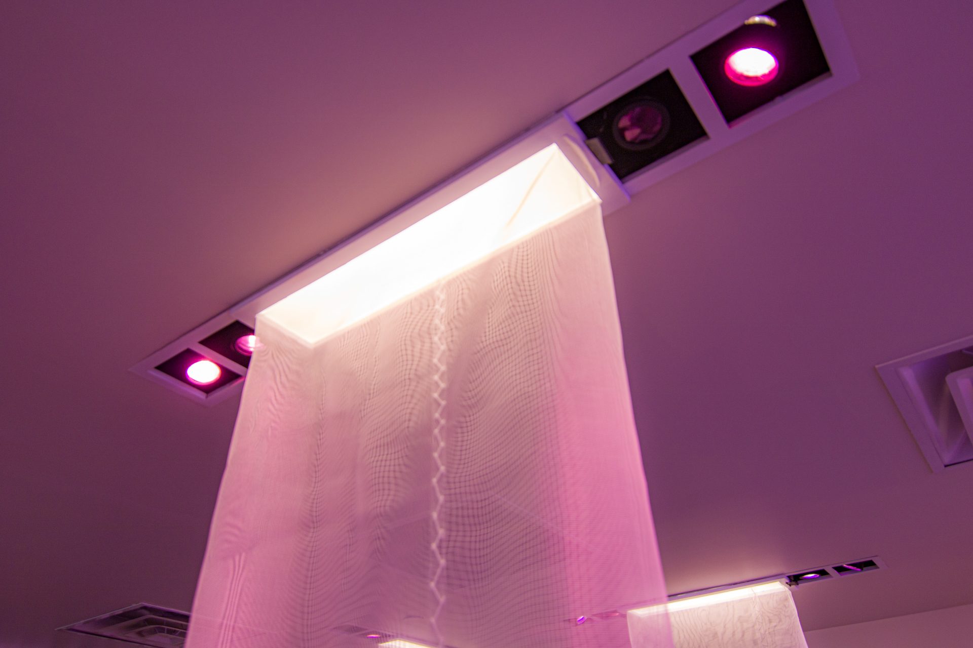 Lam recently installed a site-specific light art installation “Light in Context ” in the 500sf gallery constructed of white screen, colored gels and RGBW 10×60 grazers loaned by Apex Lighting. Lam transformed the BB&N Gallery space through light and material.