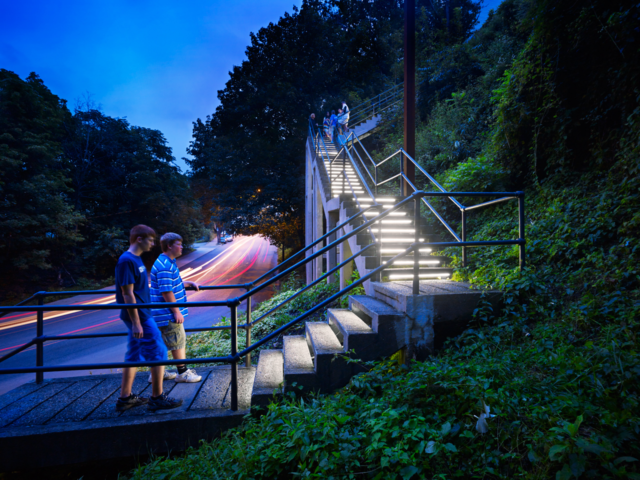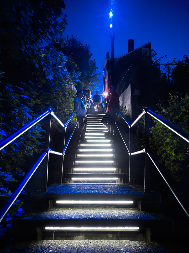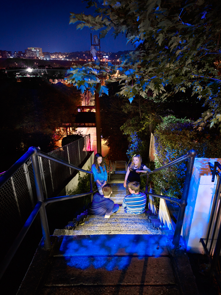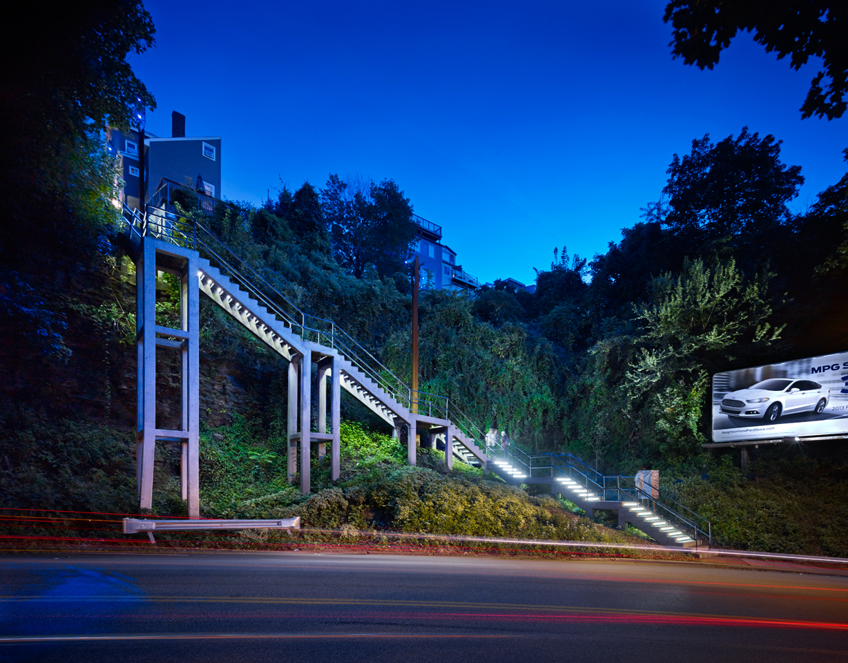 The South 18th Street Steps are part of a series of projects that aim to highlight and celebrate gateways to the South Side Slopes neighborhood. Located on the slope’s busiest street, and at its boundary with the south side flats, the 18th St. Steps are a high-visibility icon, as well as a heavily trafficked pedestrian route. The lighting design for the steps serves as an eye-catching element that will draw attention to the neighborhood above, and create an exciting experience for pedestrians as they move from the ‘Flats’ up to the ‘Slopes’ of the South Side.