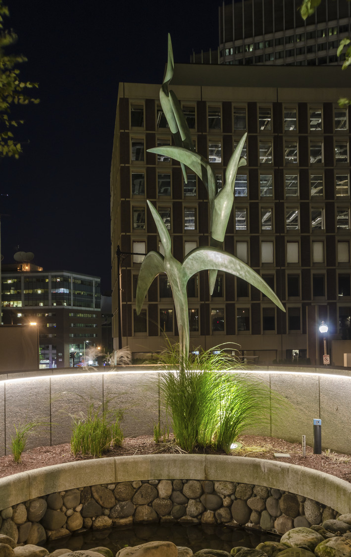 Located near the historic State House in Boston, the Garden of Peace commemorates victims of homicide. It is a symbol of the hope for peace, and a reminder of the lasting impact of violent acts. The lighting for the memorial encourages quiet contemplation. The central focus of the memorial is a dry streambed, filled with smooth stones engraved with the victims’ names. A trickle of water appears, moving through the garden, and finally flows into to a pool with a soaring sculpture, representing hope. Lam Partners facilitated upgrading and retrofitting the existing light fixtures to LED, and added new LED fixtures for future signage locations.