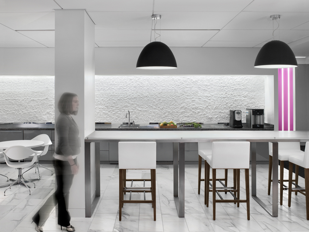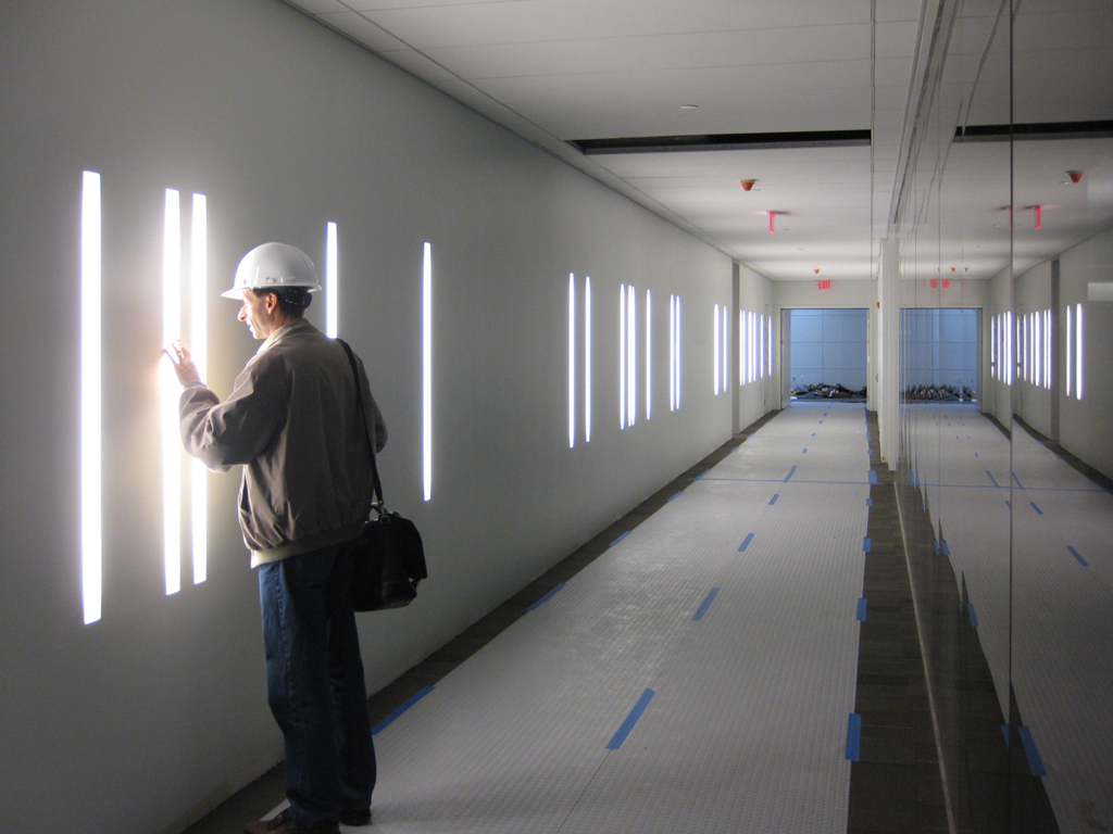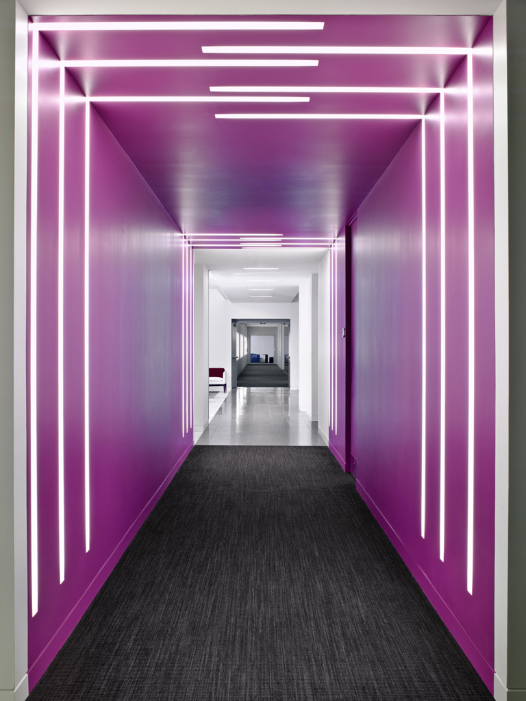 Narrow lensed, flangeless fluorescent fixtures create a signature barcode effect in interior corridors. Smokey gray glass on the opposite wall multiplies the effect, while providing privacy to workers beyond.