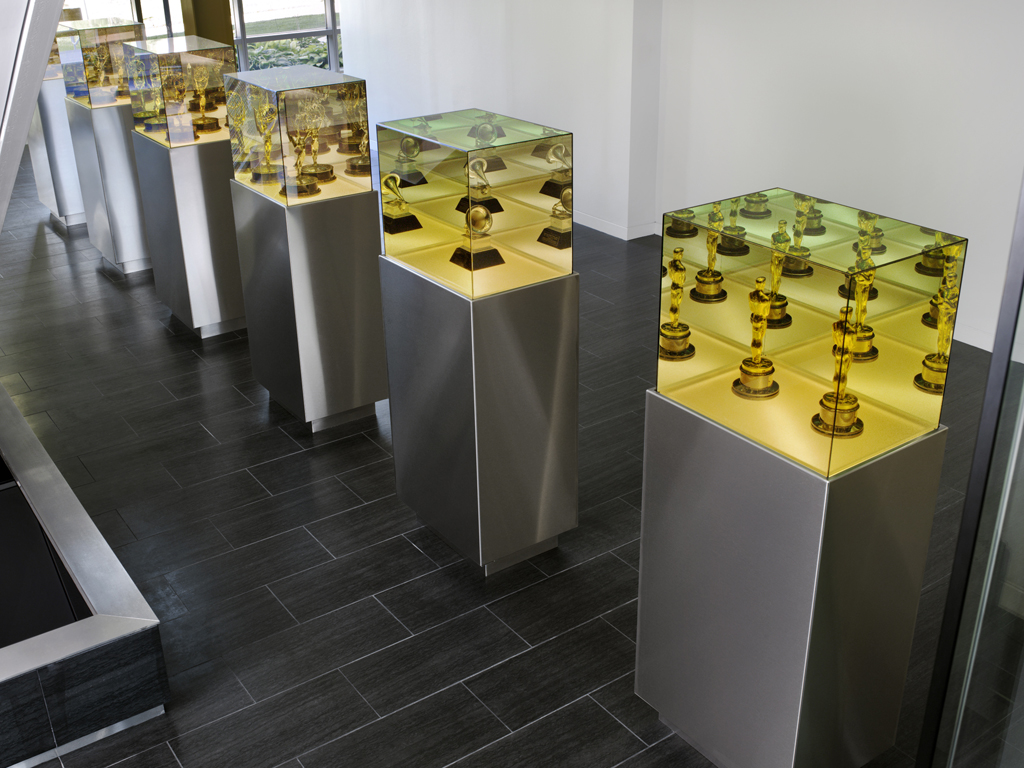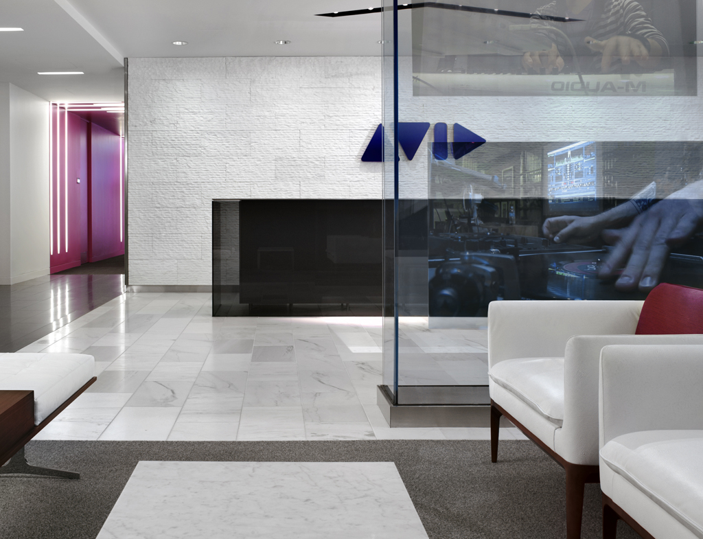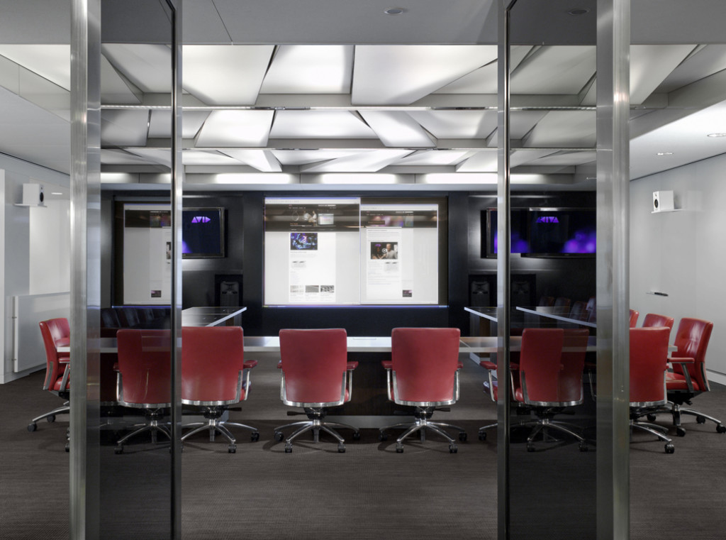 High-tech features in a 200,000-square-foot corporate headquarters reflect the work and accomplishments of this world-renowned media firm. The public/client experience begins at the lobby, where visitors are enthralled by video feeds projected onto two-story vitrines. Wallwashers highlight textural stone, while the knife-edge slot in the ceiling conceals halogen track accents for the desk.