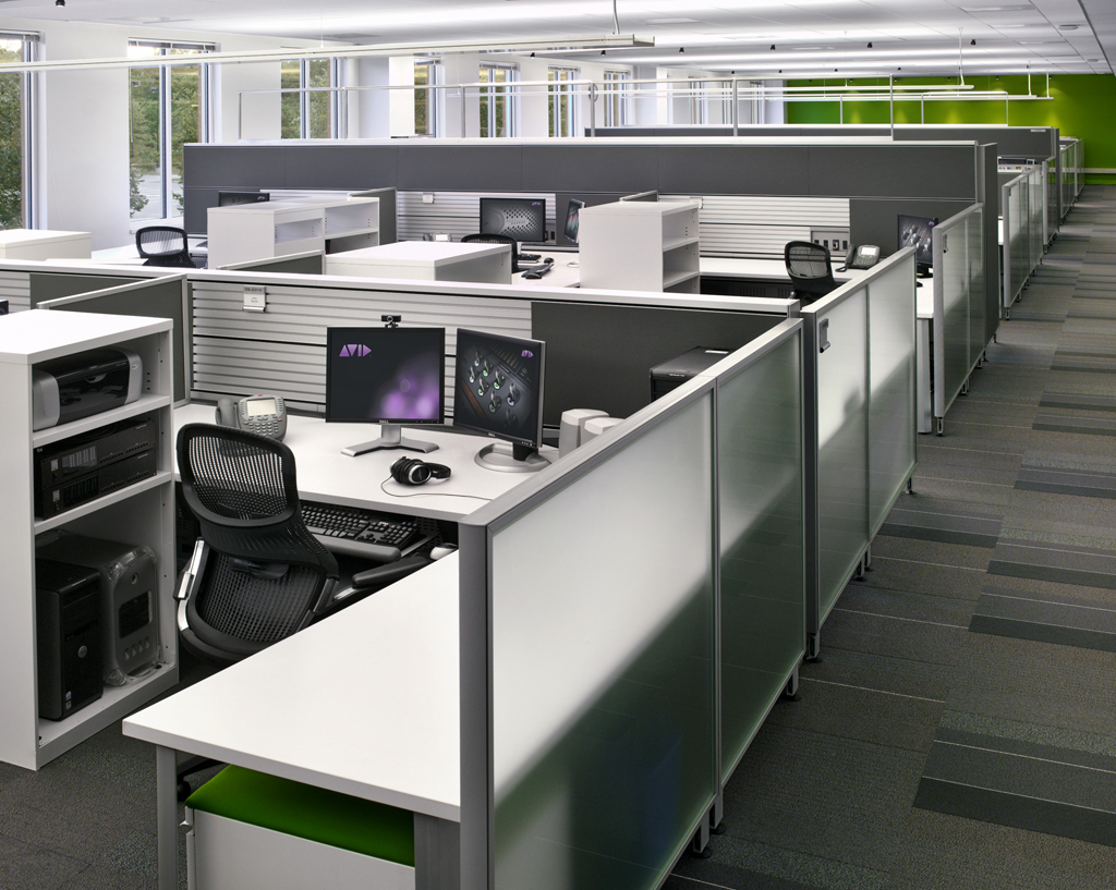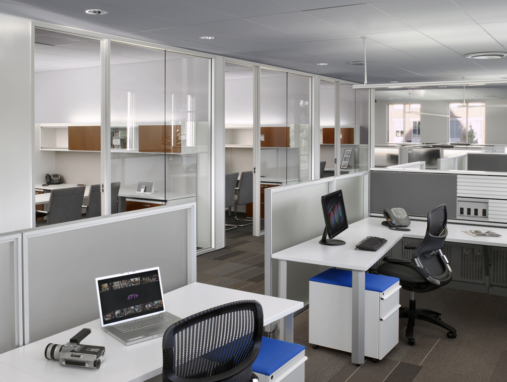 Furniture-integrated fluorescent fixtures are invisible in private offices, accentuating illuminated surfaces instead of visible hardware. In open offices, low partitions and nine-foot ceilings allowed fully indirect, glare-free lighting.