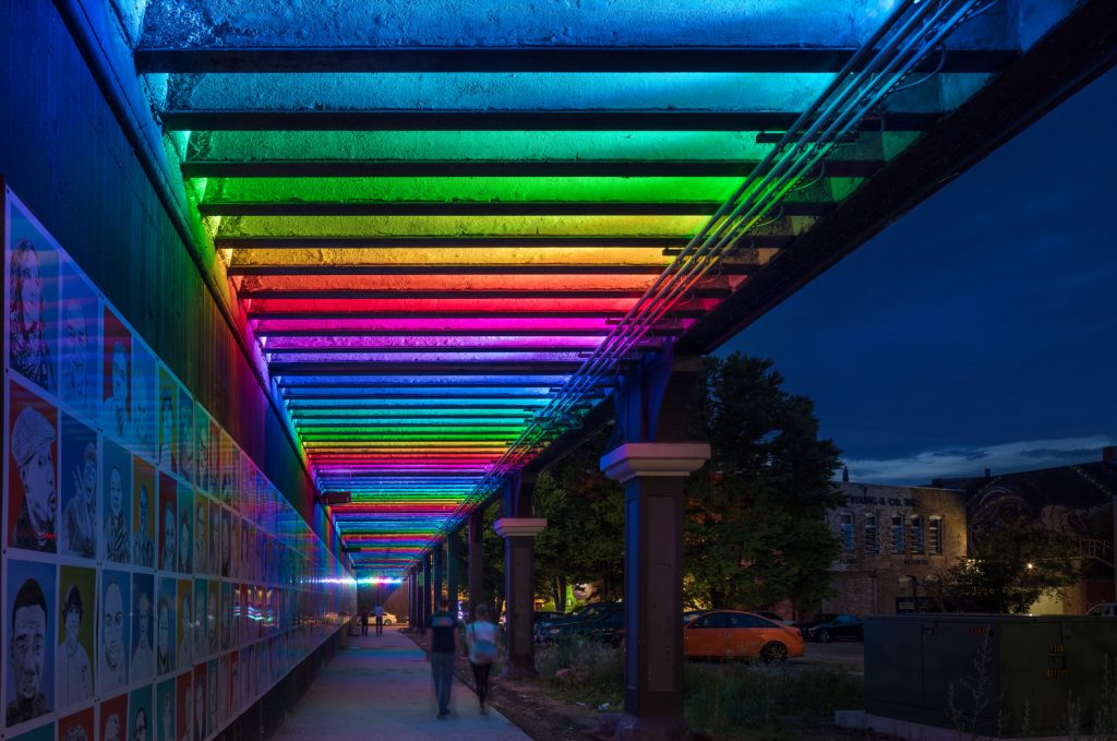 Beyond Walls is a group of business owners, residents and artists creating public art, seeking to revitalize Lynn, MA, and to offer improved wayfinding and a sense of security in the heart of the downtown area. Lam Partners teamed with Payette and Port Lighting to design dramatic and colorful underpass lighting, connecting Central Square and Washington Street, creating an inviting and appealing nighttime experience.