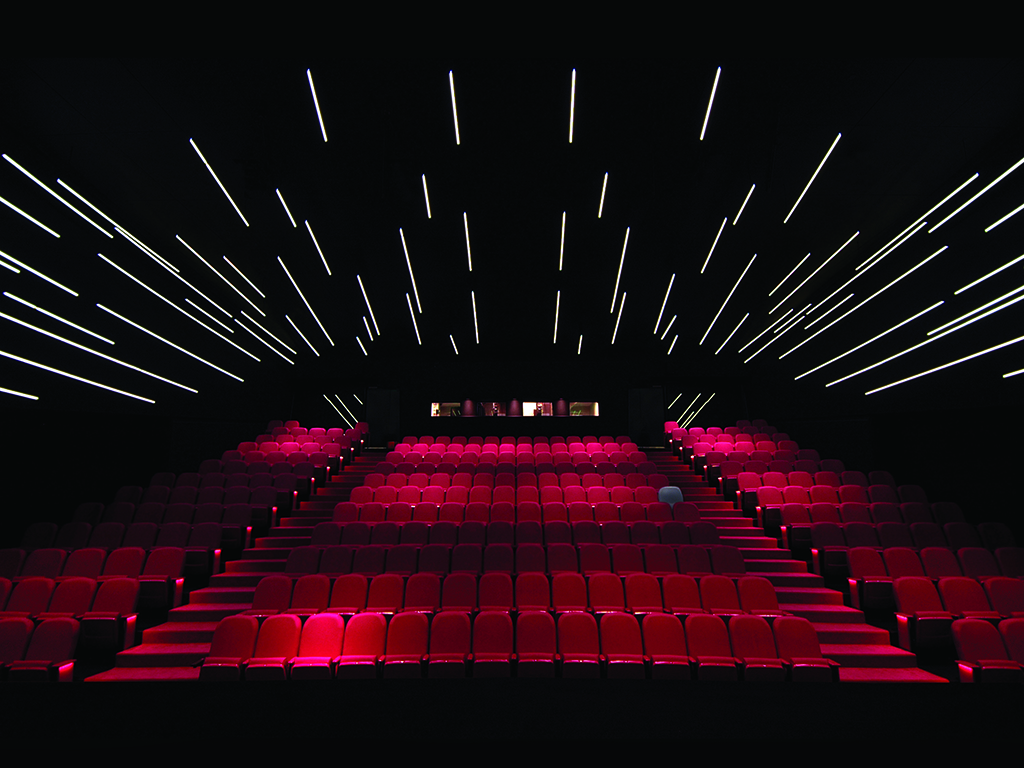 Foreshadowing the sense of movement of the theater’s LED strips, the procession of partially recessed side-pin fluorescent tubes organizes the lobby, with reflected images appearing in the glass and extending outdoors.