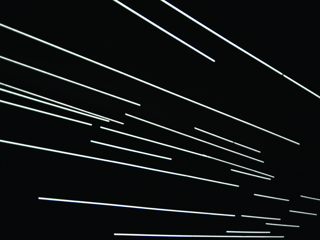 The Theater’s signature gesture employs white LEDs in diffuse acrylic rods, exploding in a randomized pattern from projector to screen. Twelve zones fade progressively from front to back as shows begin. The lights appear to fly unobstructed through space, hovering on finely detailed supports invisible against the background. The effect creates and shapes space within the black box, and gives tangible form to the transporting sensation of the movies.