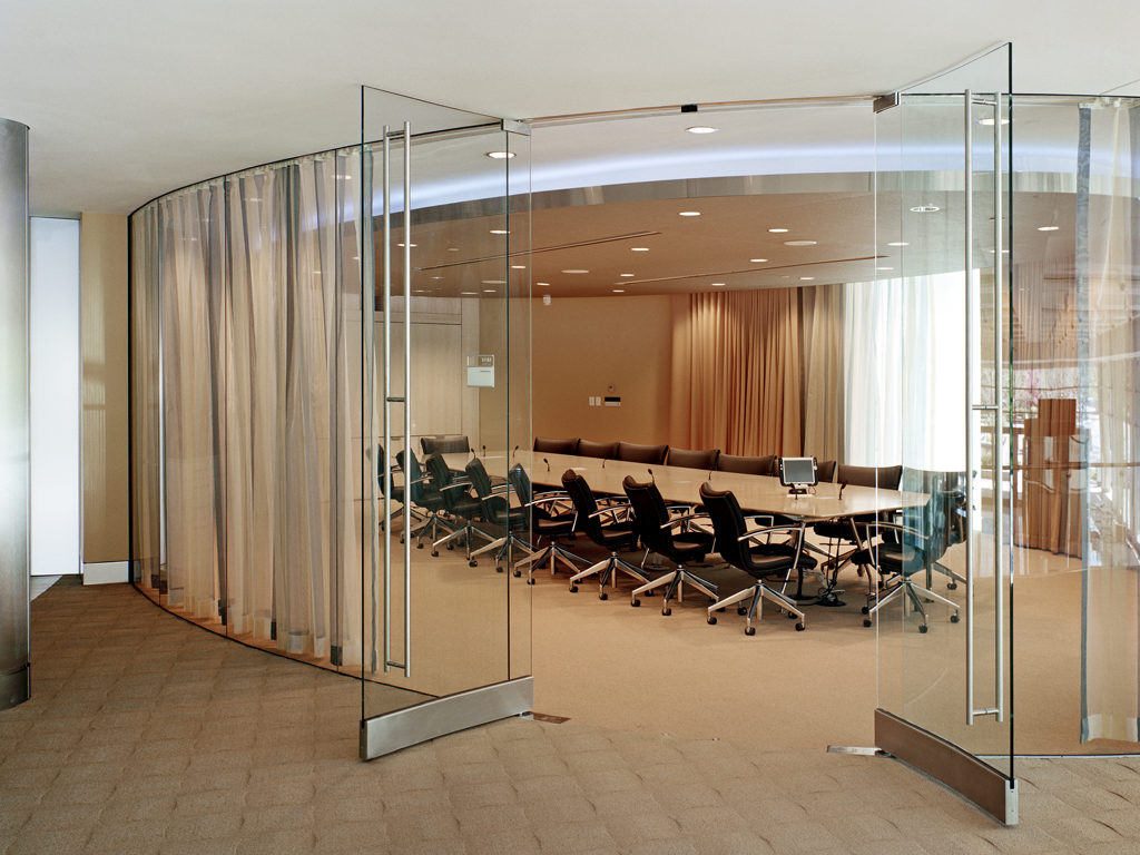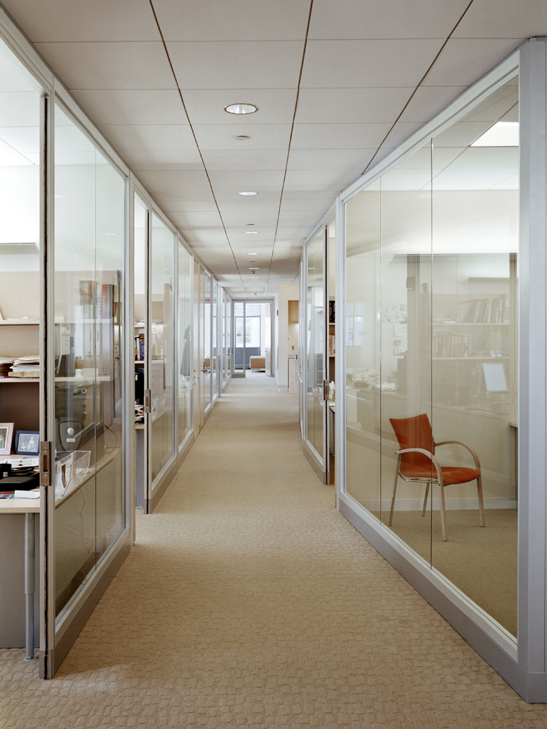 Continuous extruded T8 fixtures integrated into mullions cast even uplight along the sloped perimeter ceilings, and ingeniously double as light shelves during the day. The result is an array of illuminated bands that convey the building’s organization, as well as responding to the signature blue accent above.
