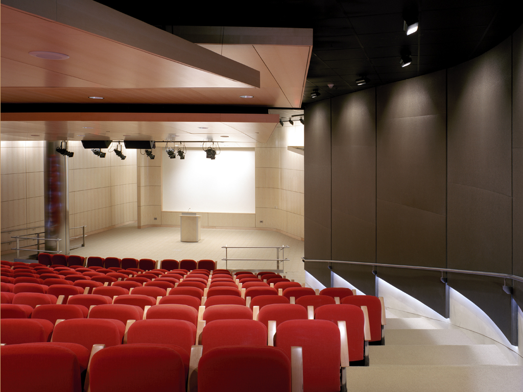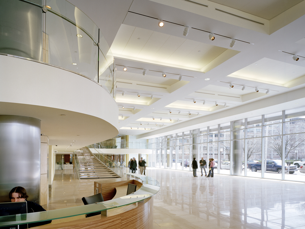 Community spaces and glass interior walls encourage lab and office collaboration. The tall entry lobby also serves as gallery space. A range of ambient, emergency, and flexible exhibit lighting fixtures are organized among coffered ceiling coves.