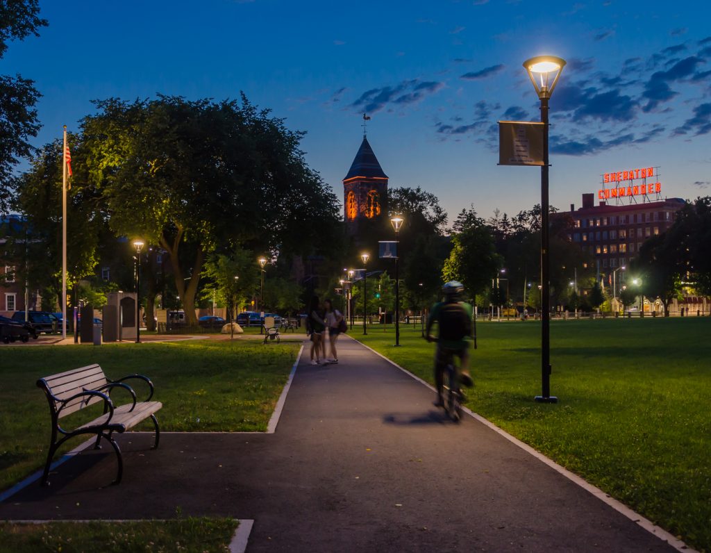 The renovation of Cambridge Common and Flagstaff Park included improvements to walkways and lighting and the realignment of a major path. Existing lighting was completely replaced, in accordance with a new design by Lam Partners. This included a comprehensive selection process of a new LED post-top fixture that became the standard for all parks in the City. Fixtures are controlled by wireless adaptive dimming controls that dim the lights late at night. In addition to lighting all the paths, new lighting was provided for the Civil War monument, revealing this landmark that had been lost from view after dark.