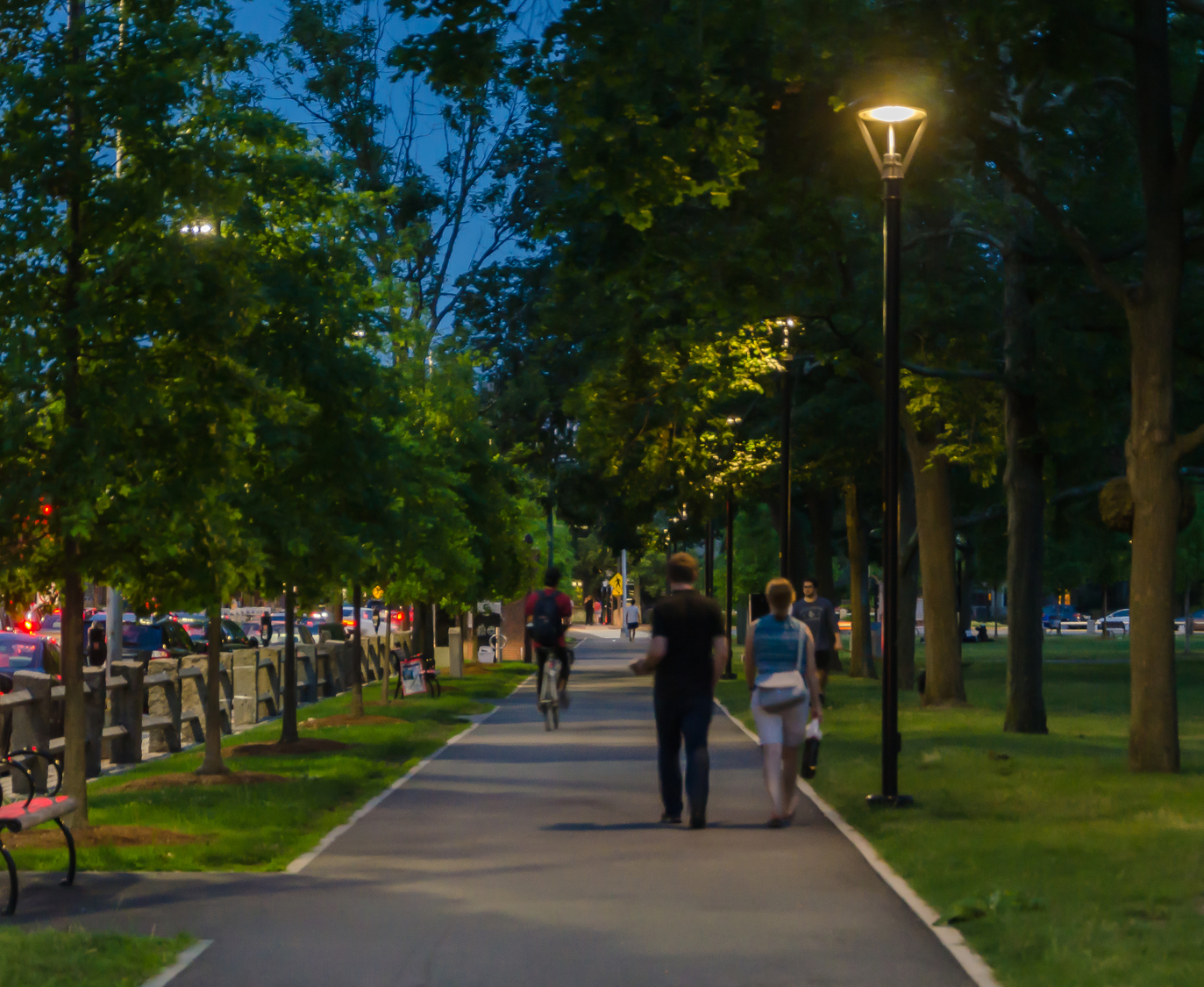 The renovation of Cambridge Common and Flagstaff Park included improvements to walkways and lighting and the realignment of a major path. Existing lighting was completely replaced, in accordance with a new design by Lam Partners. This included a comprehensive selection process of a new LED post-top fixture that became the standard for all parks in the City. Fixtures are controlled by wireless adaptive dimming controls that dim the lights late at night. In addition to lighting all the paths, new lighting was provided for the Civil War monument, revealing this landmark that had been lost from view after dark.