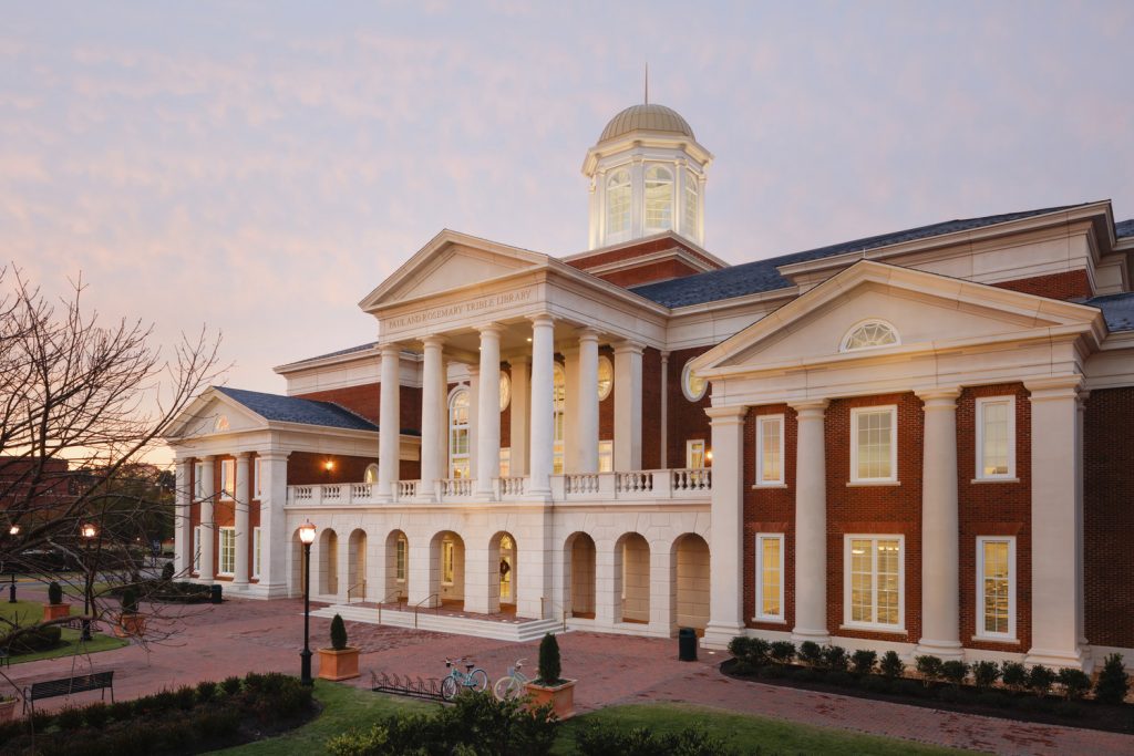 The classically designed Trible Library at Christopher Newport University is a significant extension of the existing library, with academic spaces, student services, and an expansive, two-story reading room. The main open space is overlooked by balcony study spaces, and capped with an intricate ceiling inset with laylights at each end. In the center of the structure and over the center bay of the reading room is the new cupola, which is uplit from the center to give it some monumental presence from the inside and outside. The custom, 3-tiered chandeliers compliment the decorative bowl- and candelabra-style pendants and sconces through the building, while the reading lamps bring the scale down and create that ‘library feel’.