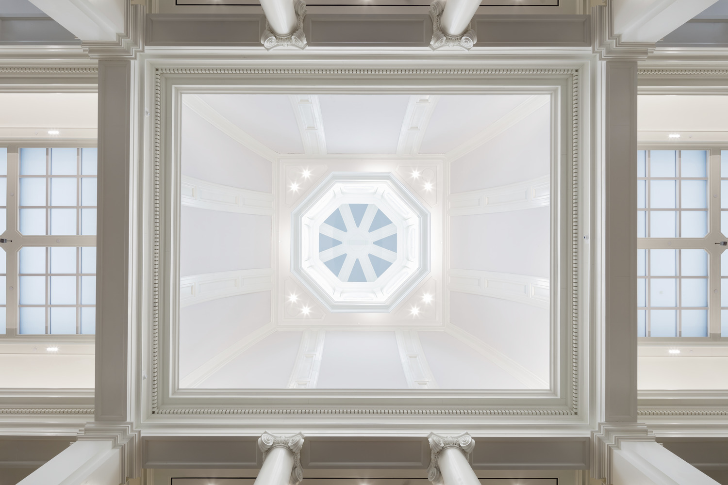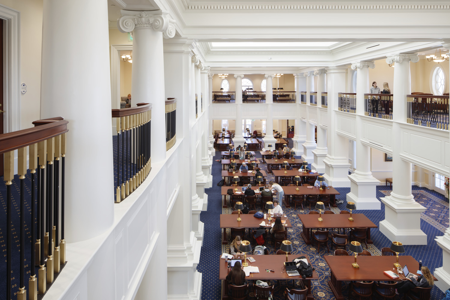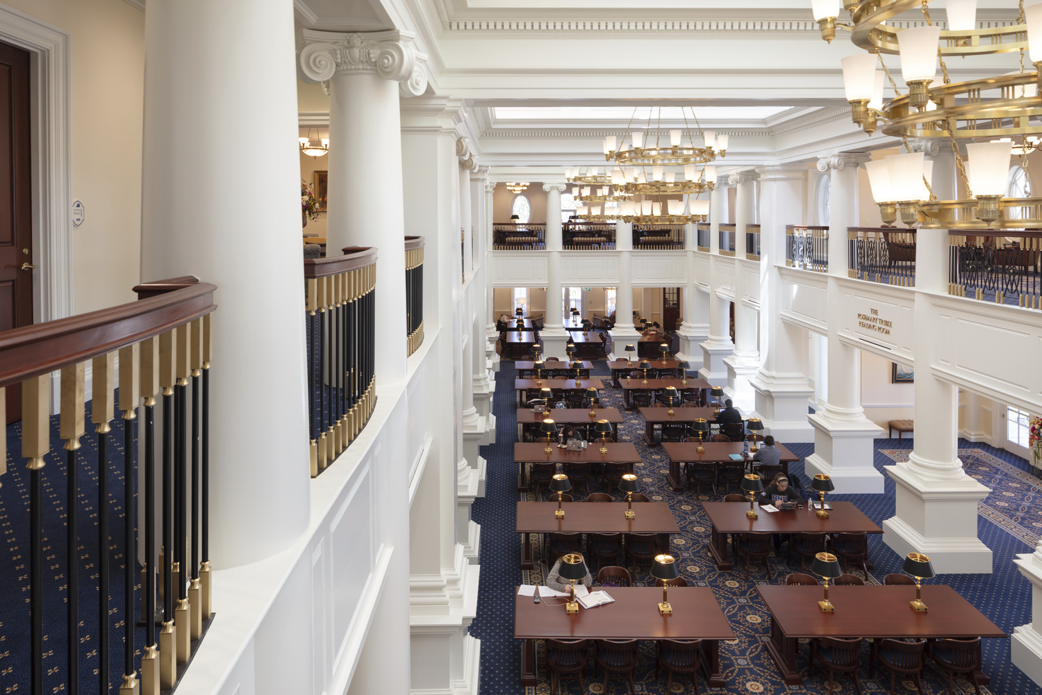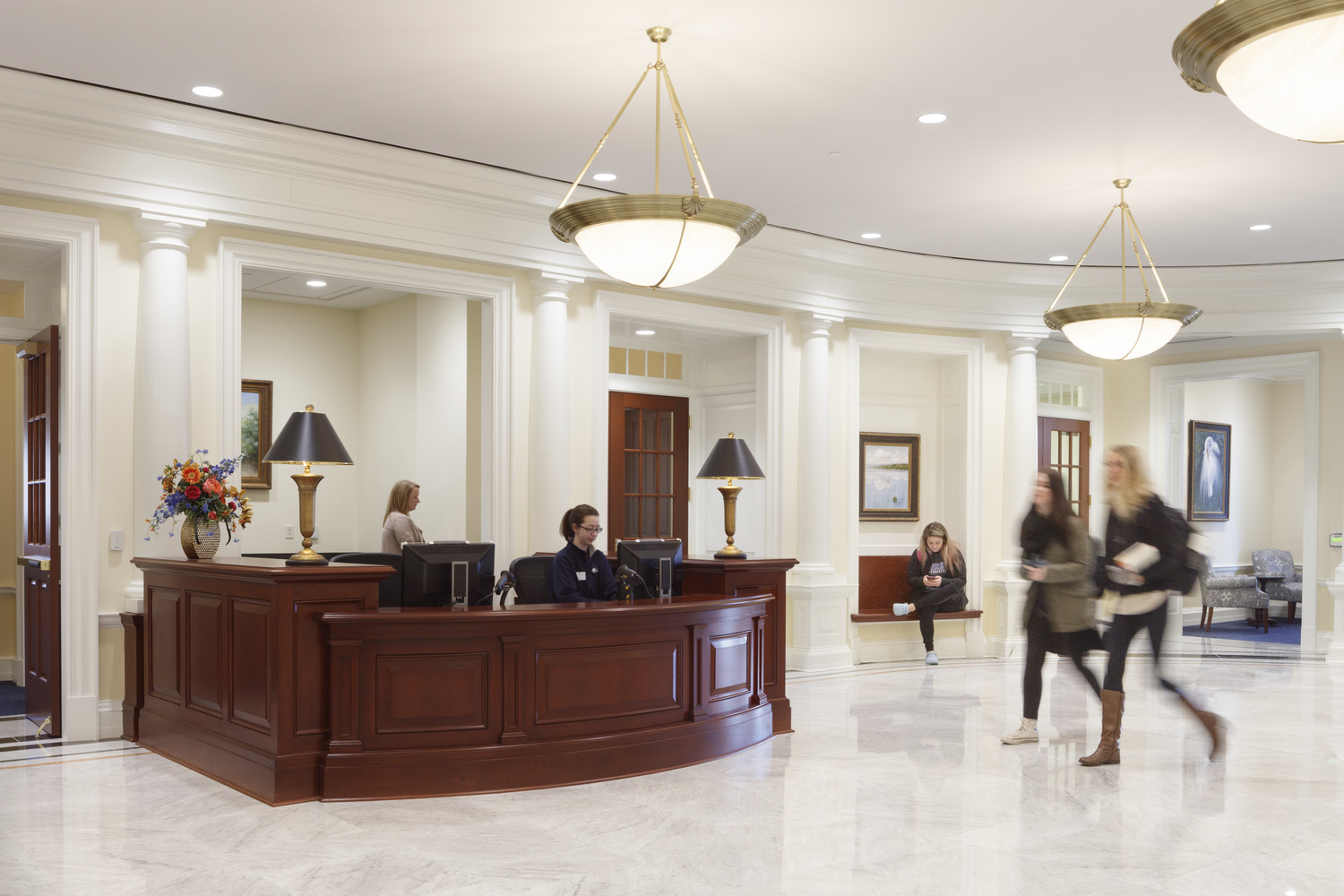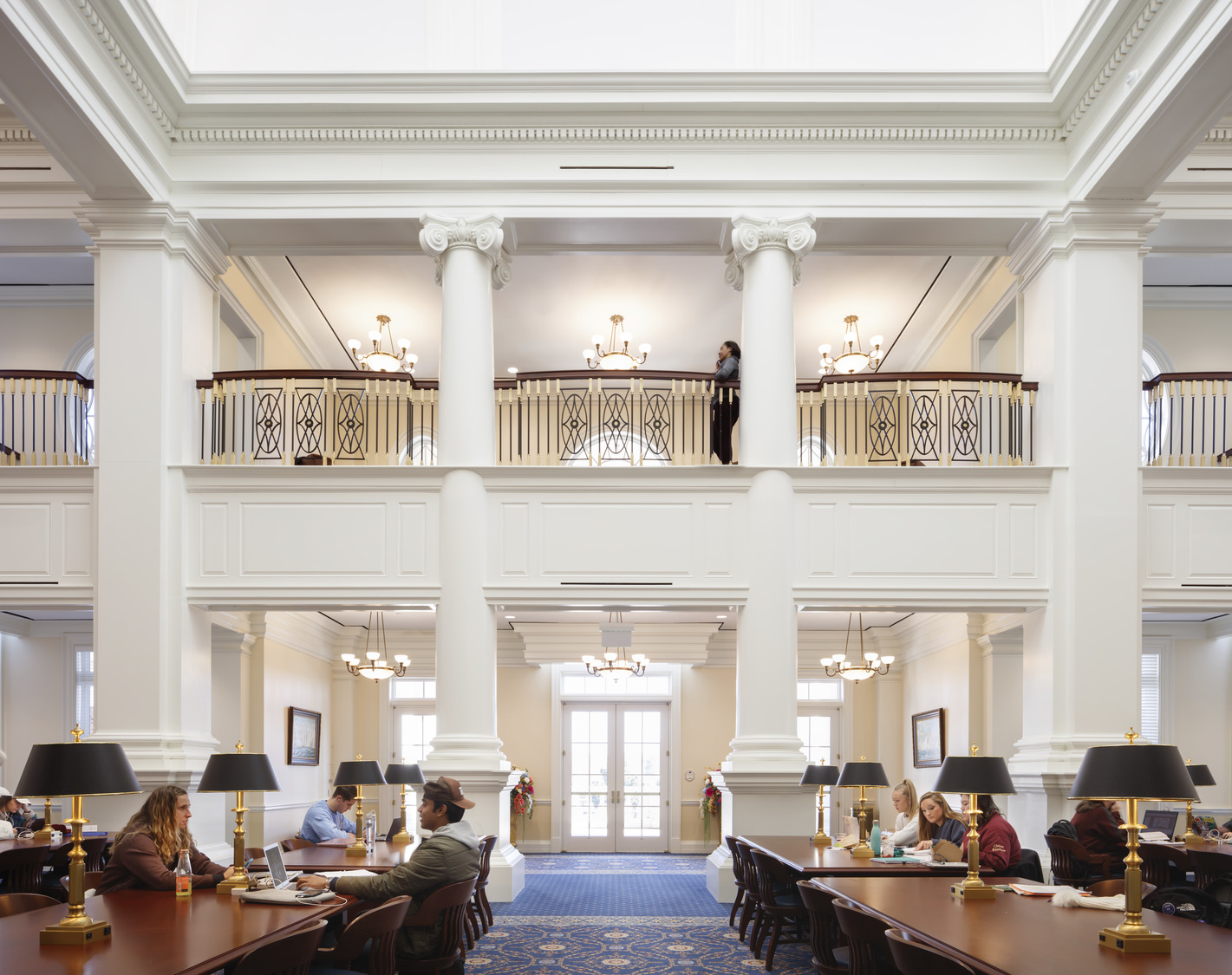 The classically designed Trible Library at Christopher Newport University is a significant extension of the existing library, with academic spaces, student services, and an expansive, two-story reading room. The main open space is overlooked by balcony study spaces, and capped with an intricate ceiling inset with laylights at each end. In the center of the structure and over the center bay of the reading room is the new cupola, which is uplit from the center to give it some monumental presence from the inside and outside. The custom, 3-tiered chandeliers compliment the decorative bowl- and candelabra-style pendants and sconces through the building, while the reading lamps bring the scale down and create that ‘library feel’.