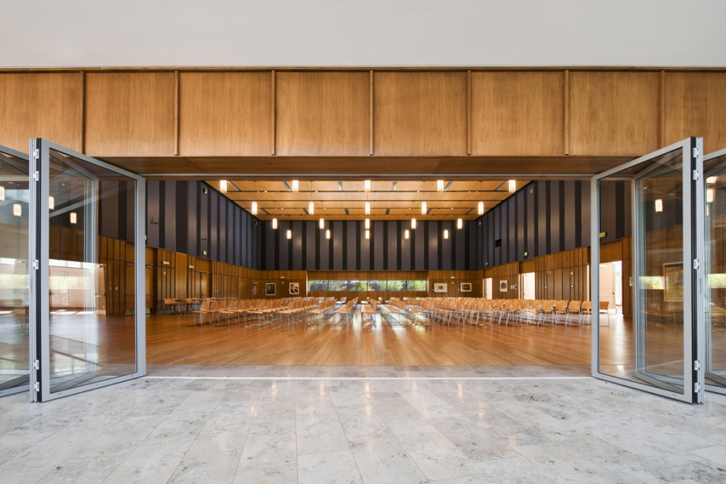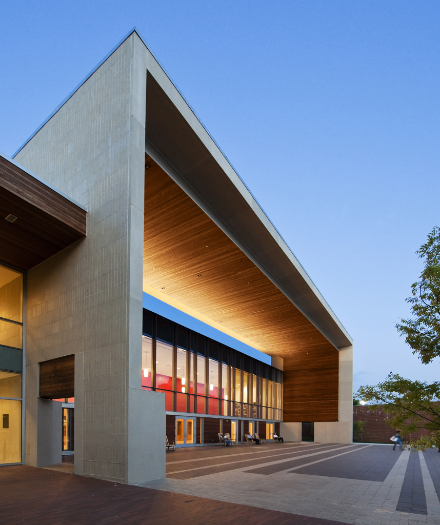High-performance asymmetric floodlights, concealed at the civic building’s roof and base, boldly animate the wood-lined arch to announce the great hall entry. Recessed wallwashers highlight orange interior walls and opal fluorescent pendants adorn the prefunction space.