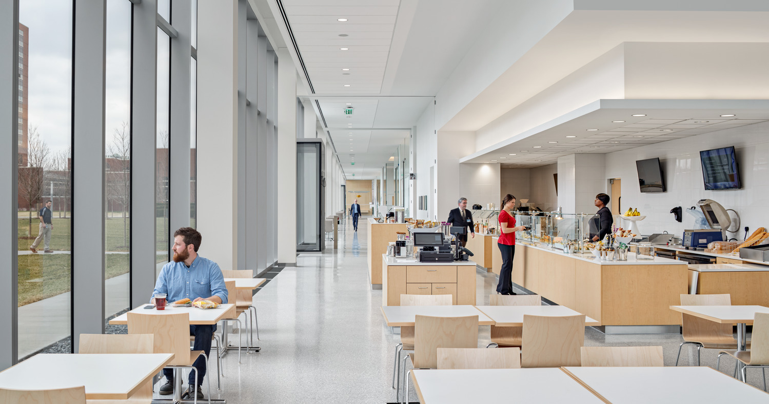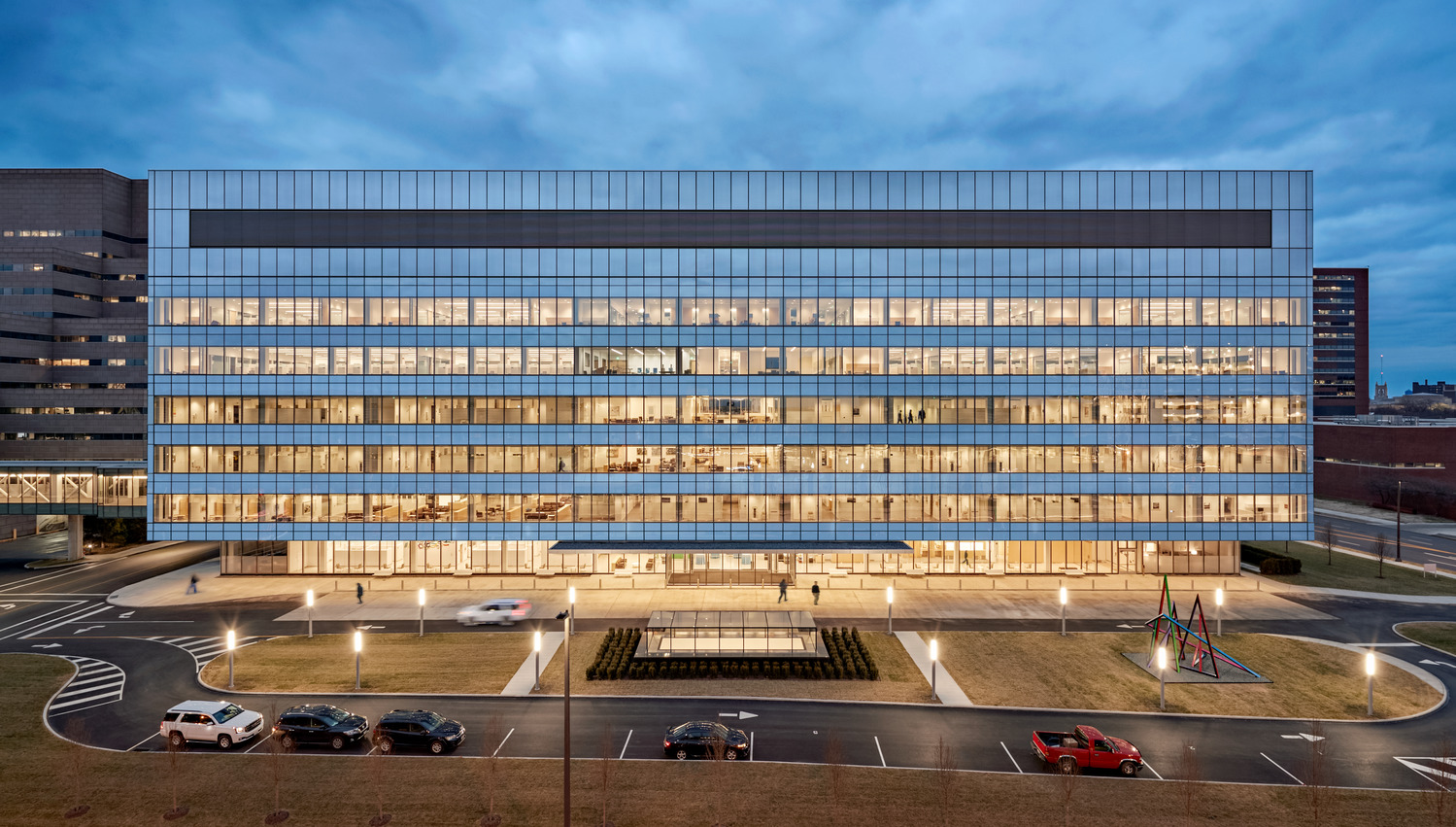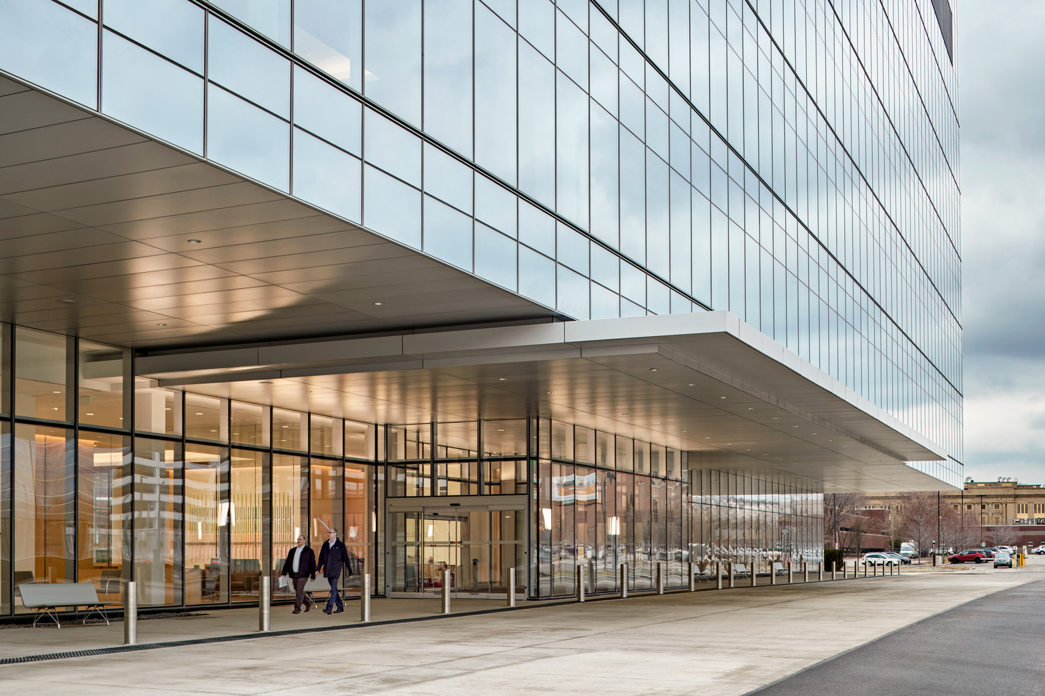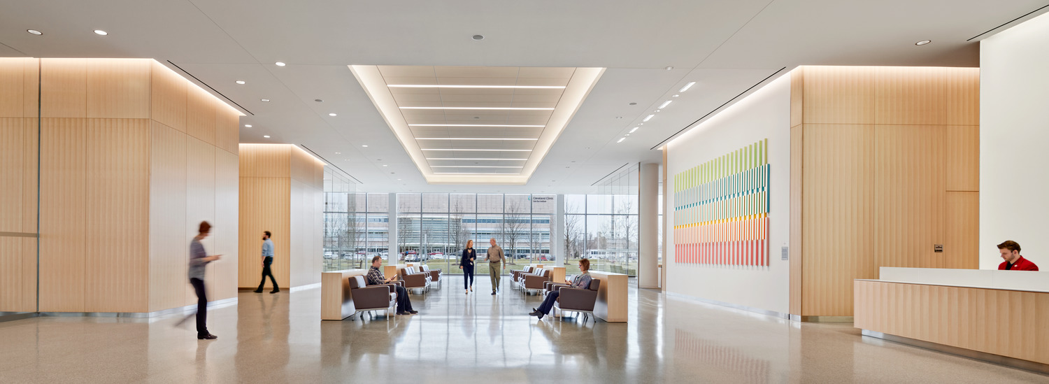Bringing together patient treatment programs into one centralized location, the 377,000-square- foot Cleveland Clinic Cancer Building includes 126 exam rooms, 98 infusion bays, six linear accelerators, seven procedure rooms, and a Gamma Knife room. The prominent, cantilevered glass façade and extensive use of glass on the north and south façades fill the building with daylight, while a series of direct and indirect lighting is used in patient rooms and treatment areas to promote comfort.