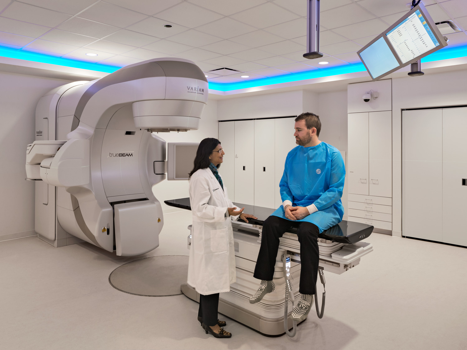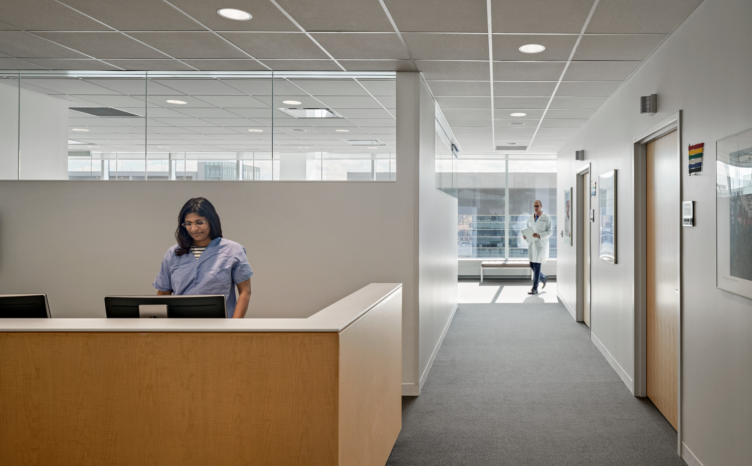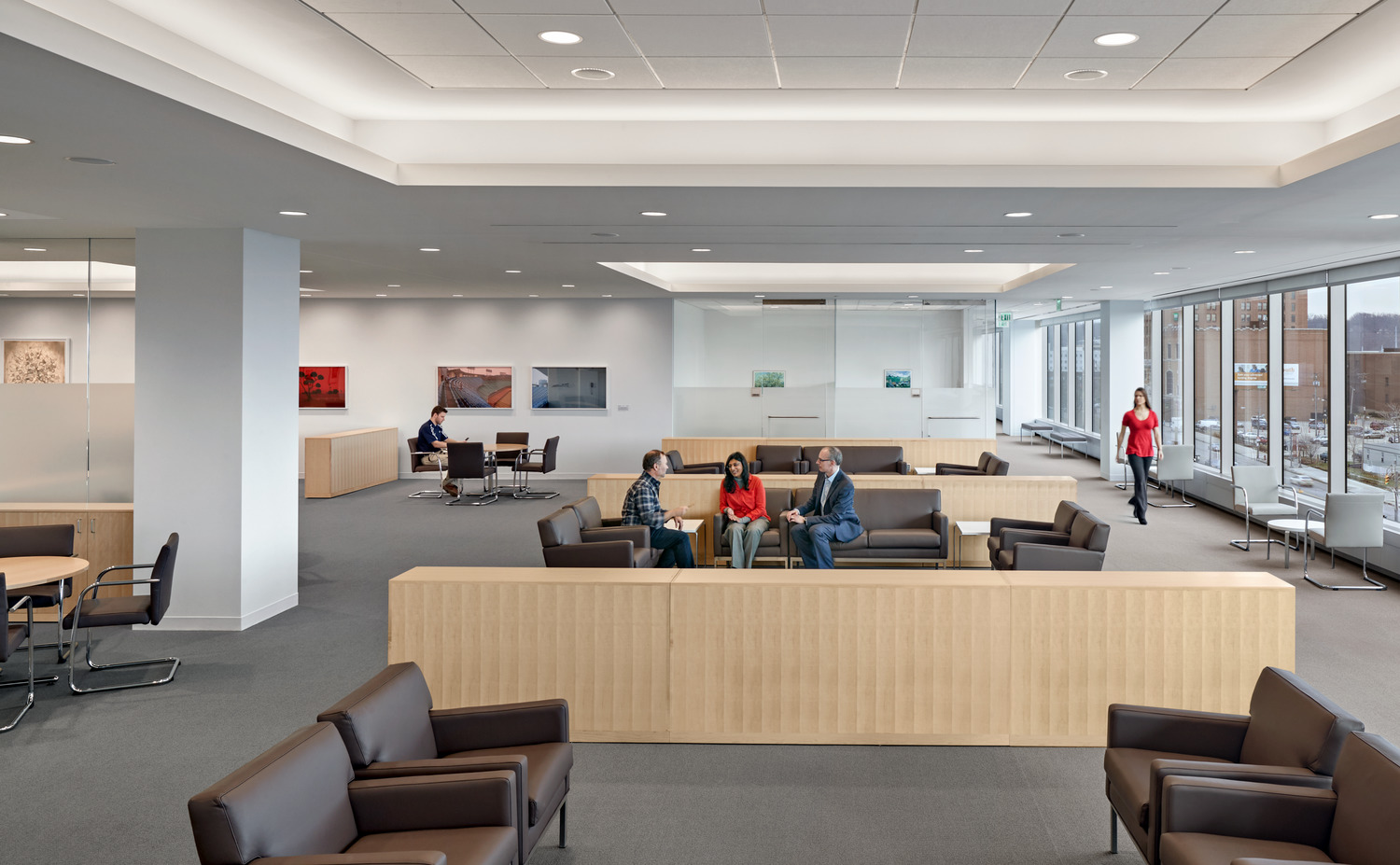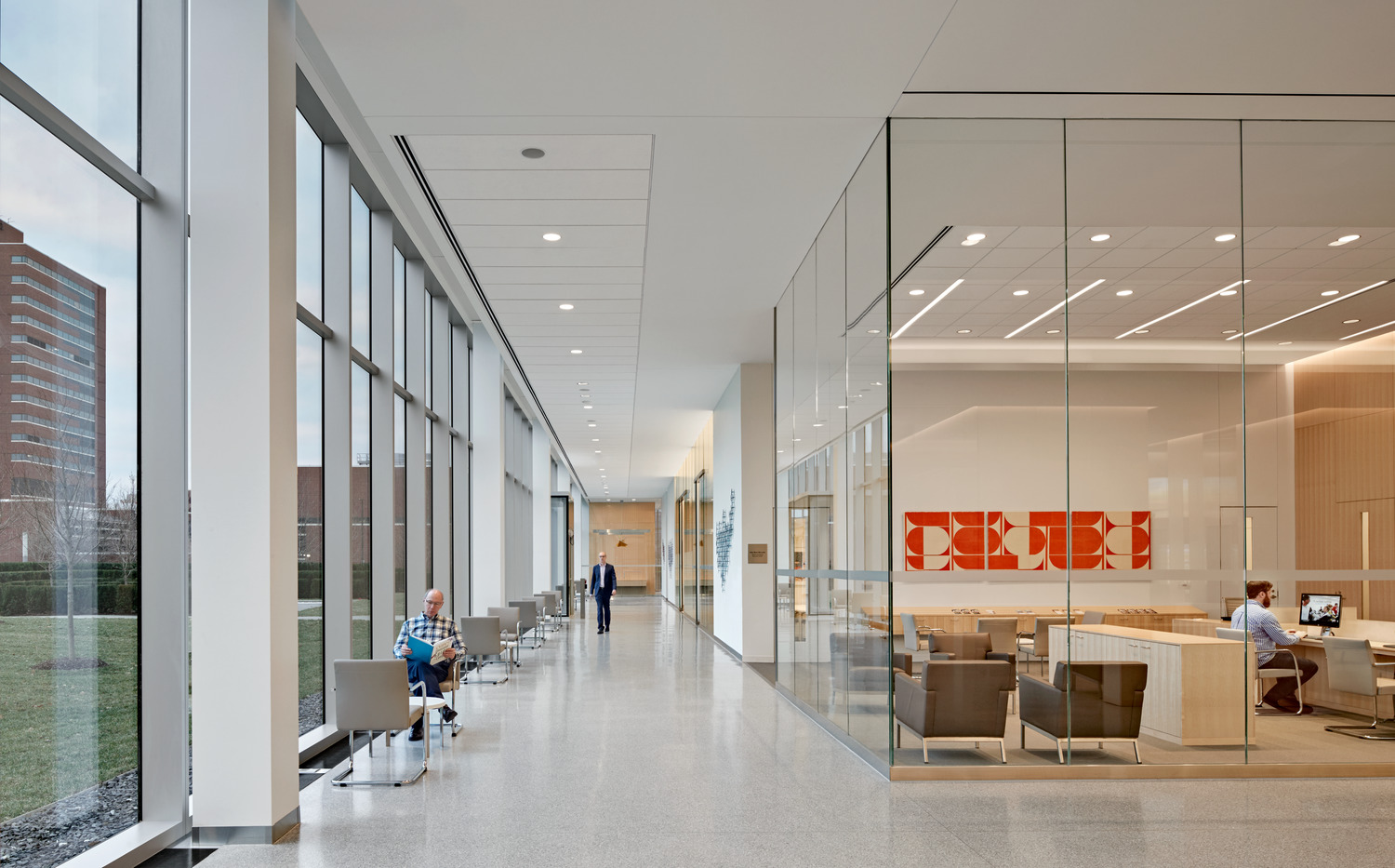Bringing together patient treatment programs into one centralized location, the 377,000-square- foot Cleveland Clinic Cancer Building includes 126 exam rooms, 98 infusion bays, six linear accelerators, seven procedure rooms, and a Gamma Knife room. The prominent, cantilevered glass façade and extensive use of glass on the north and south façades fill the building with daylight, while a series of direct and indirect lighting is used in patient rooms and treatment areas to promote comfort.