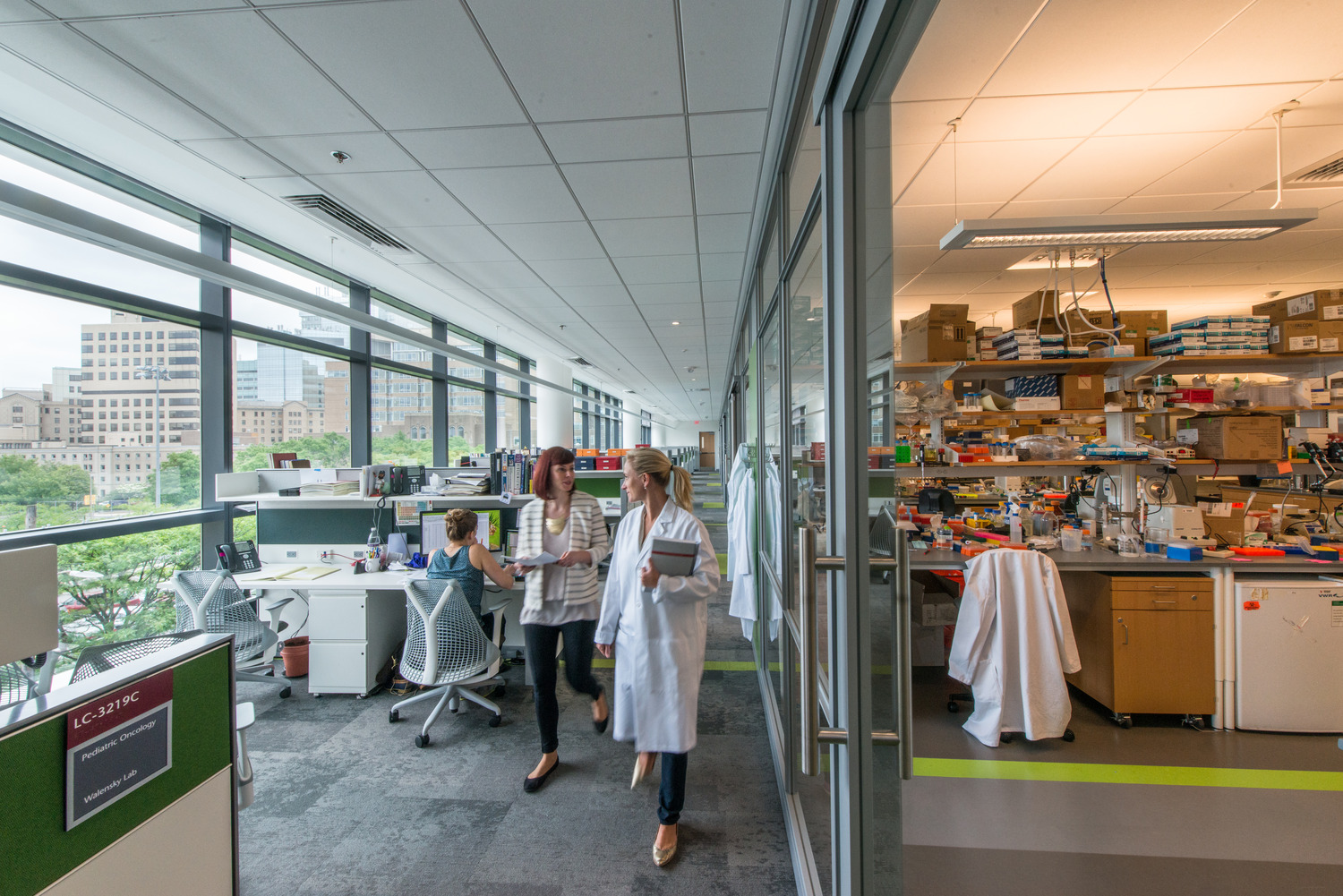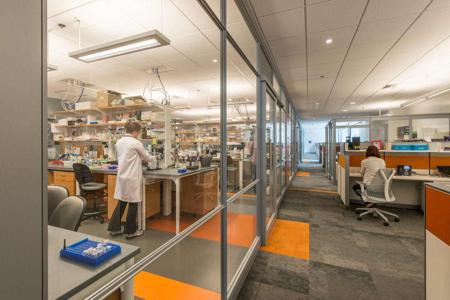To address continued growth in research, the Dana Farber Cancer Institute leased approximately 155,000 square feet of wet lab space within a new research building, which now serves as DFCI’s new home for basic research. Through the use of novel approaches to laboratory design and program clustering, the new facility facilitates collaboration, encourages new research directions, and enhances the performance of high-impact research.