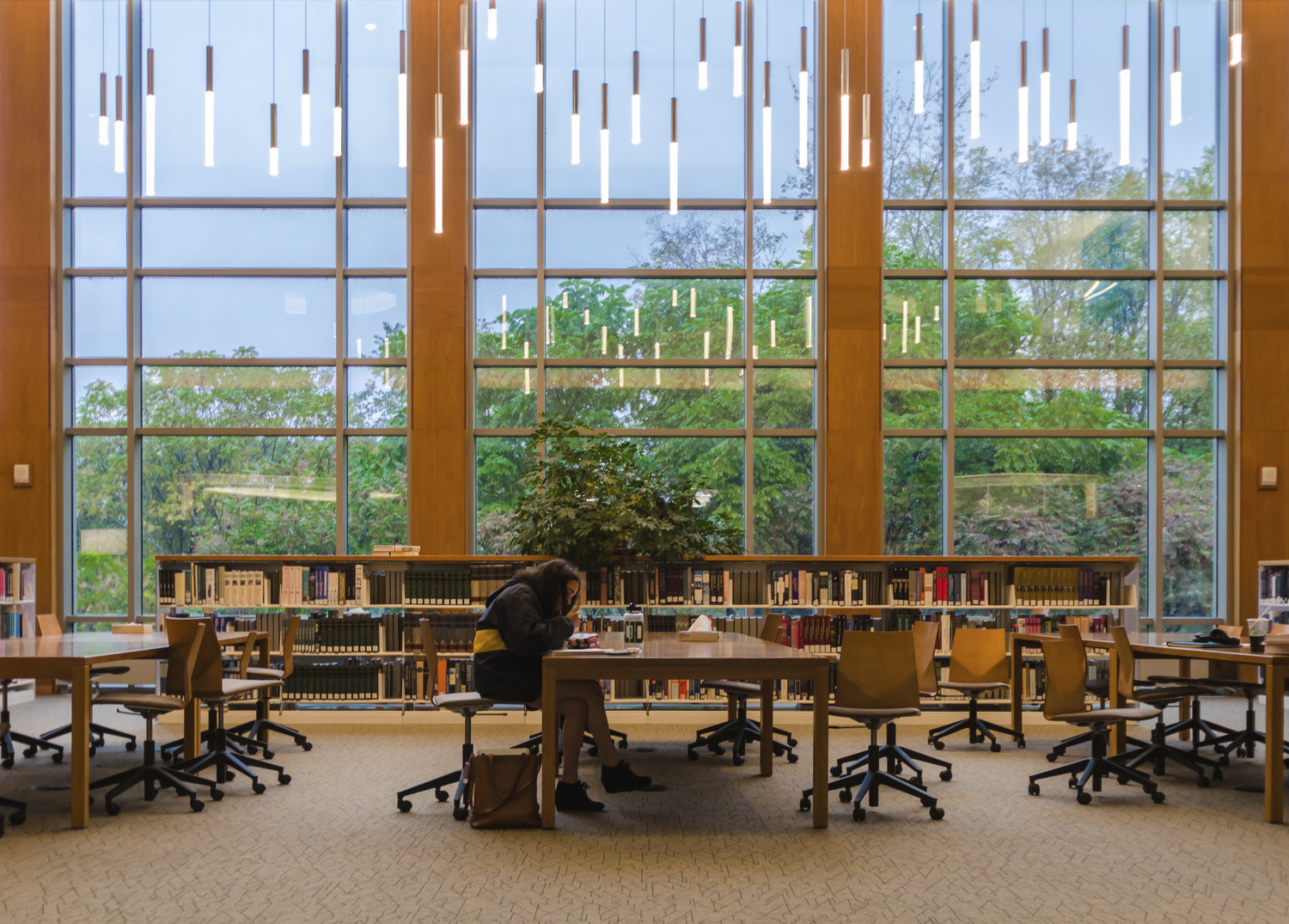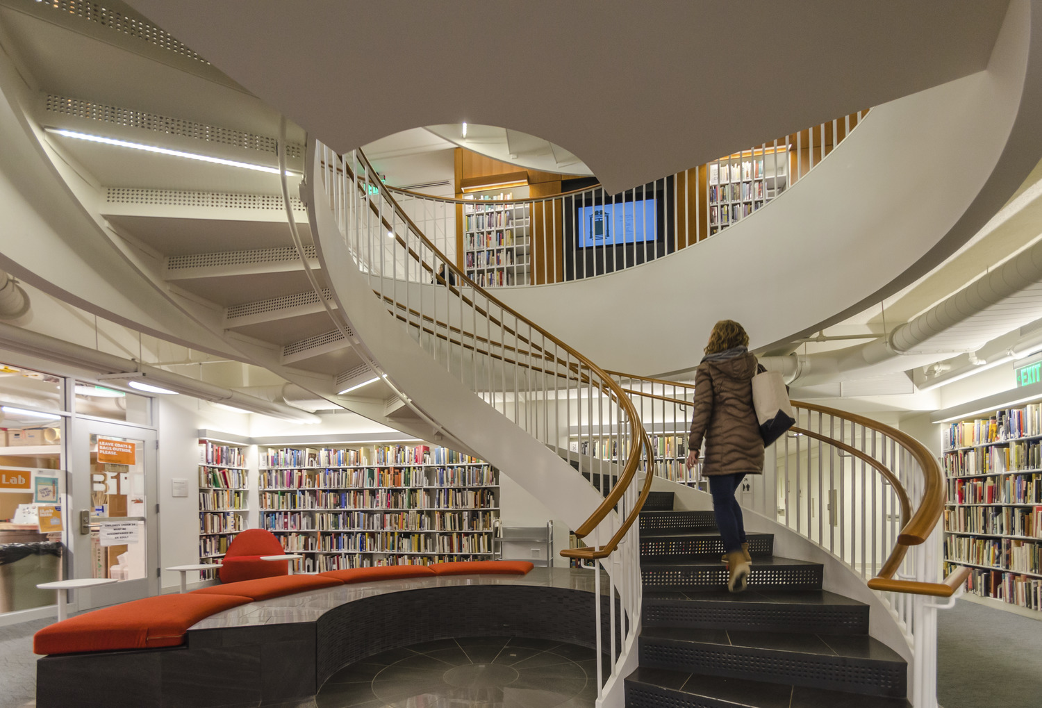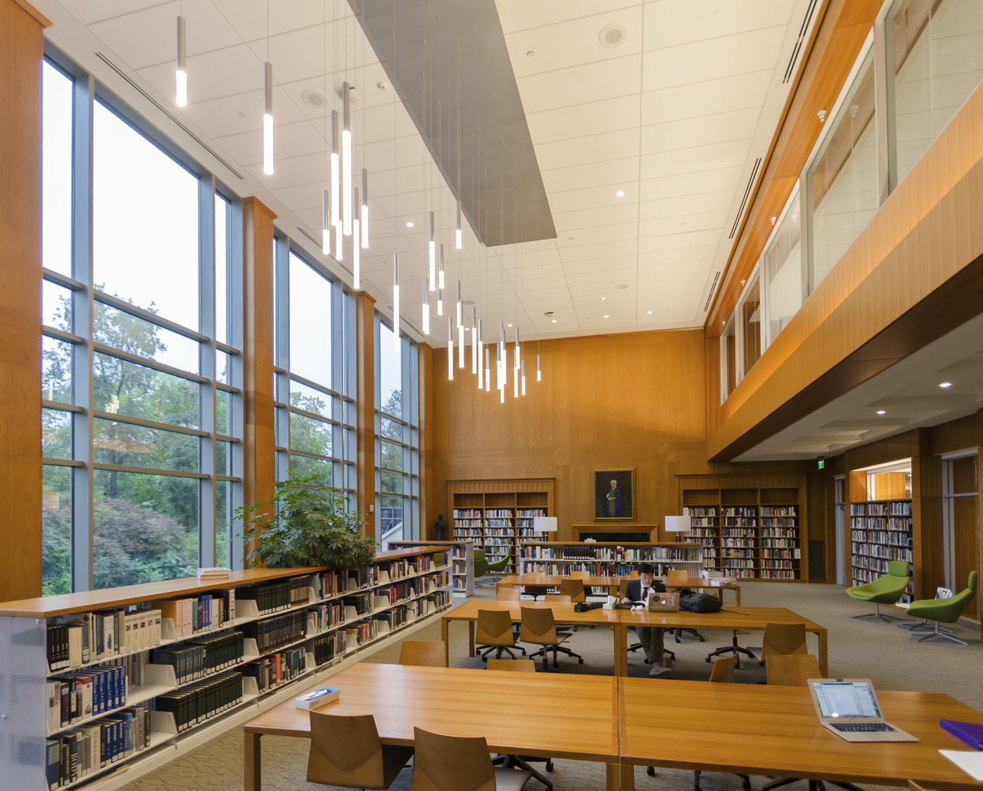The existing Boyden Library on the Deerfield Academy campus was completely renovated and reimagined as an academic hub. Innovation space for technology and working areas for a hands-on approach were added, updating and transforming the space in a dynamic way. The peaceful library atmosphere is preserved in quiet havens for reading and study and in the book stacks.
