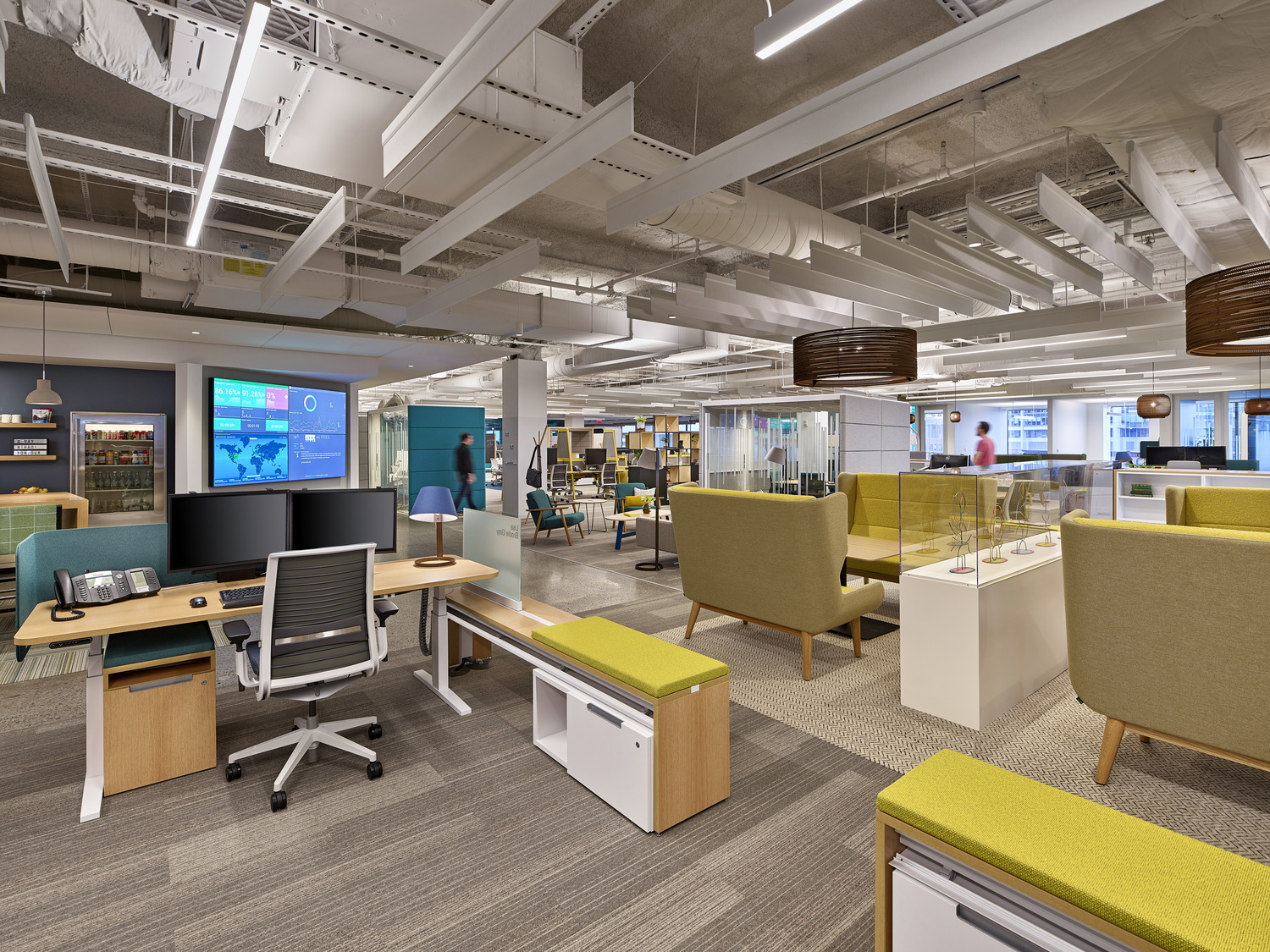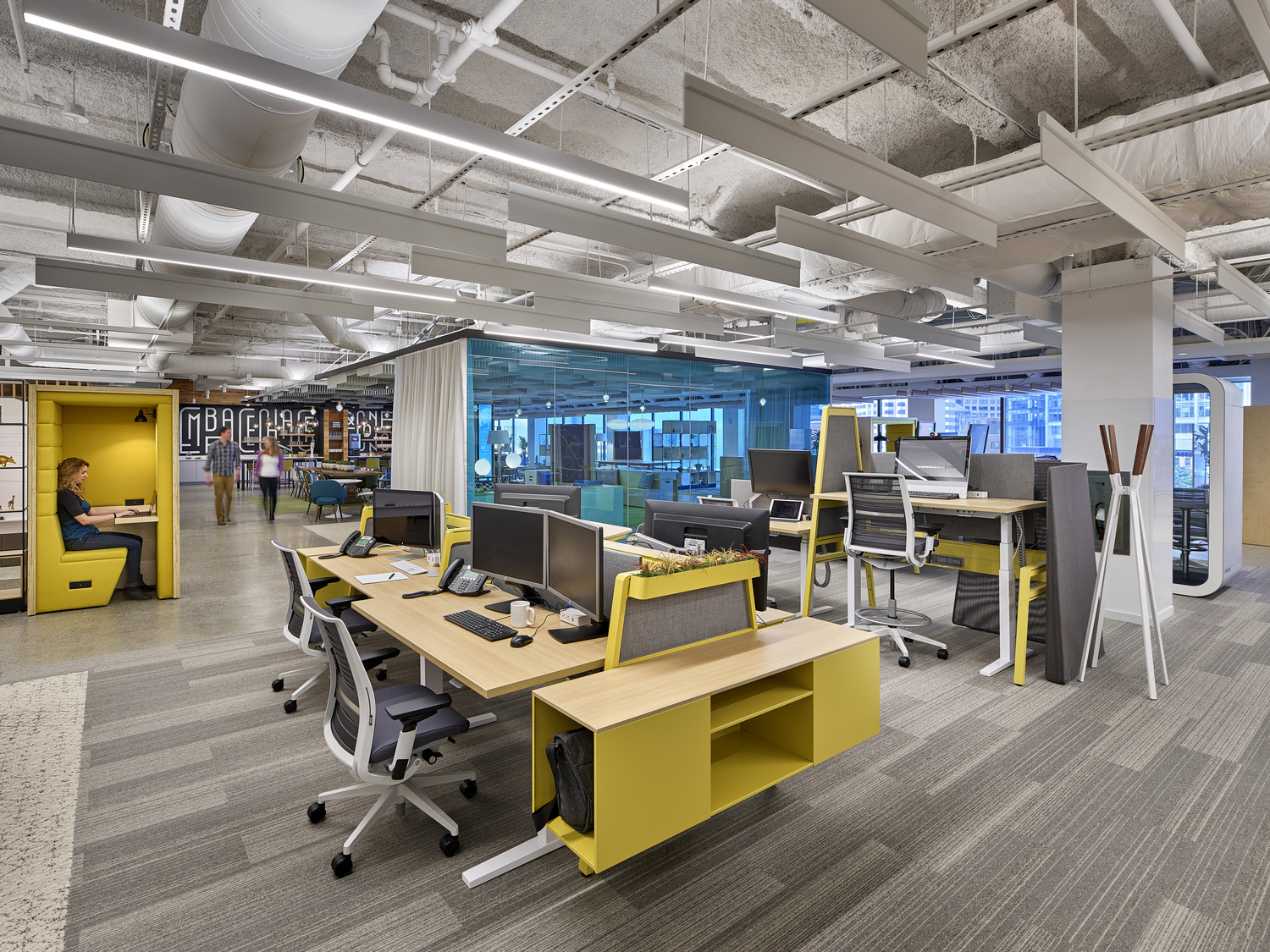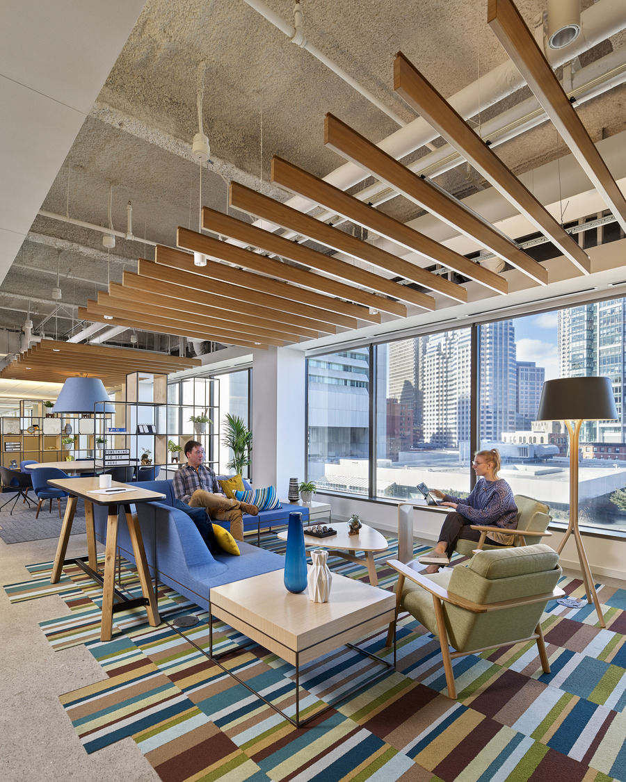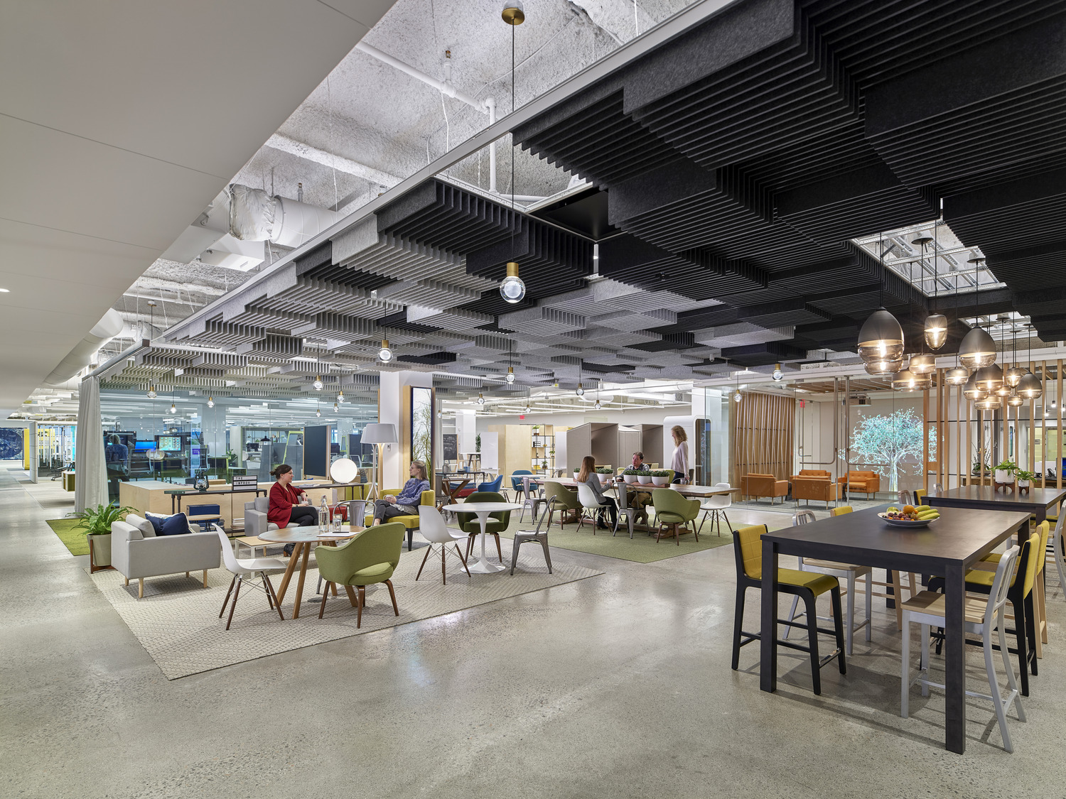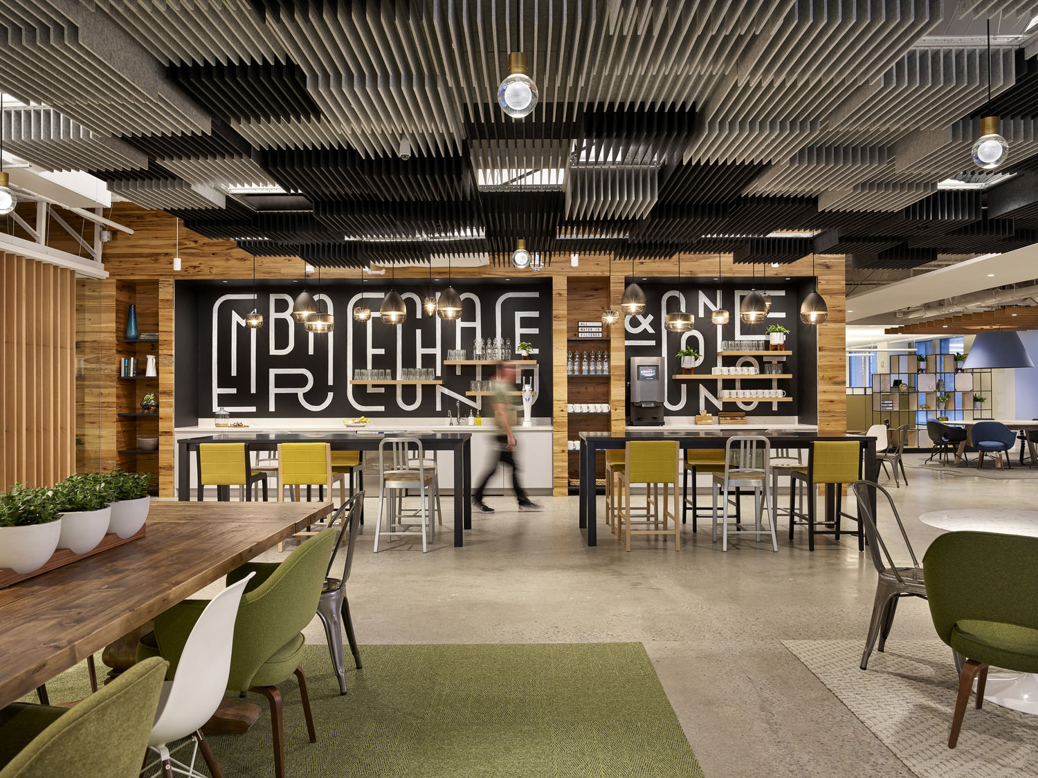 Not wanting to create your typical corporate financial office space, this global investment firm opted for a fun, collaborative, and comfortable work environment for the renovation of its executive office suite. Lighting effects and decorative ceiling systems were used to define various open plan “neighborhoods.” Uplights were used to create brighter ceiling plane to encourage collaboration, while other areas were primarily downlighted to promote quieter contemplative space.