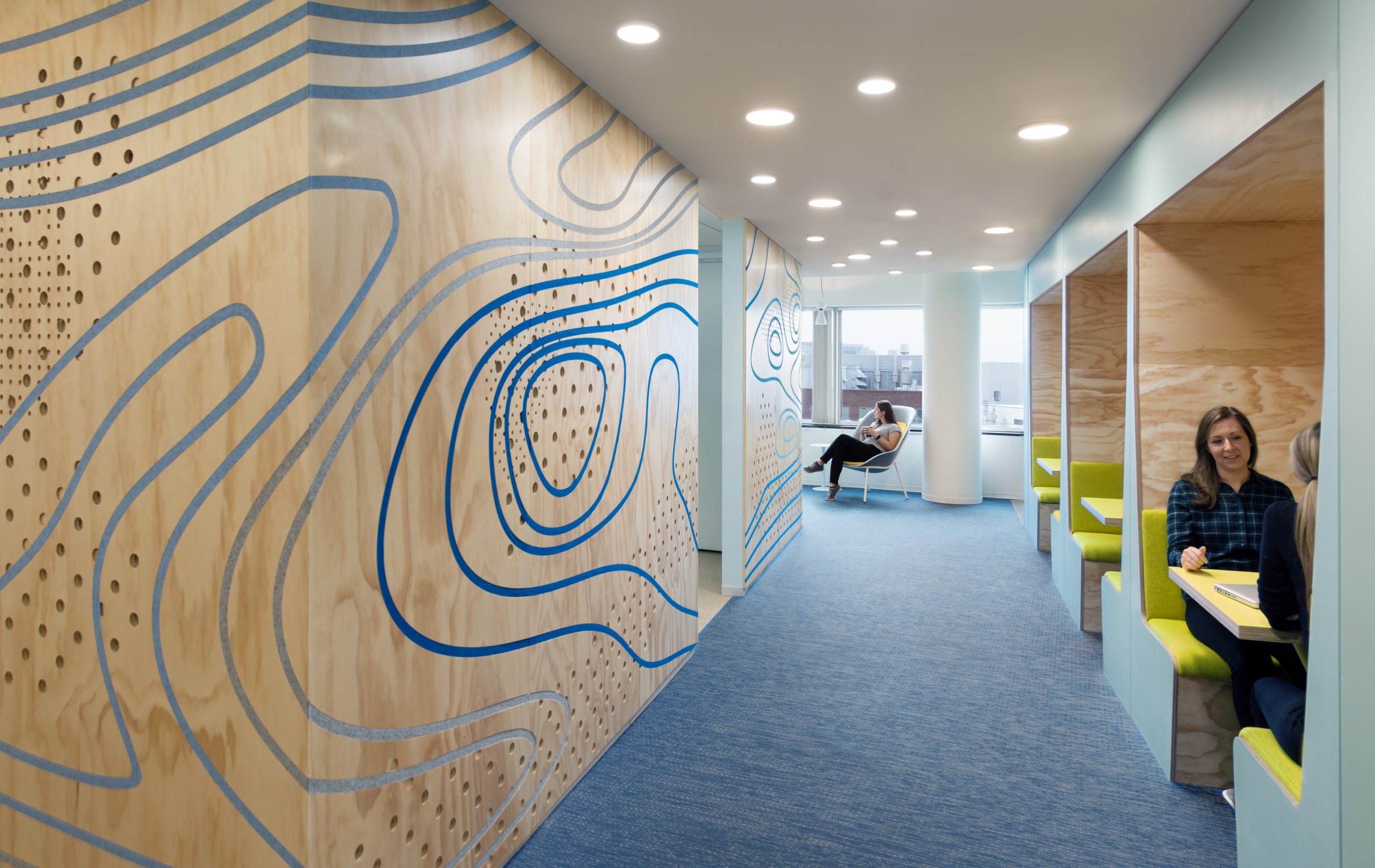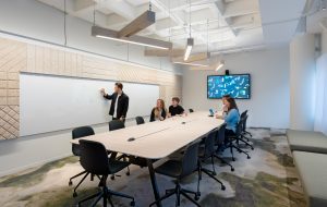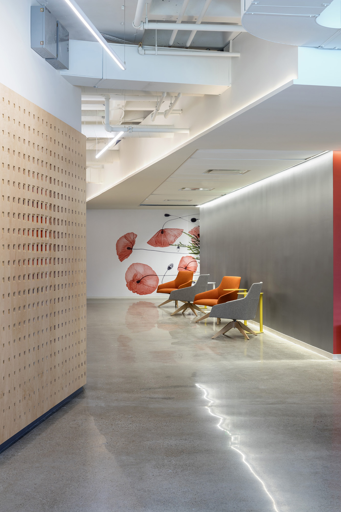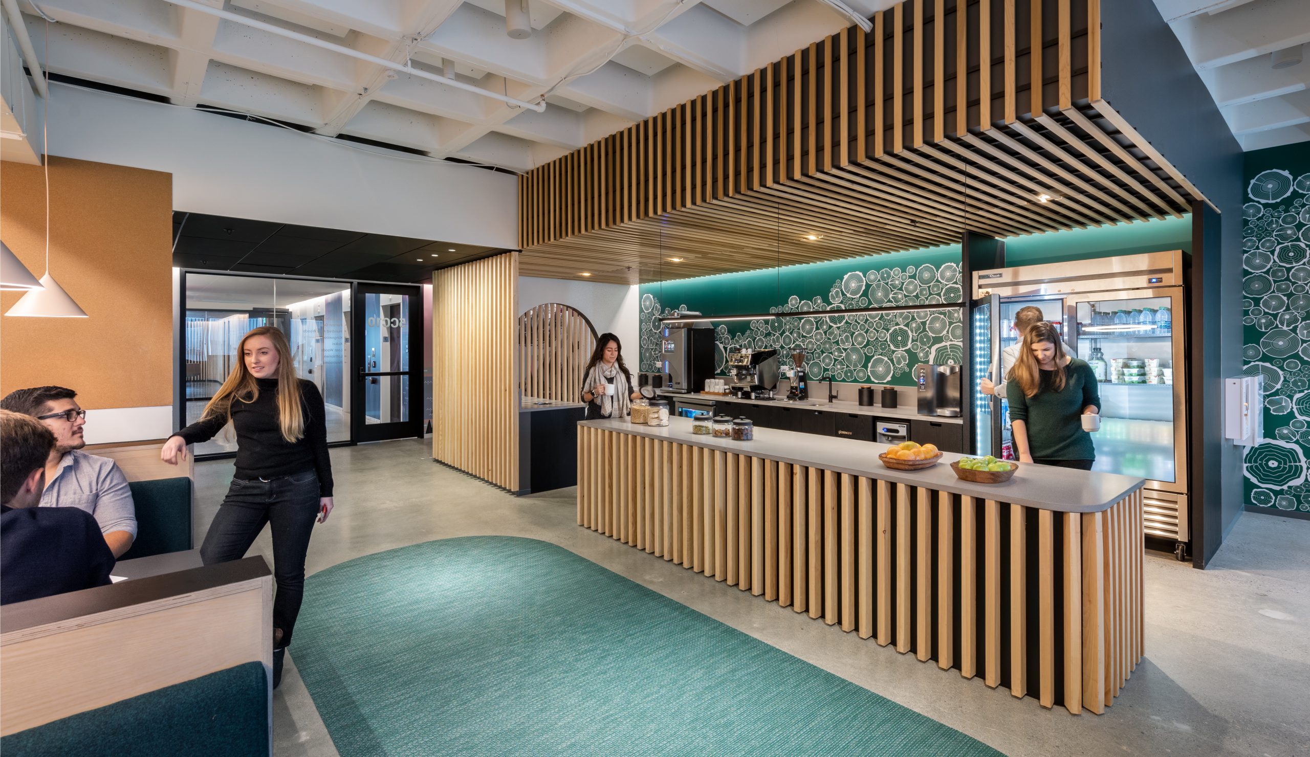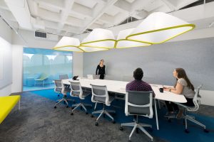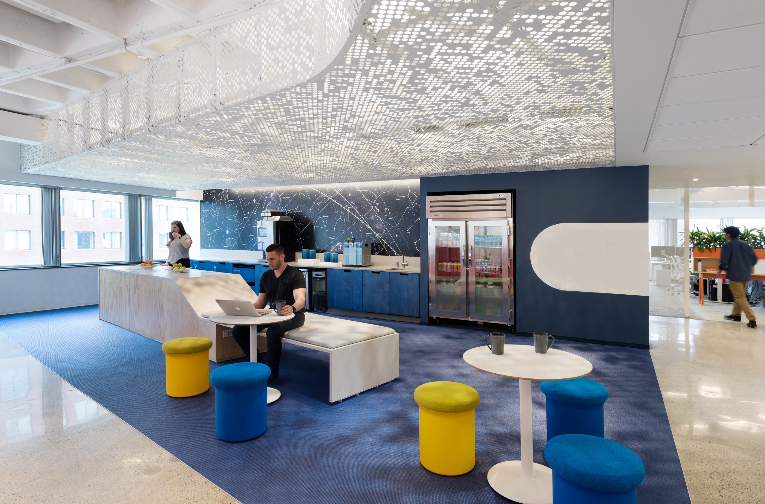 This international tech firm has undertaken a significant expansion of its Kendall Square offices in the Cambridge Center Complex. This expansion includes two full floors, totaling approximately 30,000 square feet, providing new workspaces, meeting rooms, and eateries to make the workplace feel more like home. Funky pendants offset illuminated walls, which display supple textures, graphics, and colors. Open office areas are filled with sunlight, accentuated with a herringbone pattern of visually appealing pendants, and a brightly lit core to balance the daylight. The design creates a kinetic and energetic, yet cohesive workplace, within a comfortable luminous environment.