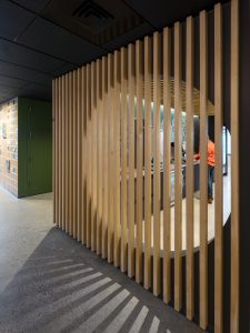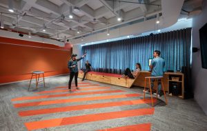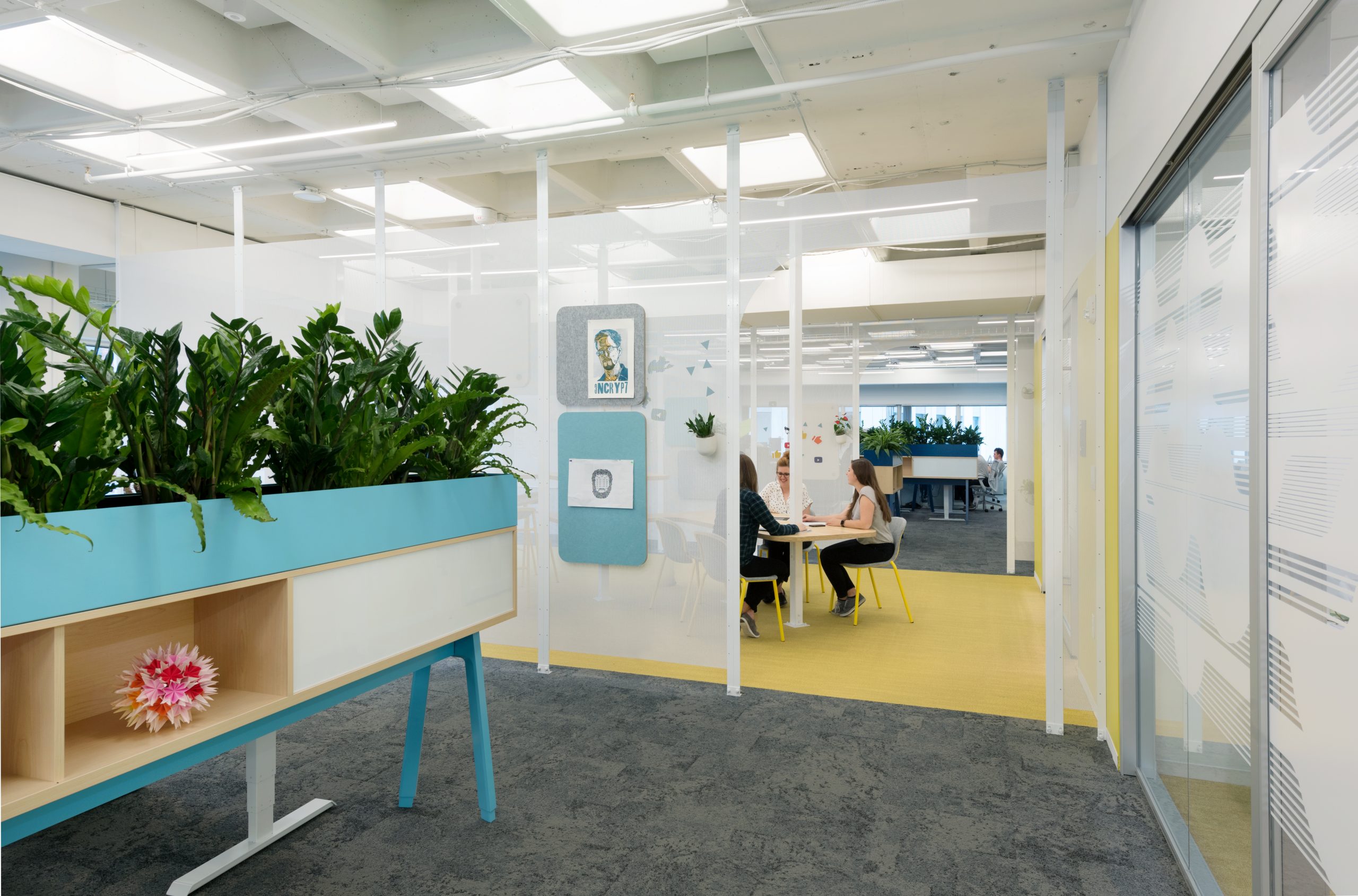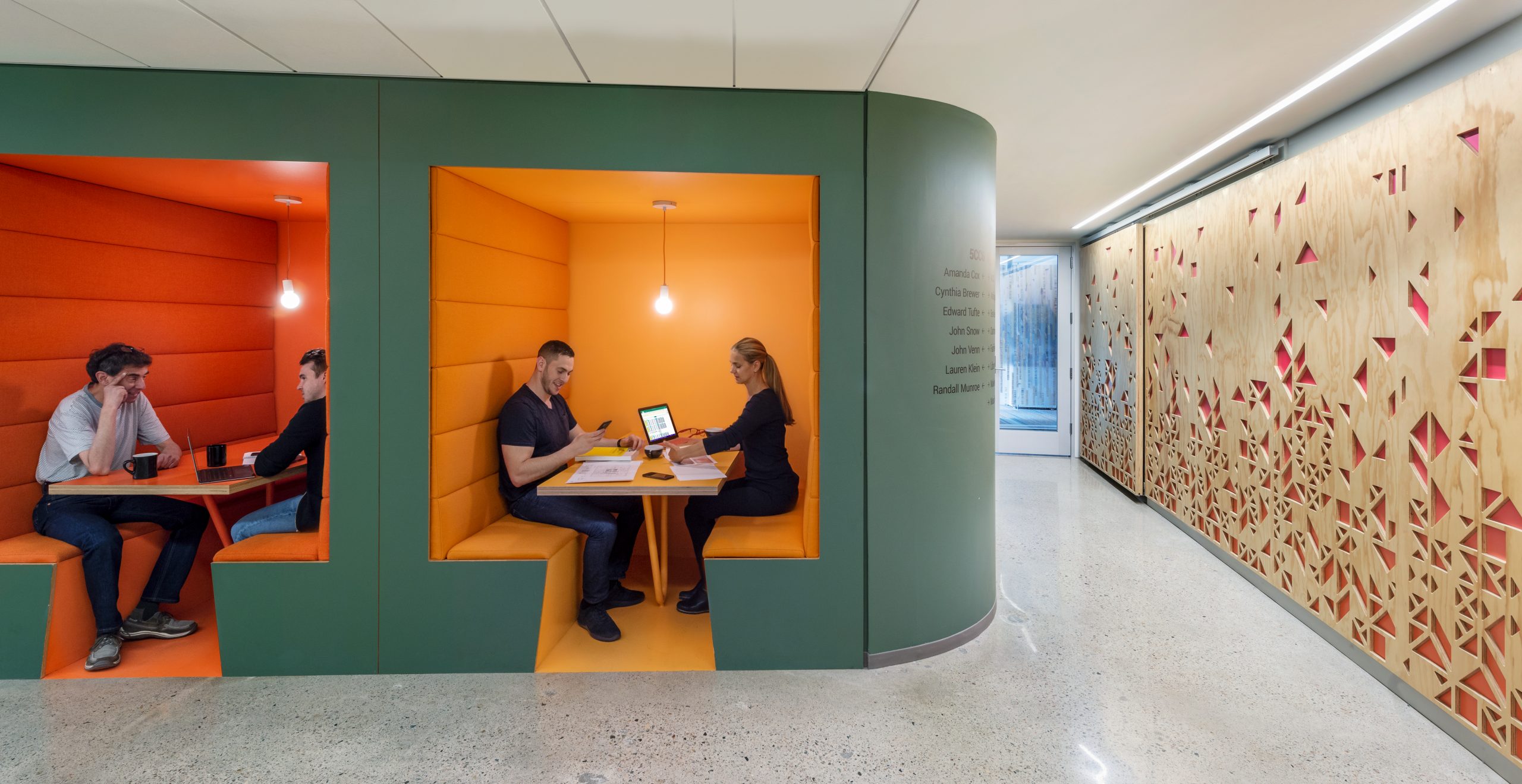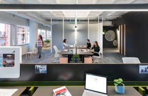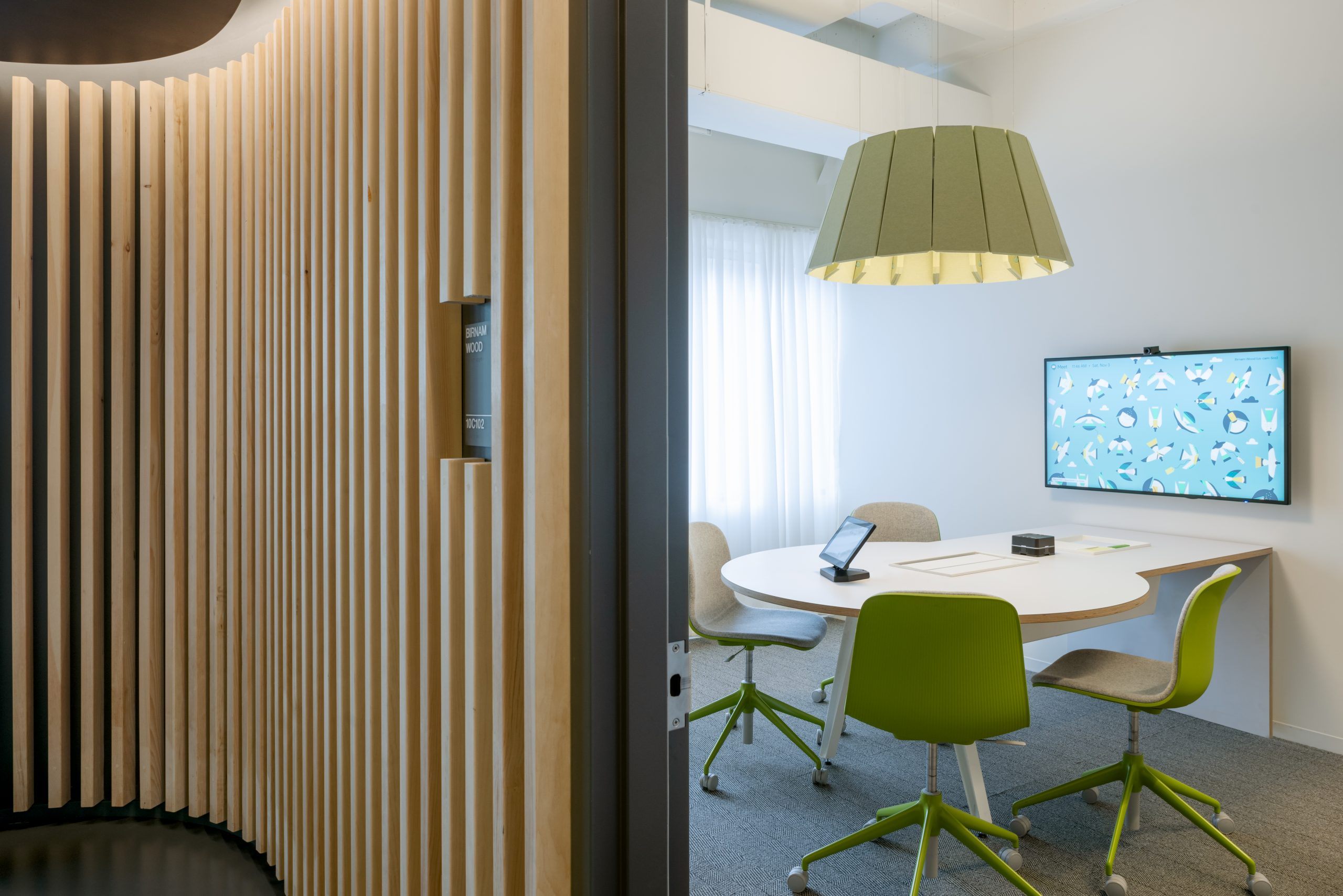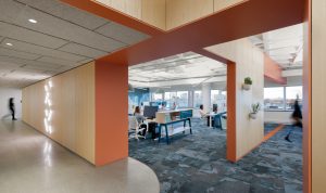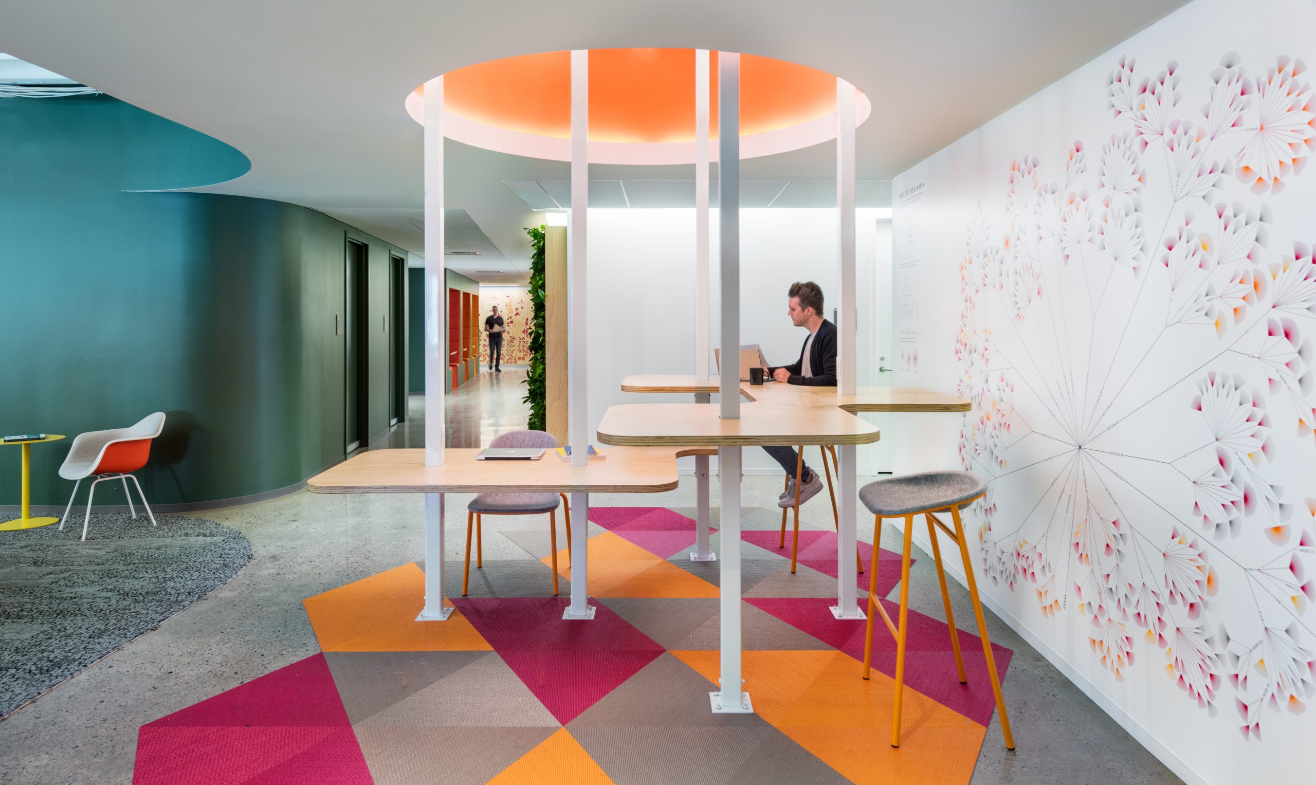This international tech firm has undertaken a significant expansion of its Kendall Square offices in the Cambridge Center Complex. This expansion includes two full floors, totaling approximately 30,000 square feet, providing new workspaces, meeting rooms, and eateries to make the workplace feel more like home. Funky pendants offset illuminated walls, which display supple textures, graphics, and colors. Open office areas are filled with sunlight, accentuated with a herringbone pattern of visually appealing pendants, and a brightly lit core to balance the daylight. The design creates a kinetic and energetic, yet cohesive workplace, within a comfortable luminous environment.