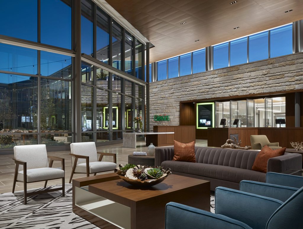 Transparency is a key design feature of the home office and research center for the Grande Cheese Company. Situated on 40 acres of pastoral countryside in Fond du Lac, Wisconsin, this 70,000-square-foot facility includes office space and research labs, plus industrial kitchens, dining spaces, a health clinic, wellness facility, library, café, reenergizing rooms, and various support areas. The glass walls of each area visually dissolve barriers between visitors and daily operations in cheese-making, and promote interaction between employees of various departments. Views to the exterior landscape and inner courtyard are key, so the electric lighting was designed to unobtrusively support natural lighting during daylight hour and promote transparency during early evening. Lighting hardware, mostly invisible and concealed in architectural details, indirectly wash ceilings and walls. Carefully selected decorative adds visual sparkle to the soft washes of electric lighting and daylighting. Each string of crisscrossing catenary lighting in the courtyard was individually programmed to highlight plantings and objects with different intensities. In addition to the changing ‘natural’ art in the courtyard, wall washes and accent lighting highlight an extensive art program throughout the building. The lighting is LED and dimmable, based on function, or automatically controlled, based on daylight availability or occupancy.