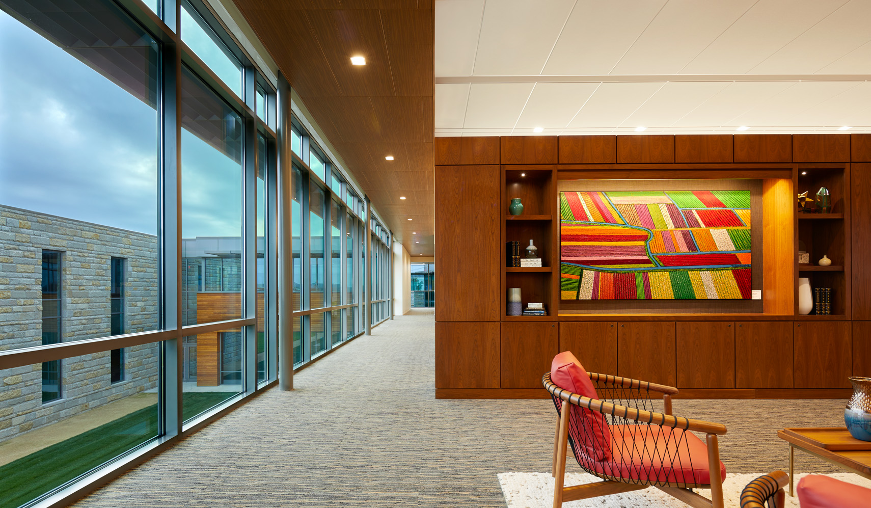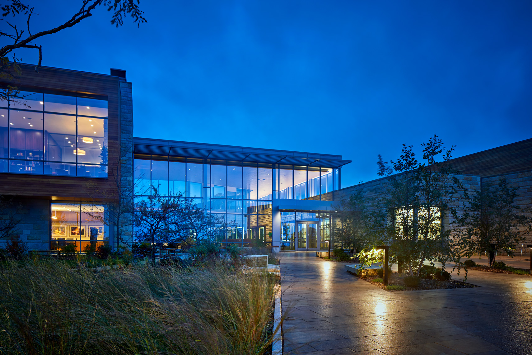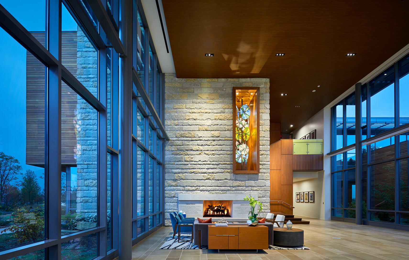Transparency is a key design feature of the home office and research center for the Grande Cheese Company. Situated on 40 acres of pastoral countryside in Fond du Lac, Wisconsin, this 70,000-square-foot facility includes office space and research labs, plus industrial kitchens, dining spaces, a health clinic, wellness facility, library, café, reenergizing rooms, and various support areas. The glass walls of each area visually dissolve barriers between visitors and daily operations in cheese-making, and promote interaction between employees of various departments. Views to the exterior landscape and inner courtyard are key, so the electric lighting was designed to unobtrusively support natural lighting during daylight hour and promote transparency during early evening. Lighting hardware, mostly invisible and concealed in architectural details, indirectly wash ceilings and walls. Carefully selected decorative adds visual sparkle to the soft washes of electric lighting and daylighting. Each string of crisscrossing catenary lighting in the courtyard was individually programmed to highlight plantings and objects with different intensities. In addition to the changing ‘natural’ art in the courtyard, wall washes and accent lighting highlight an extensive art program throughout the building. The lighting is LED and dimmable, based on function, or automatically controlled, based on daylight availability or occupancy.
