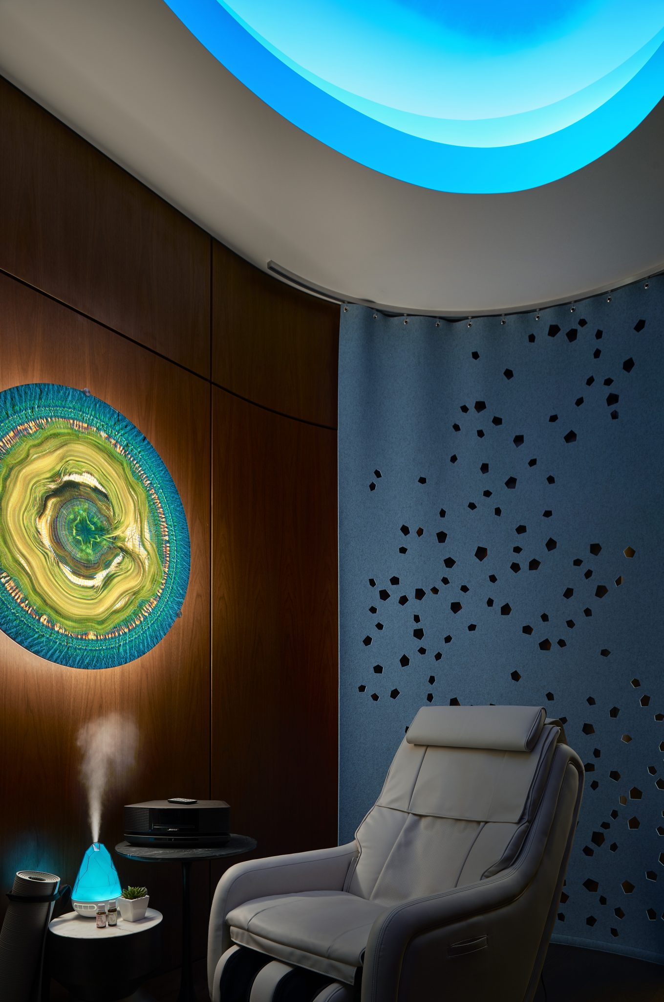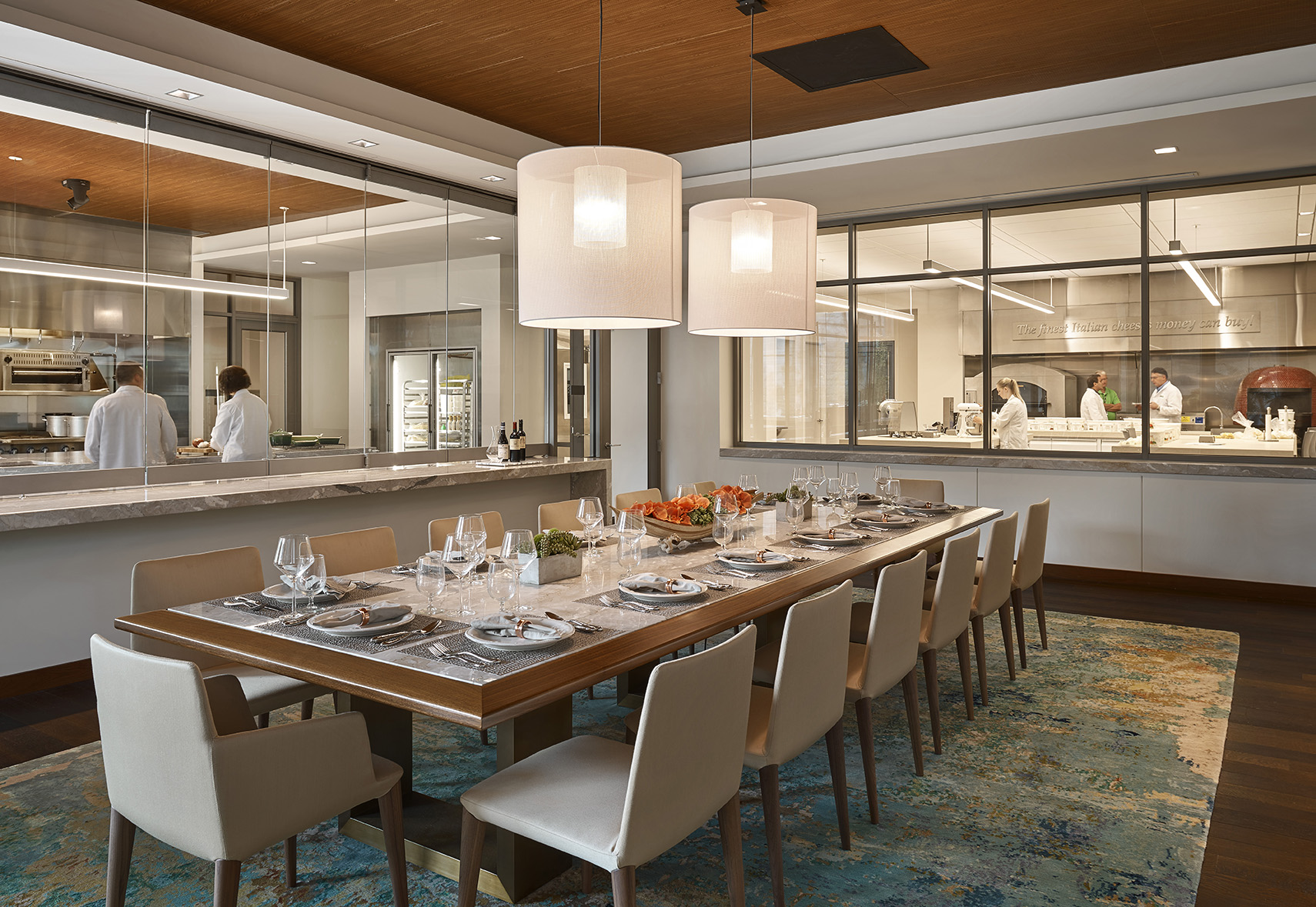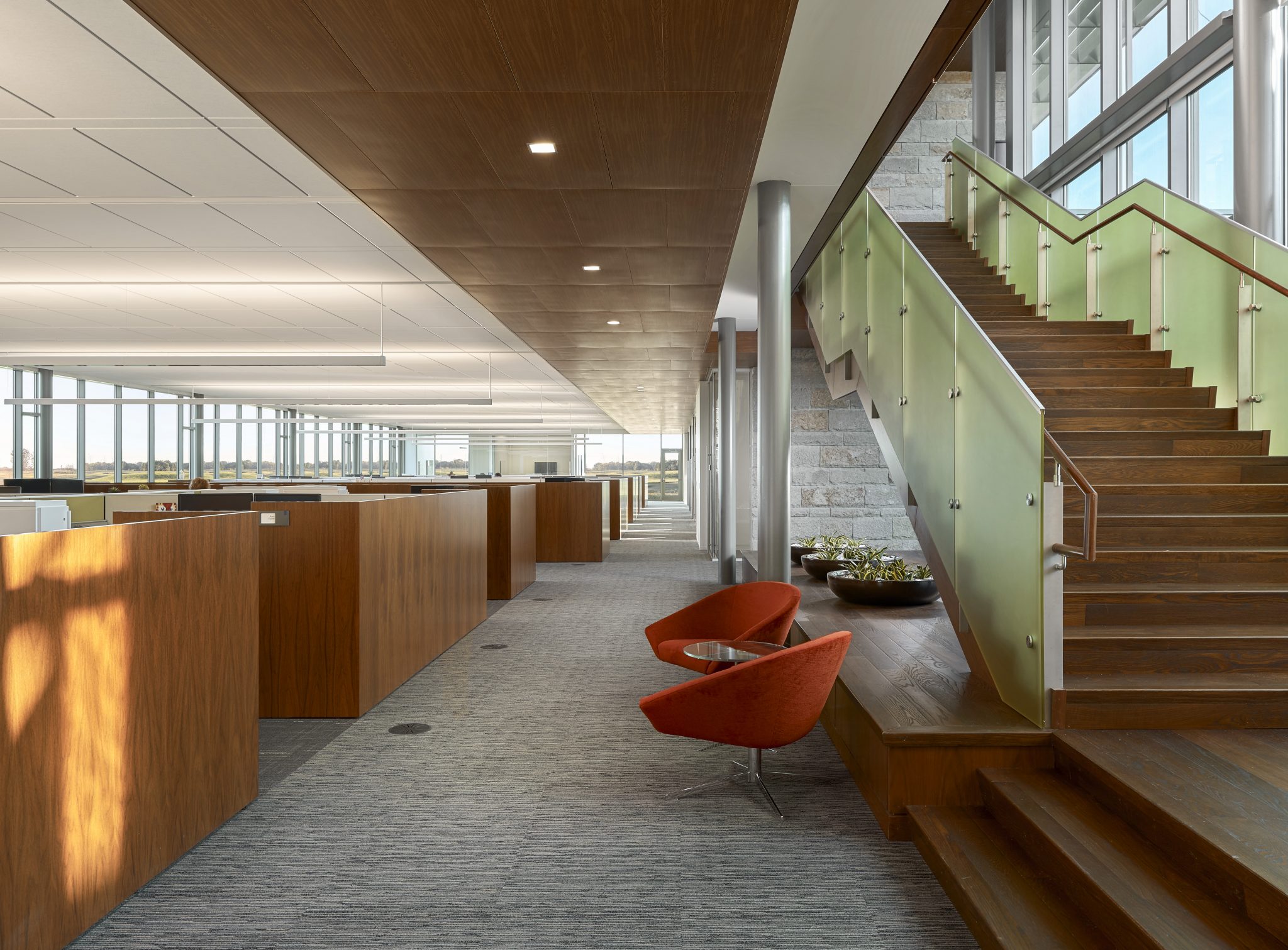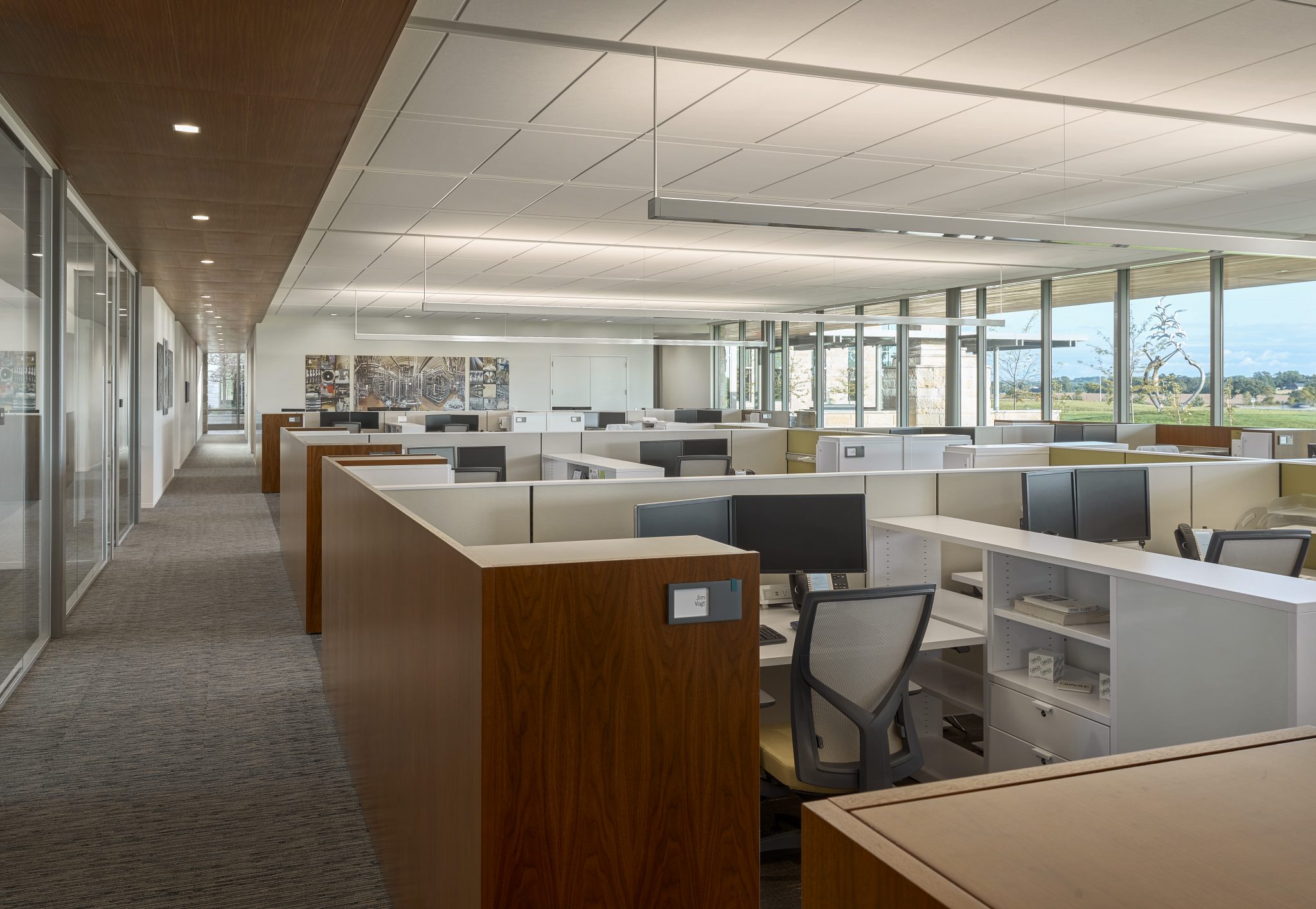 Transparency is a key design feature of the home office and research center for the Grande Cheese Company. Situated on 40 acres of pastoral countryside in Fond du Lac, Wisconsin, this 70,000-square-foot facility includes office space and research labs, plus industrial kitchens, dining spaces, a health clinic, wellness facility, library, café, reenergizing rooms, and various support areas. The glass walls of each area visually dissolve barriers between visitors and daily operations in cheese-making, and promote interaction between employees of various departments. Views to the exterior landscape and inner courtyard are key, so the electric lighting was designed to unobtrusively support natural lighting during daylight hour and promote transparency during early evening. Lighting hardware, mostly invisible and concealed in architectural details, indirectly wash ceilings and walls. Carefully selected decorative adds visual sparkle to the soft washes of electric lighting and daylighting. Each string of crisscrossing catenary lighting in the courtyard was individually programmed to highlight plantings and objects with different intensities. In addition to the changing ‘natural’ art in the courtyard, wall washes and accent lighting highlight an extensive art program throughout the building. The lighting is LED and dimmable, based on function, or automatically controlled, based on daylight availability or occupancy.