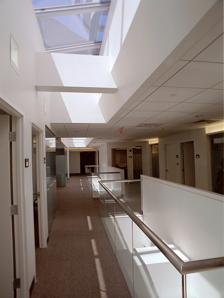 This four-story interior office renovation in historic Harvard Square challenged the design team to bring the presence of daylight throughout a virtually windowless space with limited access to the sky. Studies of various roof-mounted reflectors and lightwell configurations using scale models and a heliodon led to the use of three south-facing, polished stainless-steel reflectors and a tapered lightwell to redirect available sunlight down through the interior floor openings below. Each reflector is fixed in place to reduce cost, and is aimed to optimize available sun throughout summer, winter, or equinox. As many as five sunlight passes per day can occur in the summer months, and the dynamic nature of the sun penetrates the full height of the narrow, windowless space, providing a valuable connection to the outdoors throughout the building core.