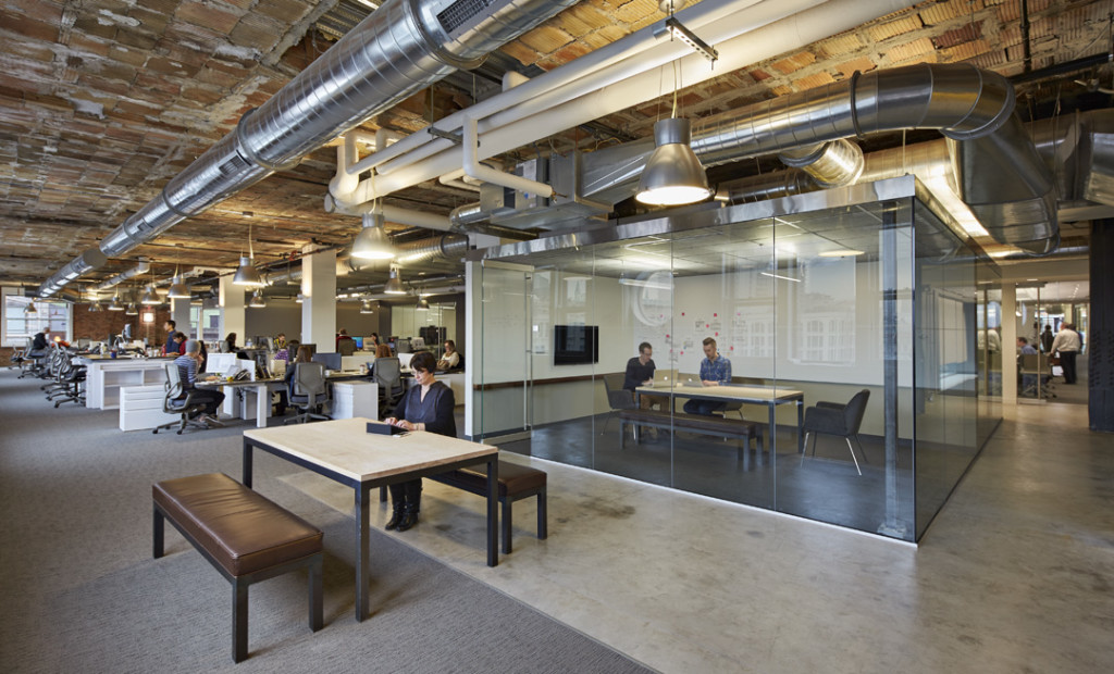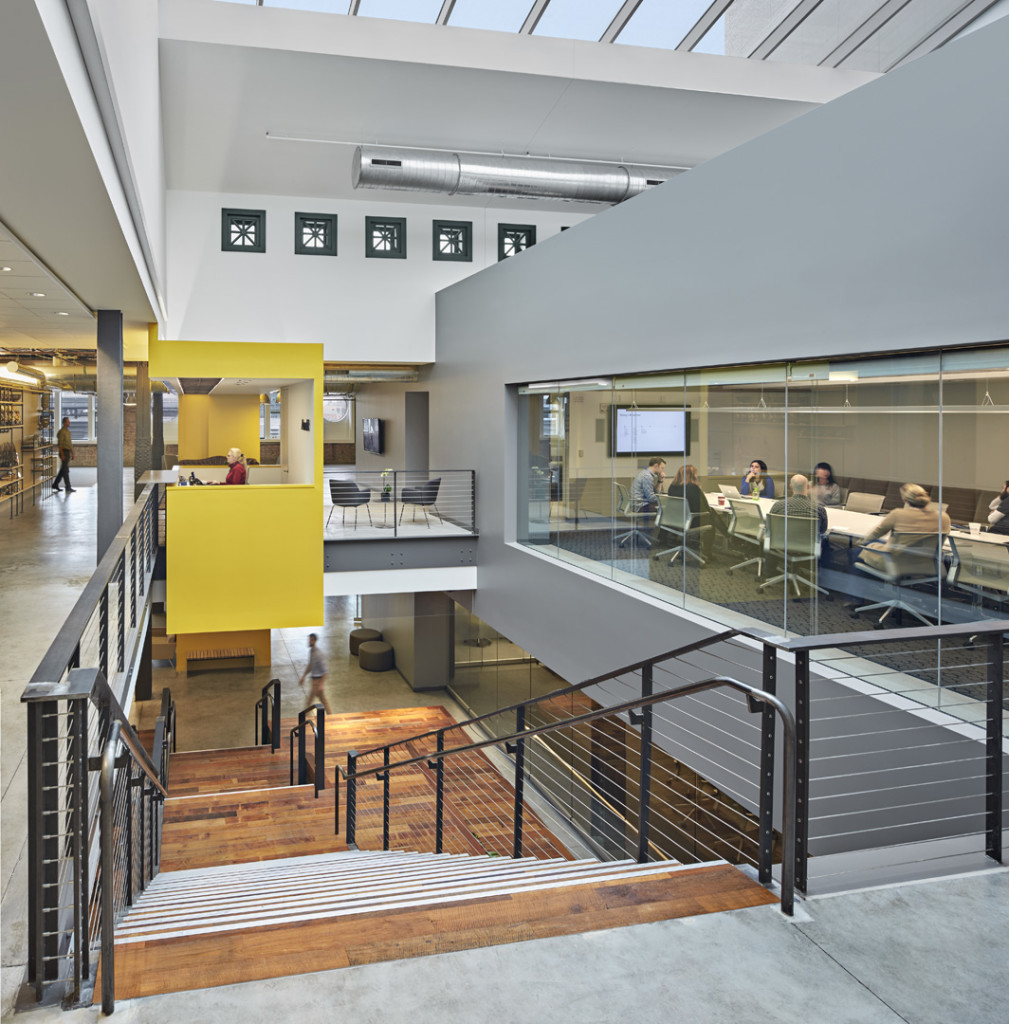 Large connecting stairs and gathering spaces spawn casual conversations and unplanned team collaboration. Hallways with ‘idea paint’ on the walls become break-out areas, where work can spill from the adjacent conference rooms. Fixtures are integrated and concealed within the architectural fabric wherever possible. When visible, the fixture finishes were chosen to match the exposed framework of mechanical systems, complementing the industrial appearance of the space.