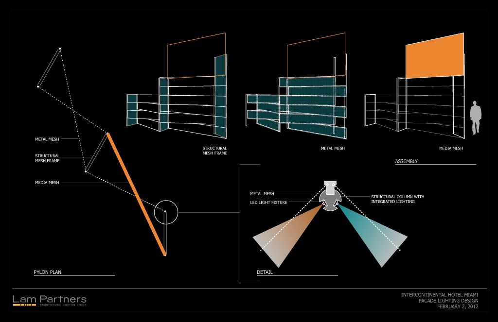 This thorough 2012 renovation brought Pietro Belluschi’s classic Modernist hotel convincingly into the 21st century. The updated lobby, atrium, and two new restaurants feature addressable LED panels and touchscreen tables. On the exterior, a 19-story, low resolution media façade provides a striking identity for the hotel on the Miami skyline, and a giant canvas for digital art. The project incorporates over 90,000 independent LED nodes, wired through the pre-existing phone lines. Careful integration eliminates any guestroom disturbance.