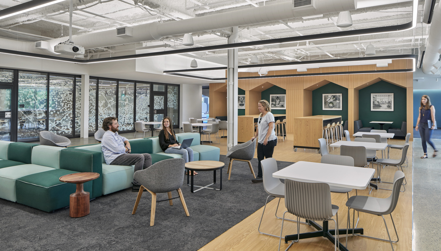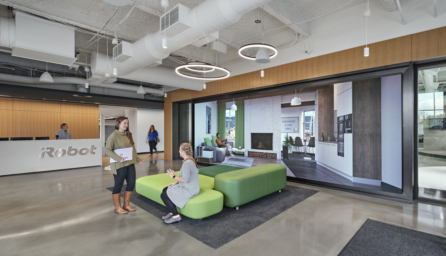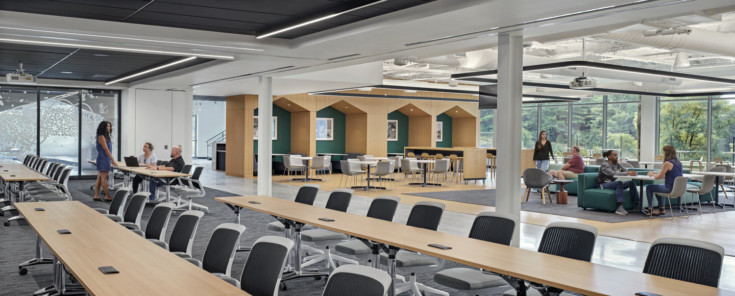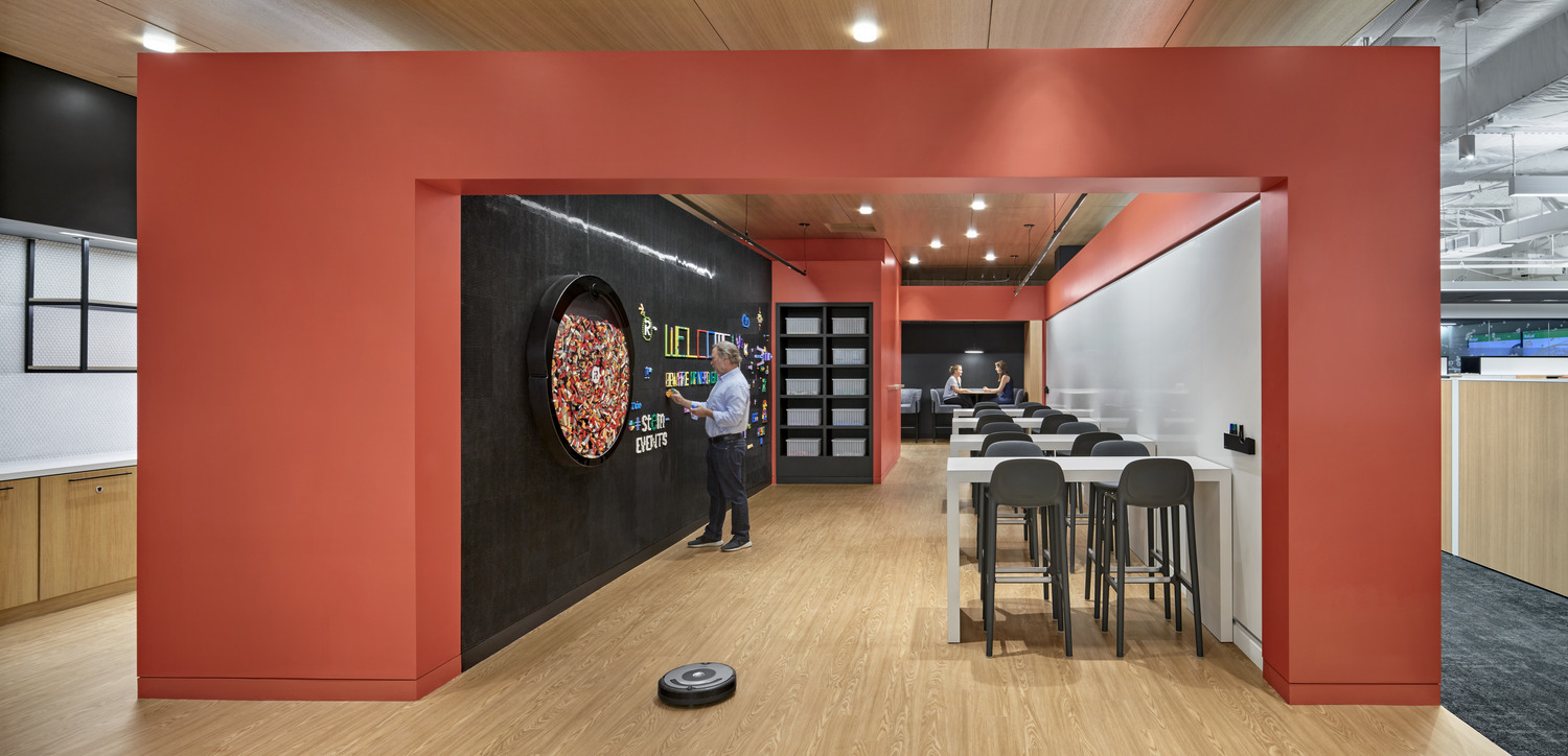 iRobot, the leading global consumer robot company (popularly known for the Roomba robot vacuum) recently reinvented the campus for its 200,000-square-foot multi-building headquarters. Balancing humanity and technology, the reimagined campus supports how work happens, encourages mobility and community, empowers employees to do their best work from any location, highlights innovation, and facilitates future change. The architectural lighting creates a warm ambience throughout the numerous areas of the building, called “neighborhoods”.