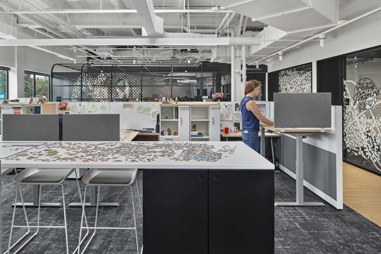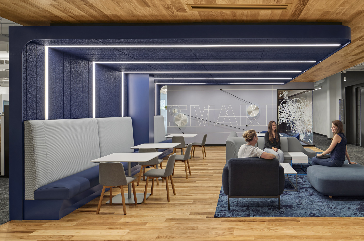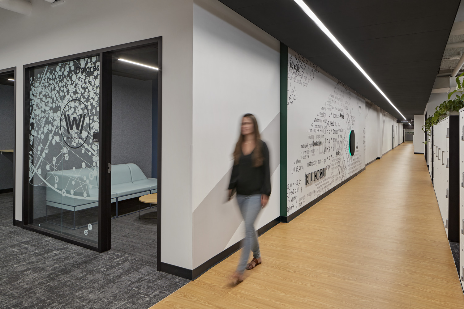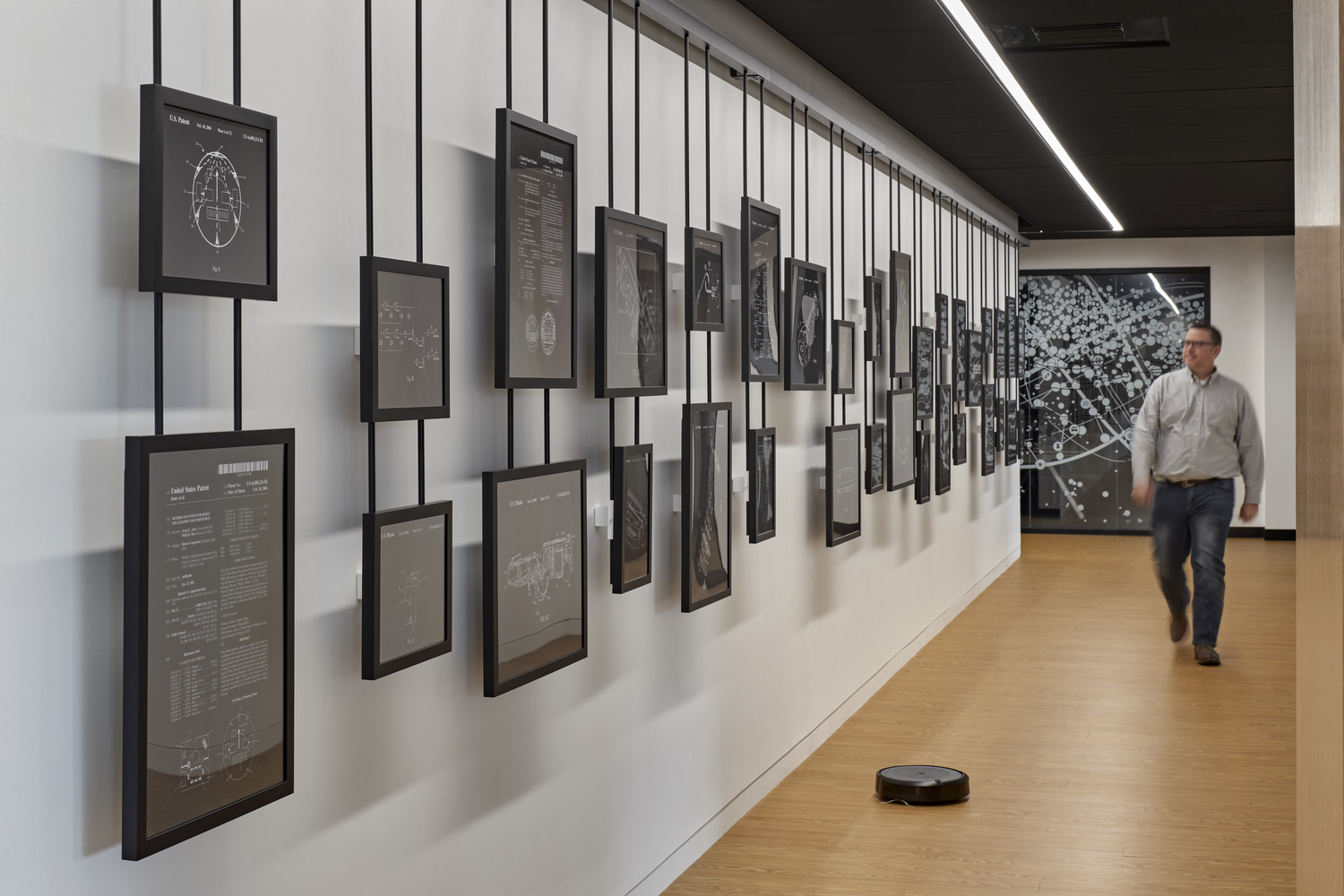 iRobot, the leading global consumer robot company (popularly known for the Roomba robot vacuum) recently reinvented the campus for its 200,000-square-foot multi-building headquarters. Balancing humanity and technology, the reimagined campus supports how work happens, encourages mobility and community, empowers employees to do their best work from any location, highlights innovation, and facilitates future change. The architectural lighting creates a warm ambience throughout the numerous areas of the building, called “neighborhoods”.