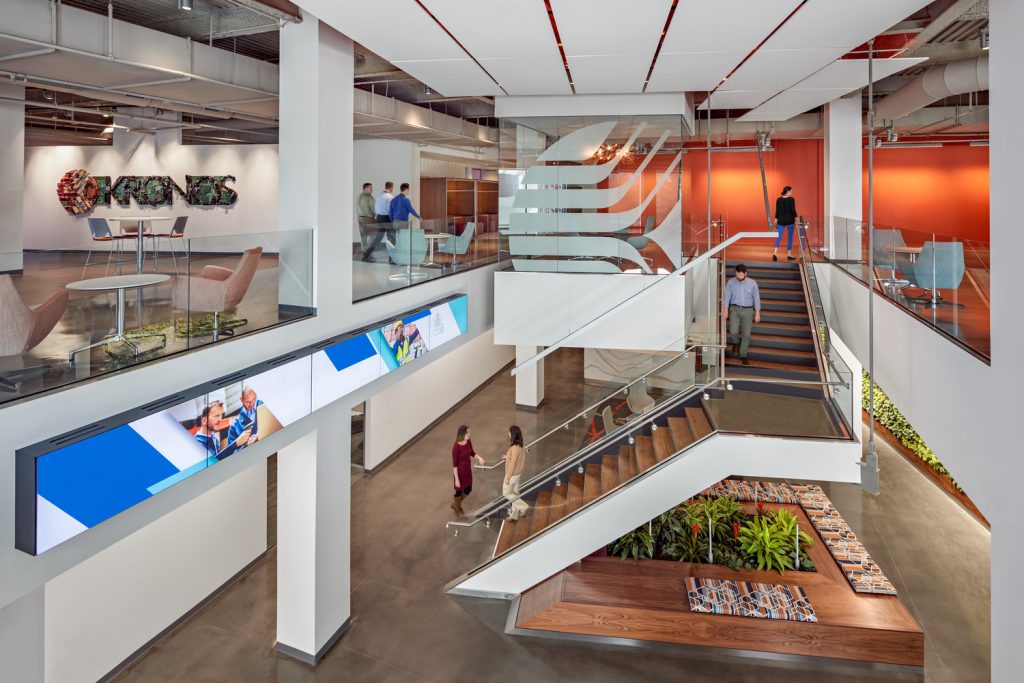 Comprising 6,000 employees worldwide, multinational workforce and human capital management cloud provider, Kronos, had outgrown its previous location in Chelmsford, MA. Kronos selected the iconic Cross Point office tower complex in Lowell for its new global headquarters in 2016. Now centralized and spread across 16 floors, this new 465,000-square-foot space offers a combination of architecturally integrated uplighting, wallwashing, and decorative pendants in bold geometric forms, which emphasize the architectural features that are primarily situated around the building cores and common areas. Not to be ignored, the predominantly open offices benefit from a fun interpretation of the Kronos logo. The seemingly normal direct/indirect linear pendants lighting these spaces take a different direction – by literally changing direction; at the end of each run the custom pendants bend upward at the same angle as the lines in the company logo, and help mark the circulation zones around the open offices, conference rooms, and breakout spaces.