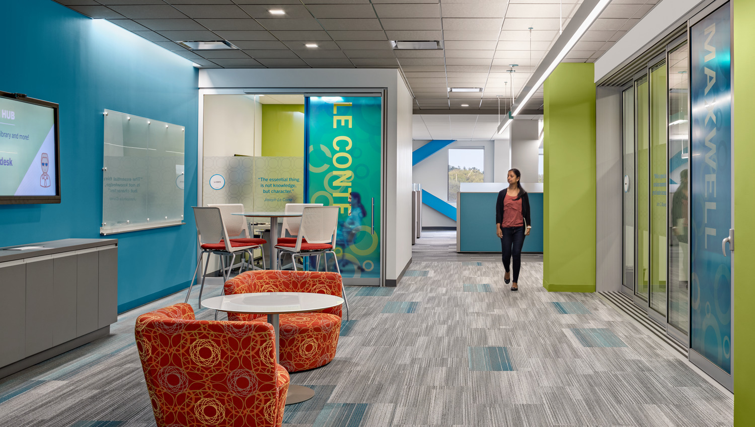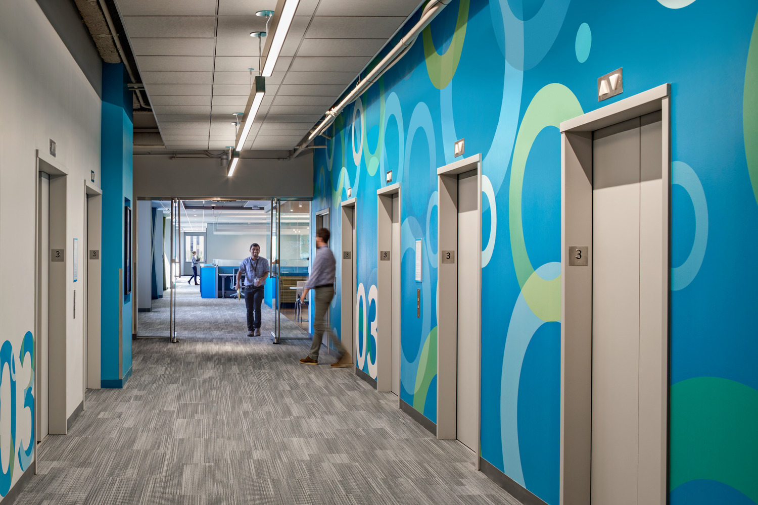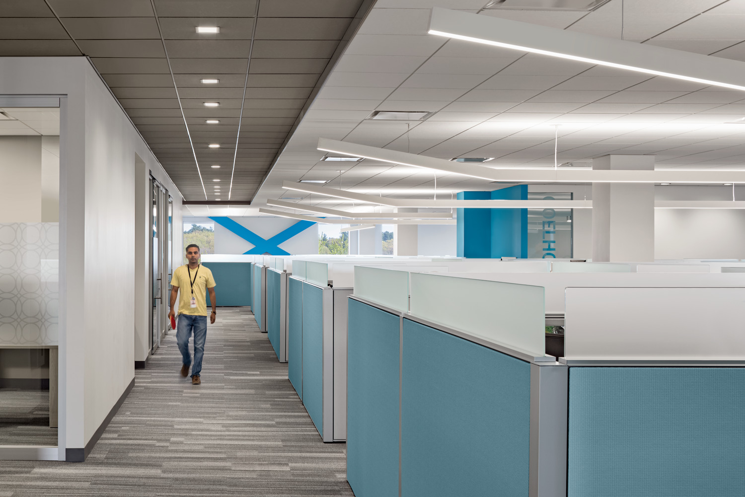 Comprising 6,000 employees worldwide, multinational workforce and human capital management cloud provider, Kronos, had outgrown its previous location in Chelmsford, MA. Kronos selected the iconic Cross Point office tower complex in Lowell for its new global headquarters in 2016. Now centralized and spread across 16 floors, this new 465,000-square-foot space offers a combination of architecturally integrated uplighting, wallwashing, and decorative pendants in bold geometric forms, which emphasize the architectural features that are primarily situated around the building cores and common areas. Not to be ignored, the predominantly open offices benefit from a fun interpretation of the Kronos logo. The seemingly normal direct/indirect linear pendants lighting these spaces take a different direction – by literally changing direction; at the end of each run the custom pendants bend upward at the same angle as the lines in the company logo, and help mark the circulation zones around the open offices, conference rooms, and breakout spaces.