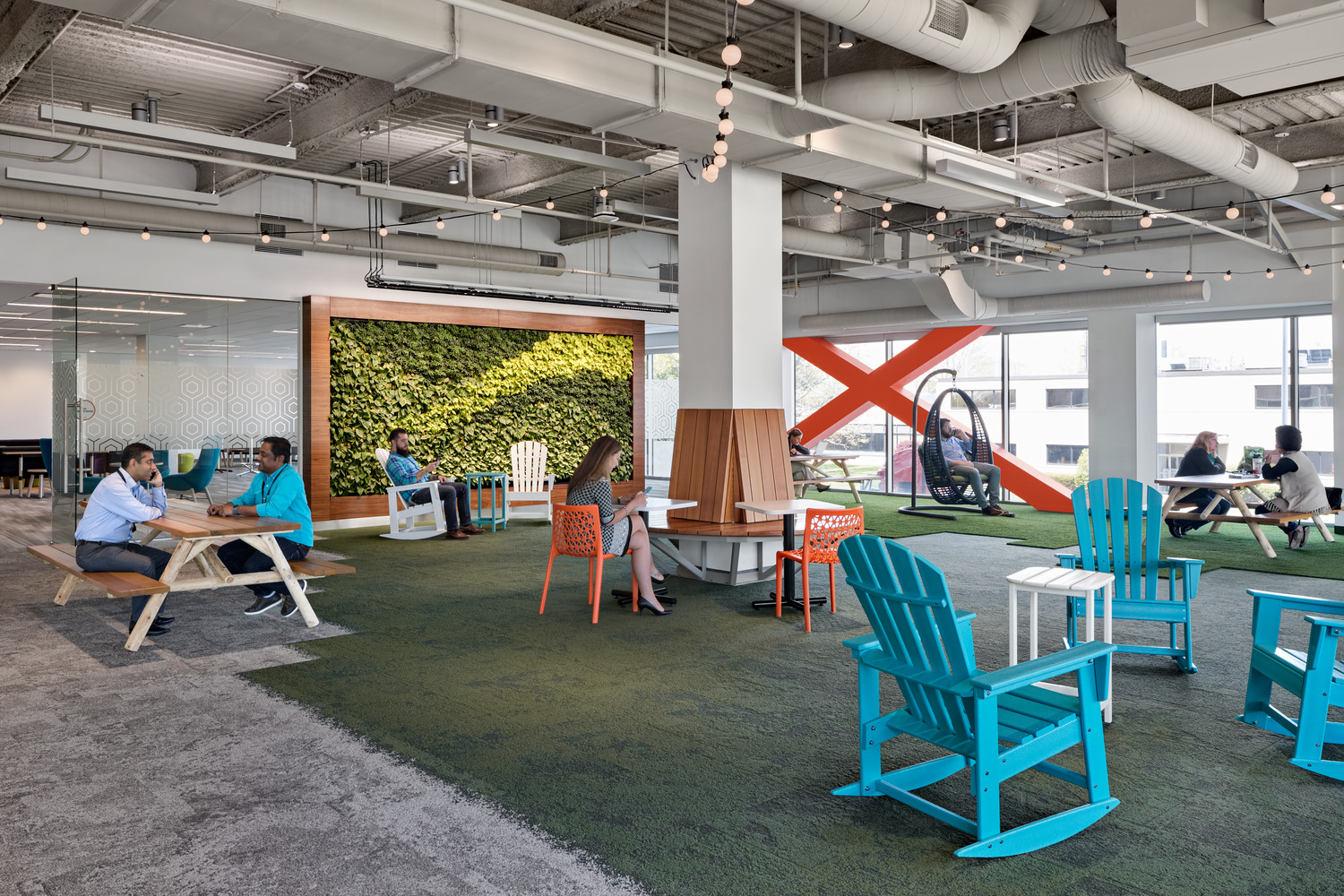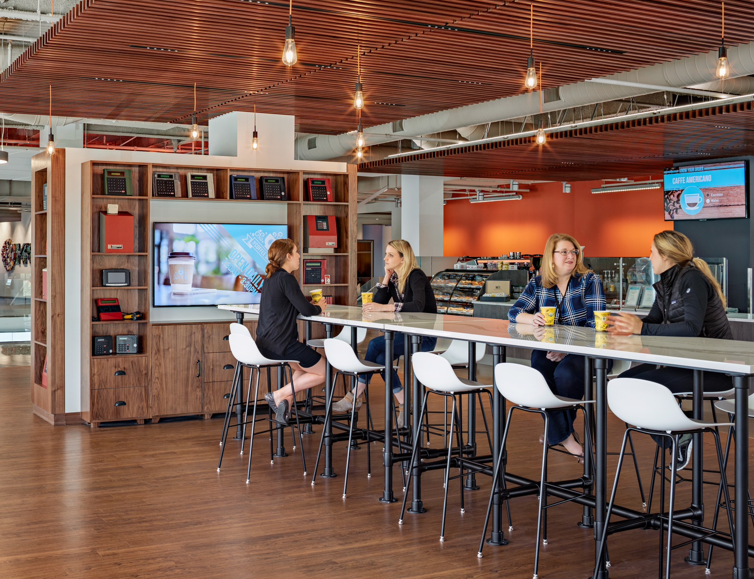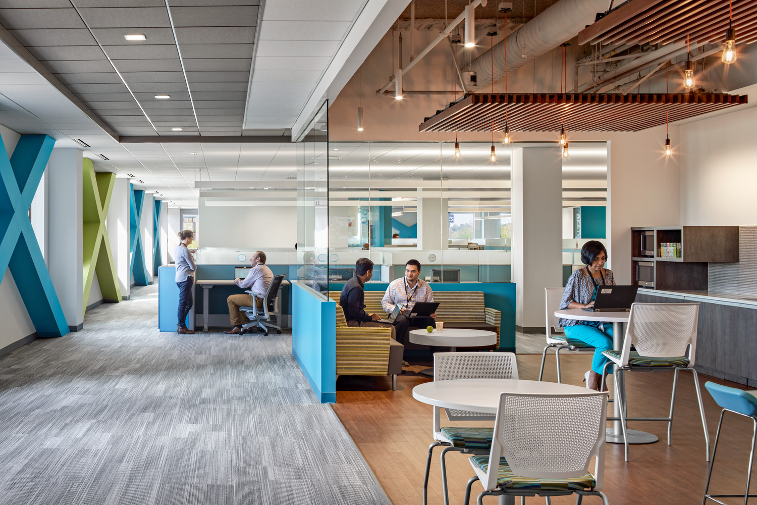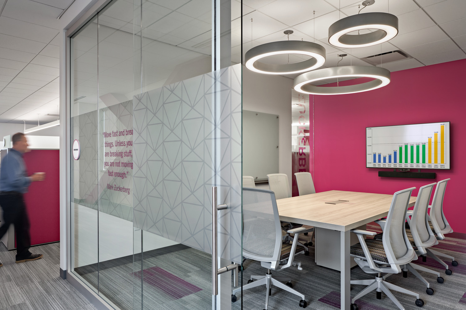 Comprising 6,000 employees worldwide, multinational workforce and human capital management cloud provider, Kronos, had outgrown its previous location in Chelmsford, MA. Kronos selected the iconic Cross Point office tower complex in Lowell for its new global headquarters in 2016. Now centralized and spread across 16 floors, this new 465,000-square-foot space offers a combination of architecturally integrated uplighting, wallwashing, and decorative pendants in bold geometric forms, which emphasize the architectural features that are primarily situated around the building cores and common areas. Not to be ignored, the predominantly open offices benefit from a fun interpretation of the Kronos logo. The seemingly normal direct/indirect linear pendants lighting these spaces take a different direction – by literally changing direction; at the end of each run the custom pendants bend upward at the same angle as the lines in the company logo, and help mark the circulation zones around the open offices, conference rooms, and breakout spaces.
