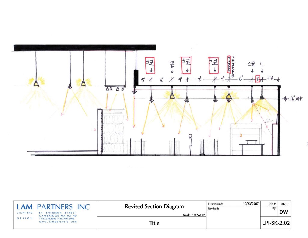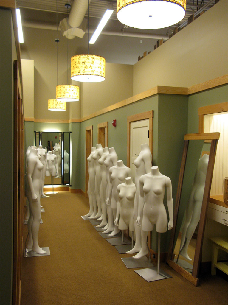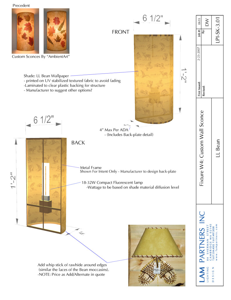 In redesigning L.L.Bean’s retail store prototype, the Lam team crafted a lighting scheme that utilizes the principle of positive focus—lighting the walls and merchandise, allowing the ambient light levels to drop off. To achieve this, the perimeter is wrapped in linear fluorescent fixtures, while ‘high-bay’ pendants fill in ambient lighting throughout the floor area where needed, and low-wattage metal halide track heads light the merchandise. The resulting lighting scheme was very energy-efficient at the time of construction. In the dressing rooms, custom-designed fixtures employ L.L.Bean’s signature wrapping paper motif. Register areas take advantage of the unfinished ceiling aesthetic, hiding light in between joists.