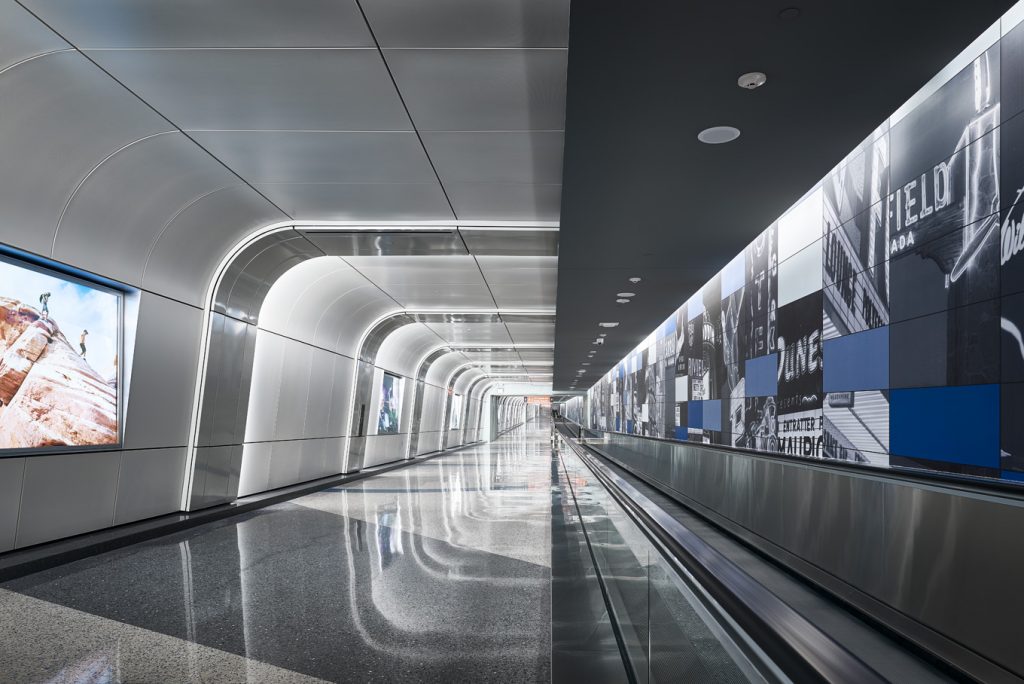 Light and material work together to create a visual rhythm and a sense of directional movement, flowing through the International Passenger’s Tunnel at McCarran International Airport. Graceful curving lines of light are concealed within the metal panels wrapping from wall to ceiling, fully integrating the lighting hardware into the architectural fabric of the connecting tunnel. Brightness envelops the passenger from all surfaces, enlivening the journey through the subterranean passageway.