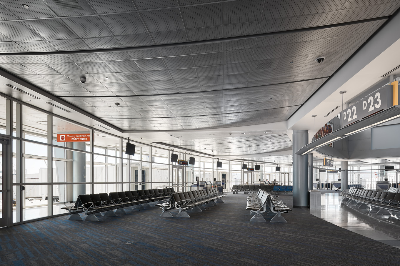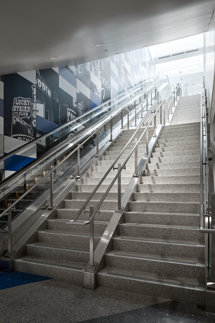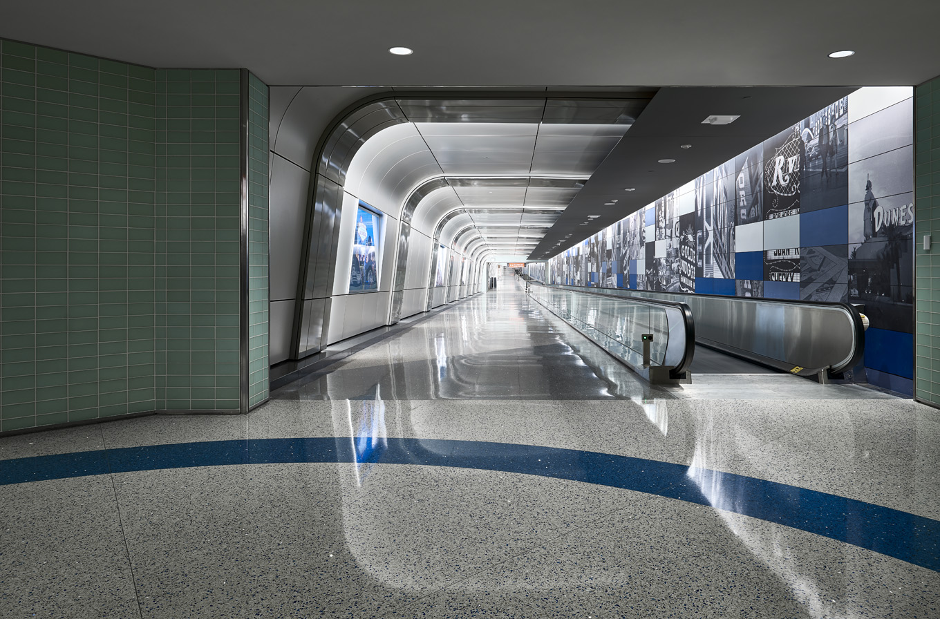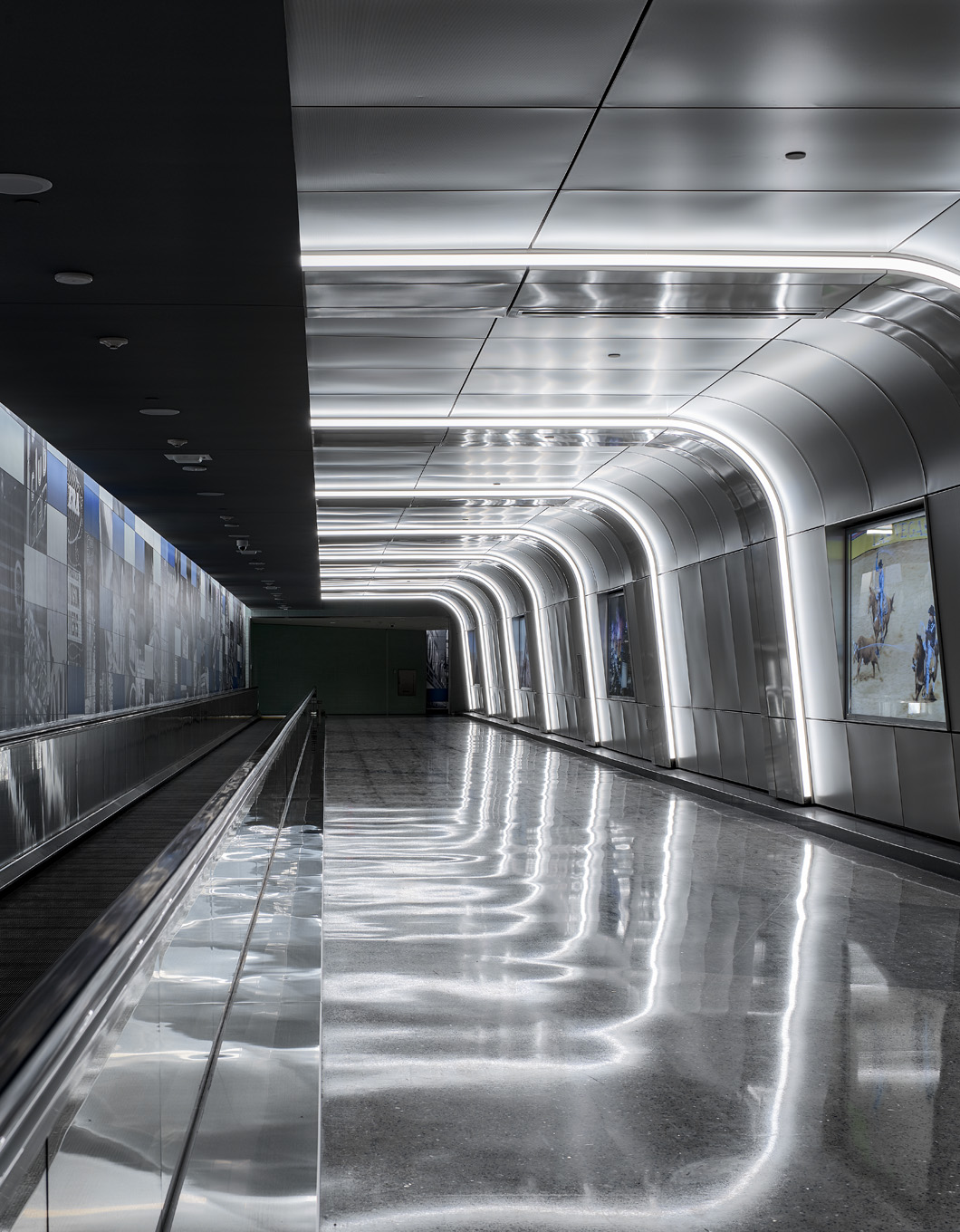 Light and material work together to create a visual rhythm and a sense of directional movement, flowing through the International Passenger’s Tunnel at McCarran International Airport. Graceful curving lines of light are concealed within the metal panels wrapping from wall to ceiling, fully integrating the lighting hardware into the architectural fabric of the connecting tunnel. Brightness envelops the passenger from all surfaces, enlivening the journey through the subterranean passageway.