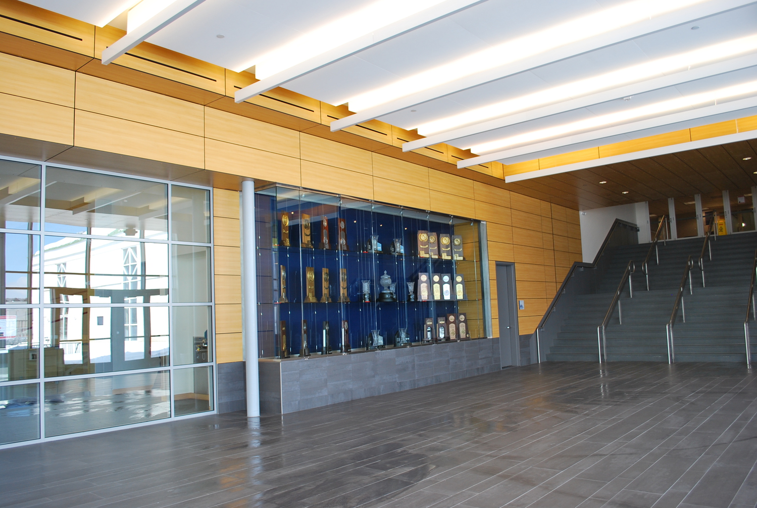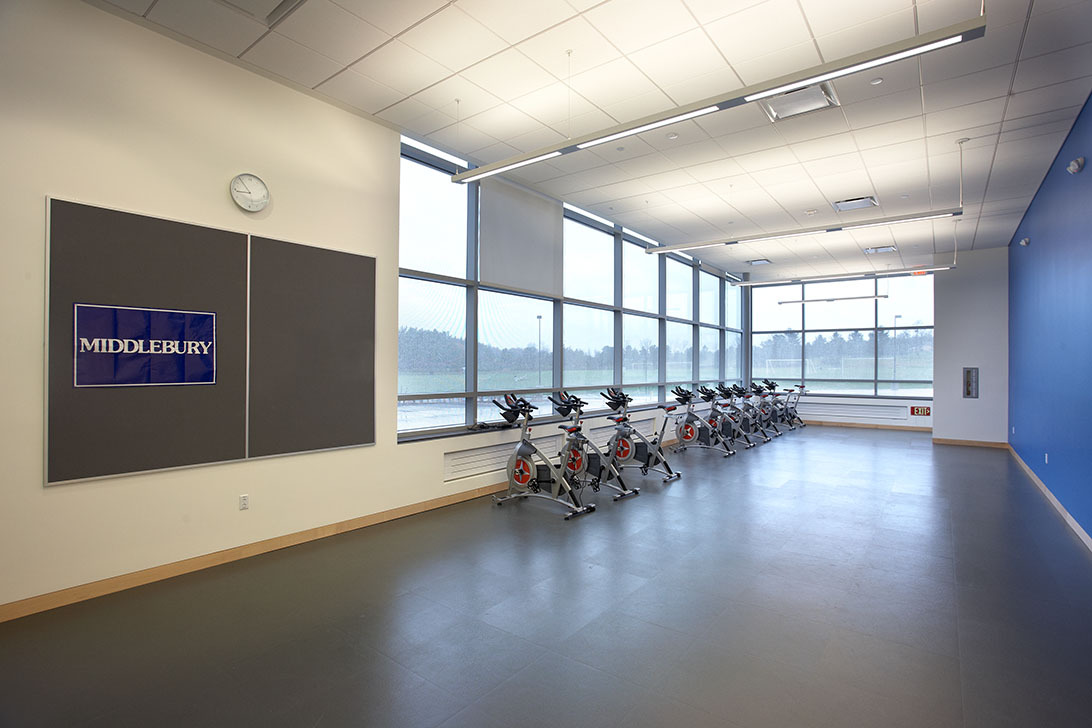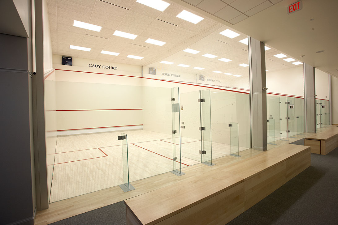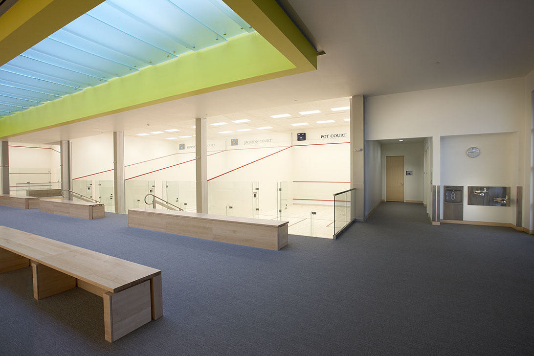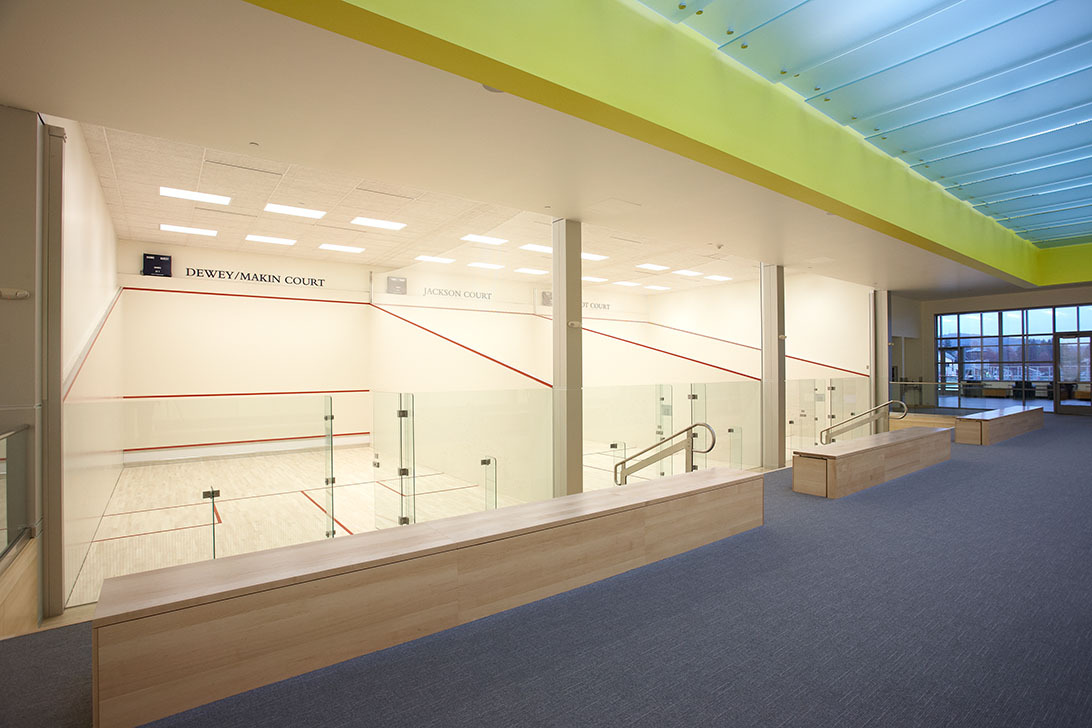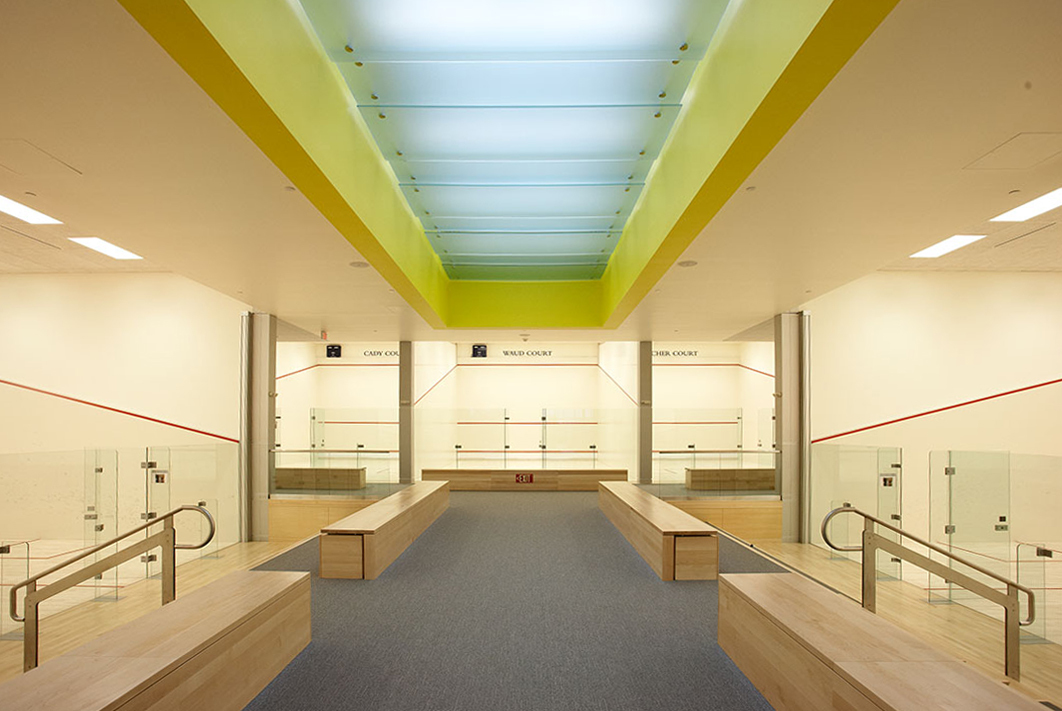 This LEED Platinum Middlebury squash facility offers nine new squash courts with spectator seating, a fitness center, and a grand lobby. A dramatic skylight is the sole source of illumination for the spectator seating area; at night, the etched glass is illuminated by dimmed LED fixtures, seamlessly replacing the daylight after dark. The blade elements of the lobby ceiling function as light fixtures, indirectly lighting the entire space. At night, this glowing ceiling turns the dramatic exterior of the building into an inviting portal.