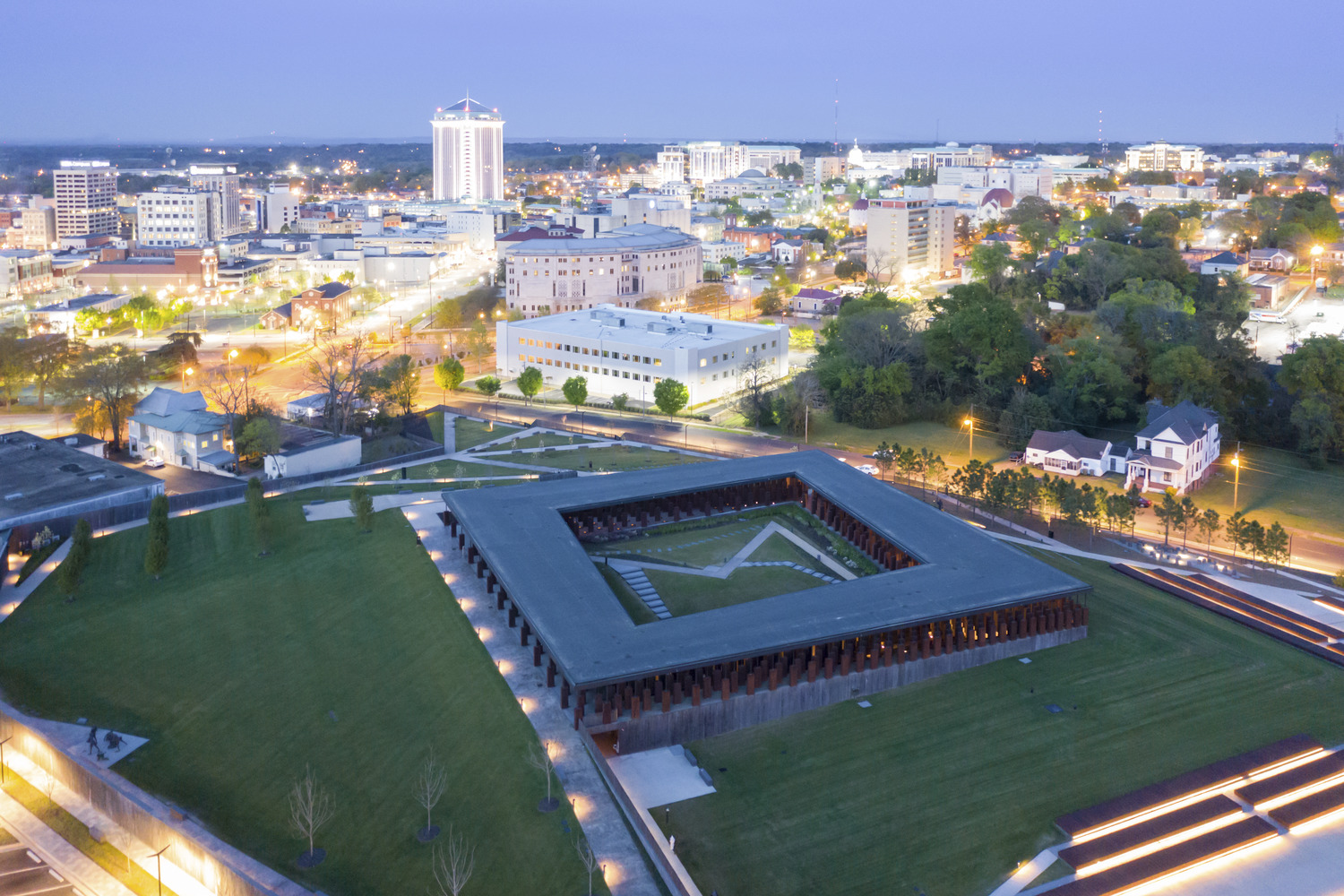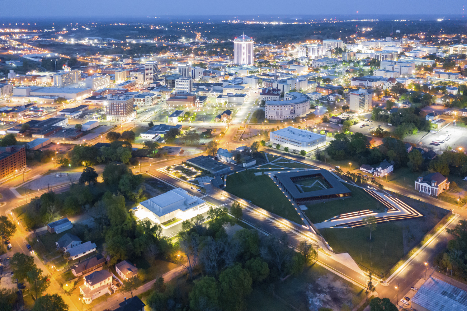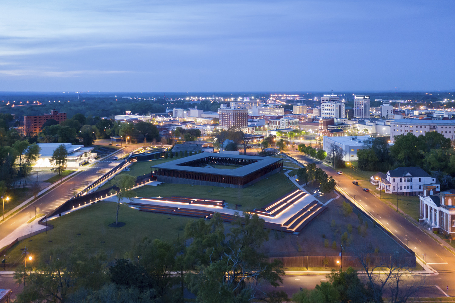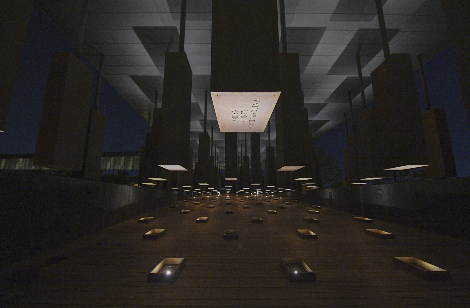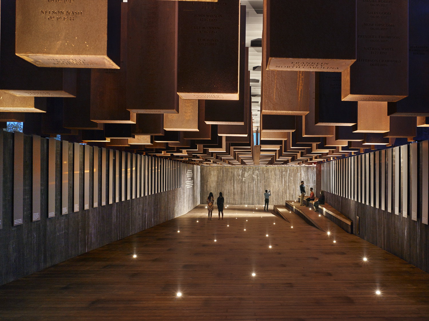 On a six-acre sacred site in Montgomery, Alabama, this national lynching memorial recognizes the history of racial injustice in our country and serves as a remembrance of the victims and those who fled from racial terror in America. Approaching the memorial, the form is dark and mysterious. As you get closer, a glow from beyond the forest of monuments beckons. At the threshold, massive monuments rest silently on the ground. Quickly the ground begins to give way, spilling light out under each monument. Down the first ramp, each of them is lit from below by a narrow beam of light. As you transition, the monuments are no longer engaged with your body; they now fly above your head. At this point, the lighting for each monument gives way to a pattern of uplights, which create a dappled, uneven effect above.