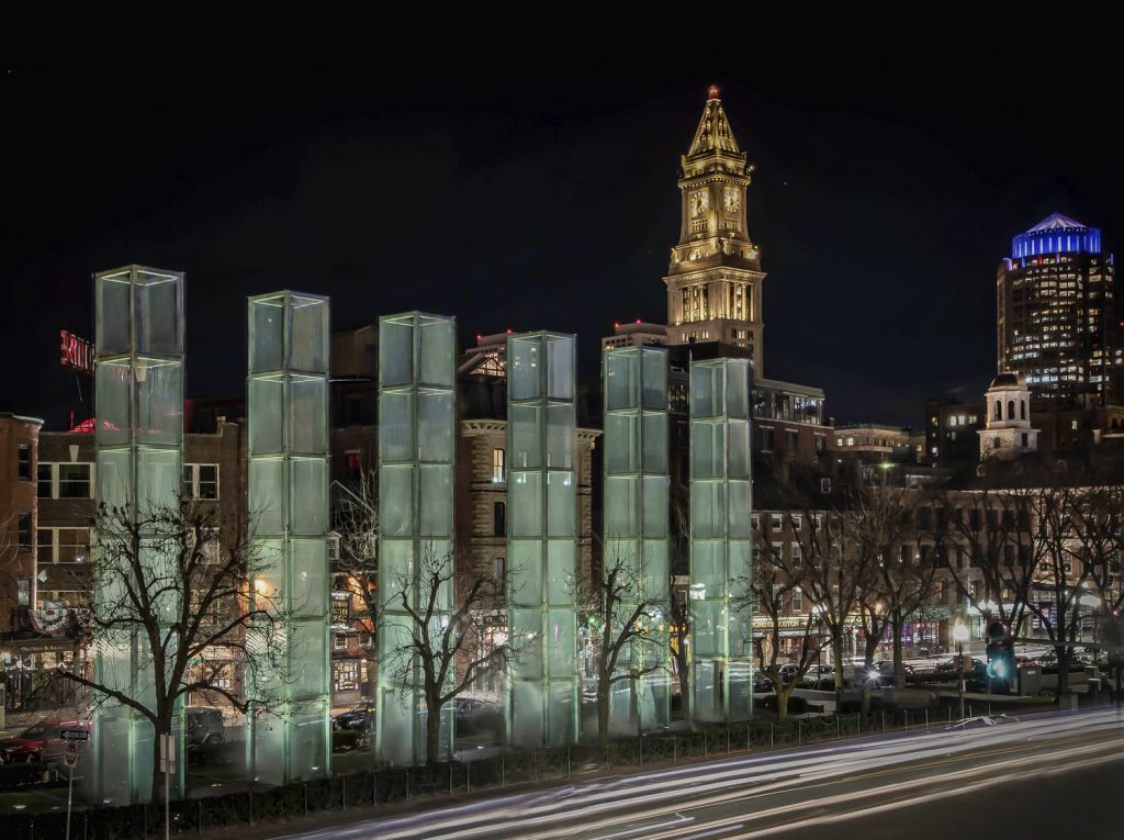 Working closely with the Combined Jewish Philanthropies, Lam Partners redesigned the existing lighting for six glass towers, associated submerged pits, and the surrounding landscape area that comprise the New England Holocaust Memorial. Originally conceived of as fire pits below each glass tower, these features were relighted with a message of hope in mind. Using an animated fiber optic system, a powerful starry illusion invites the gaze of the passerby while walking underneath each uplighted glass tower. The grazing uplight, combined with the dynamically lighted steam-filled mysterious pits, transforms the memorial’s experience at night.
