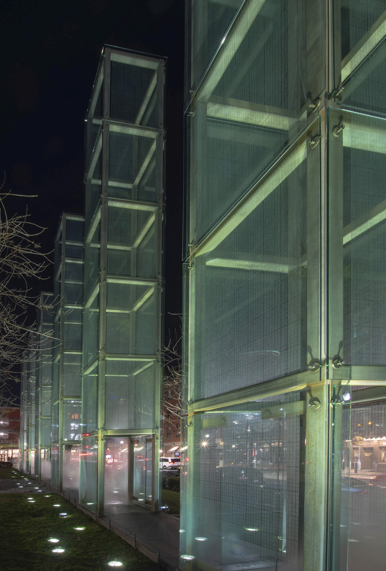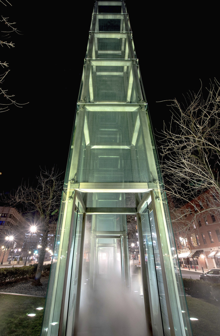Working closely with the Combined Jewish Philanthropies, Lam Partners redesigned the existing lighting for six glass towers, associated submerged pits, and the surrounding landscape area that comprise the New England Holocaust Memorial. Originally conceived of as fire pits below each glass tower, these features were relighted with a message of hope in mind. Using an animated fiber optic system, a powerful starry illusion invites the gaze of the passerby while walking underneath each uplighted glass tower. The grazing uplight, combined with the dynamically lighted steam-filled mysterious pits, transforms the memorial’s experience at night.