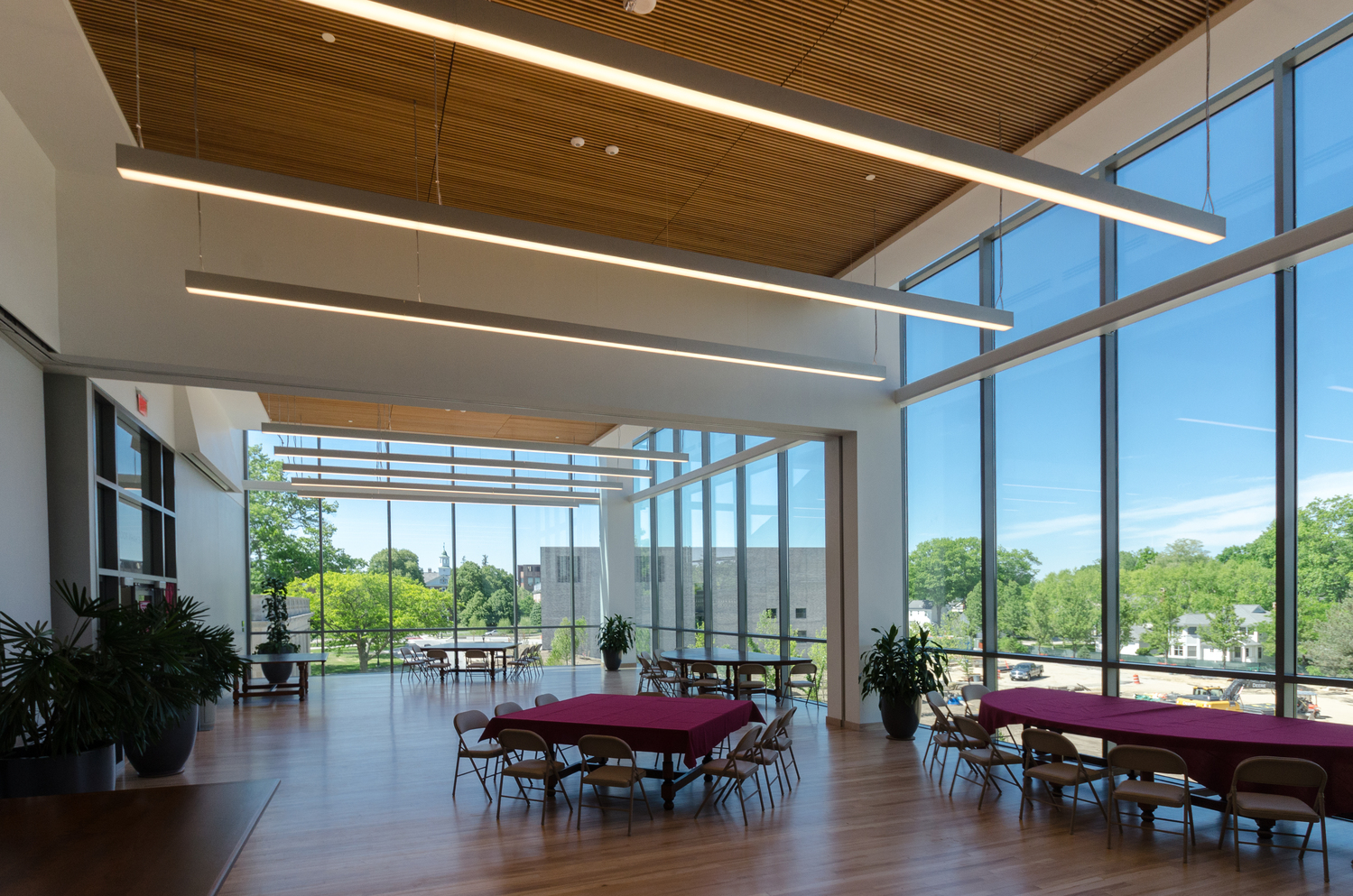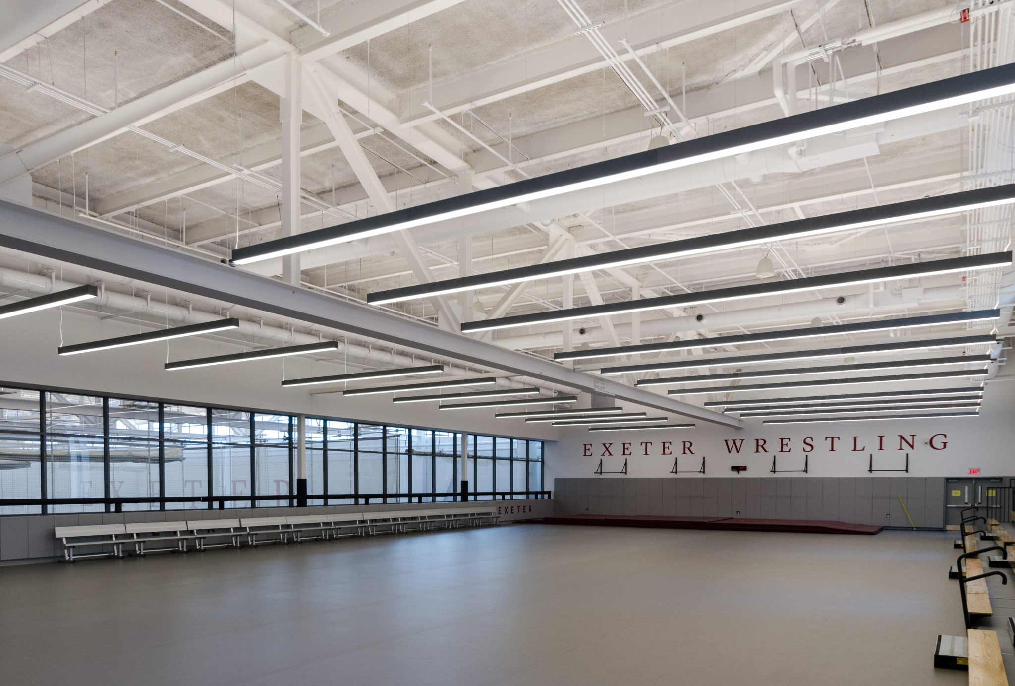 Attached to the Love Gym at Phillips Exeter Academy, this field house complements the existing athletic facilities, offering a 13,000-square-foot, mezzanine-level wrestling space above the field house floor, and a 70,000-square-foot parking level below. A fully indirect LED lighting system provides bright (but glare-free) lighting to the main fieldhouse space.