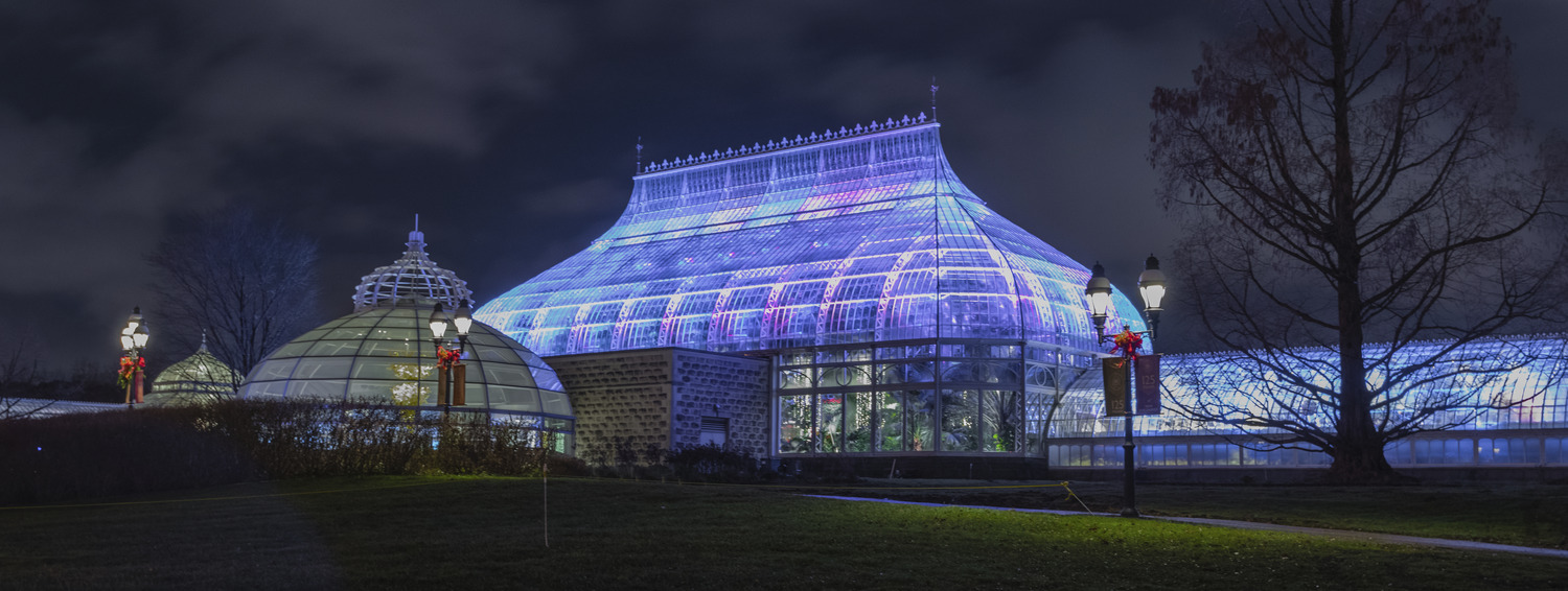 In preparation for its 125th anniversary, Phipps Conservatory undertook the restoration of the historic ogee crest, which had been missing from the glasshouse since 1937. As part of the celebration, a new lighting scheme was envisioned to turn the original Lord & Burnham design into a lantern for special events. This design helps to reveal the ogee’s complex curves, and brings life to it as it soars above Schenley Park. https://www.phipps.conservatory.org/press-room/press-releases/the-ogee-makes-its-return-to-phipps-conservatory