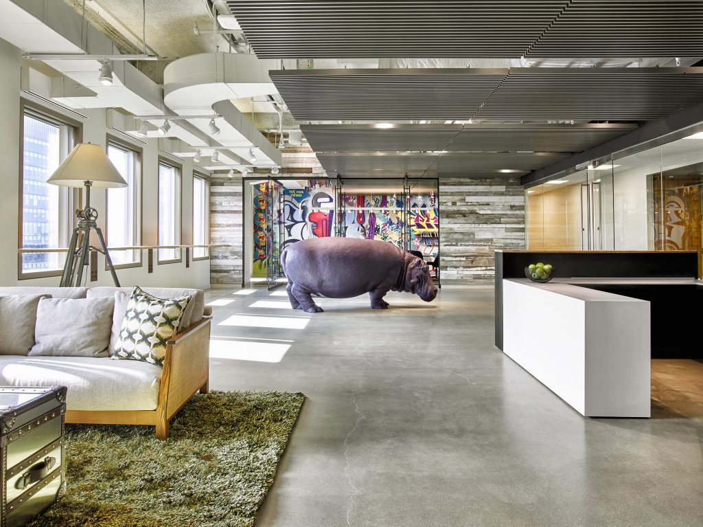 The hip, smart folks at Potamus Trading wanted their new office fit-out to reflect their youthful spirit. The space was conceived as a Sub-Saharan encampment, using ceiling trellises as the fly portion of tents and raw ceilings as the sky and surrounding environment. Fully indirect lighting creates the sky portion, while targeted track heads, concealed between the trellises, create drama and contrast.