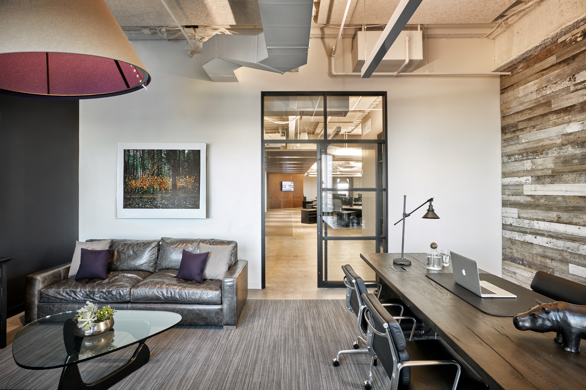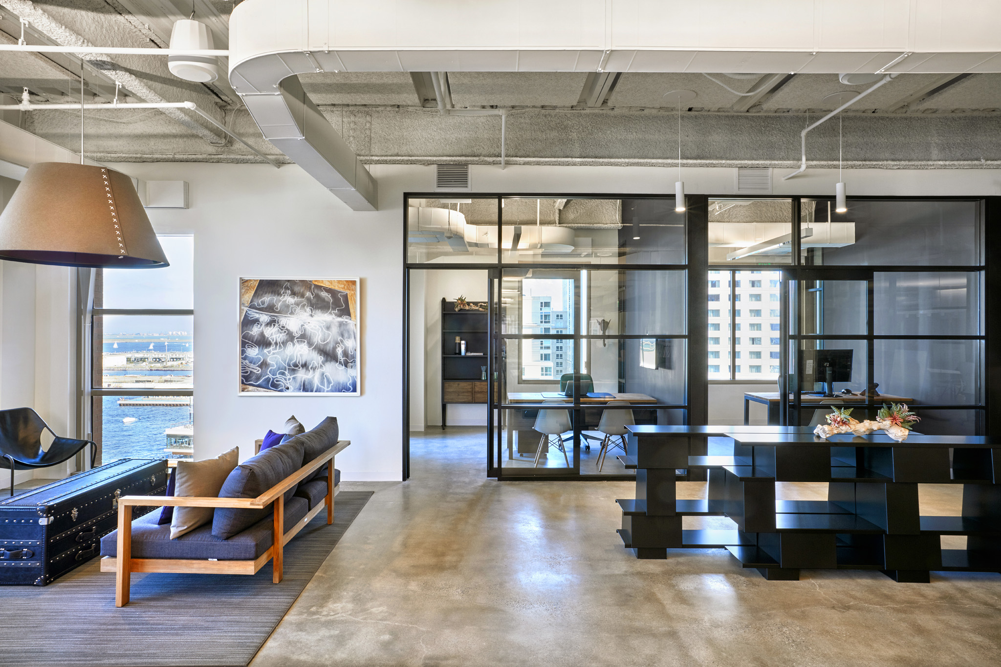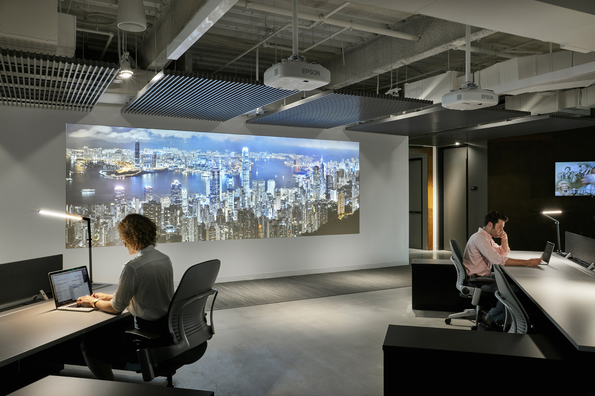 The hip, smart folks at Potamus Trading wanted their new office fit-out to reflect their youthful spirit. The space was conceived as a Sub-Saharan encampment, using ceiling trellises as the fly portion of tents and raw ceilings as the sky and surrounding environment. Fully indirect lighting creates the sky portion, while targeted track heads, concealed between the trellises, create drama and contrast.