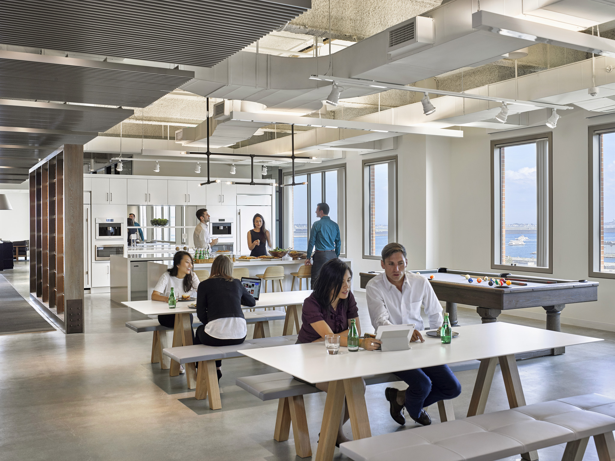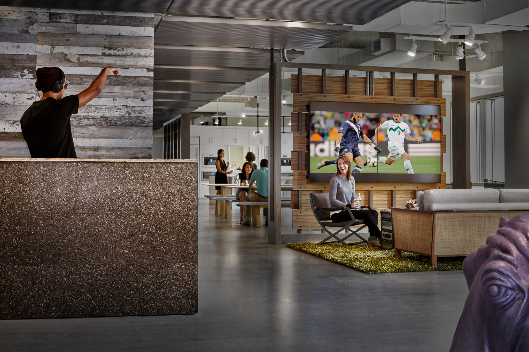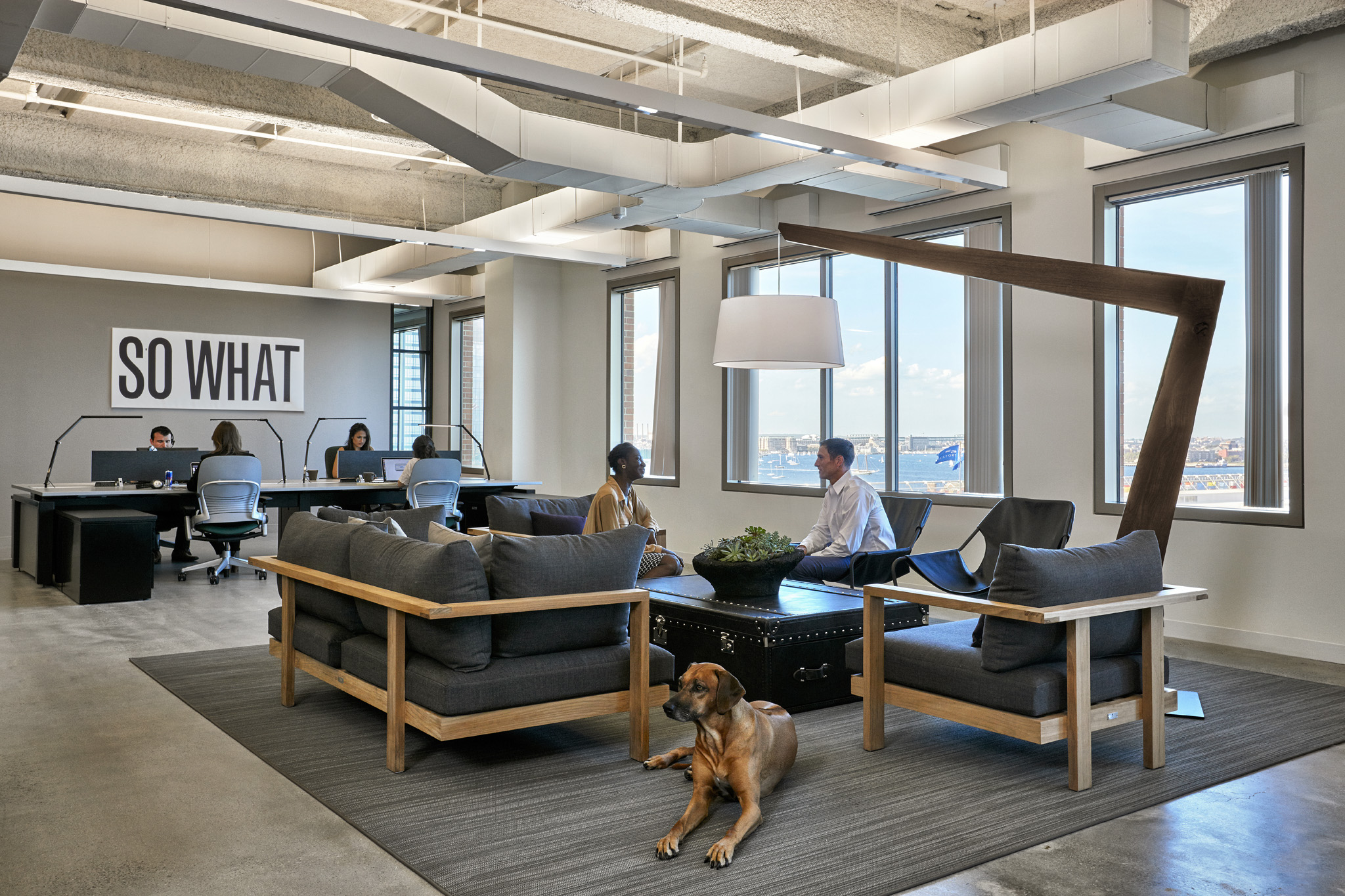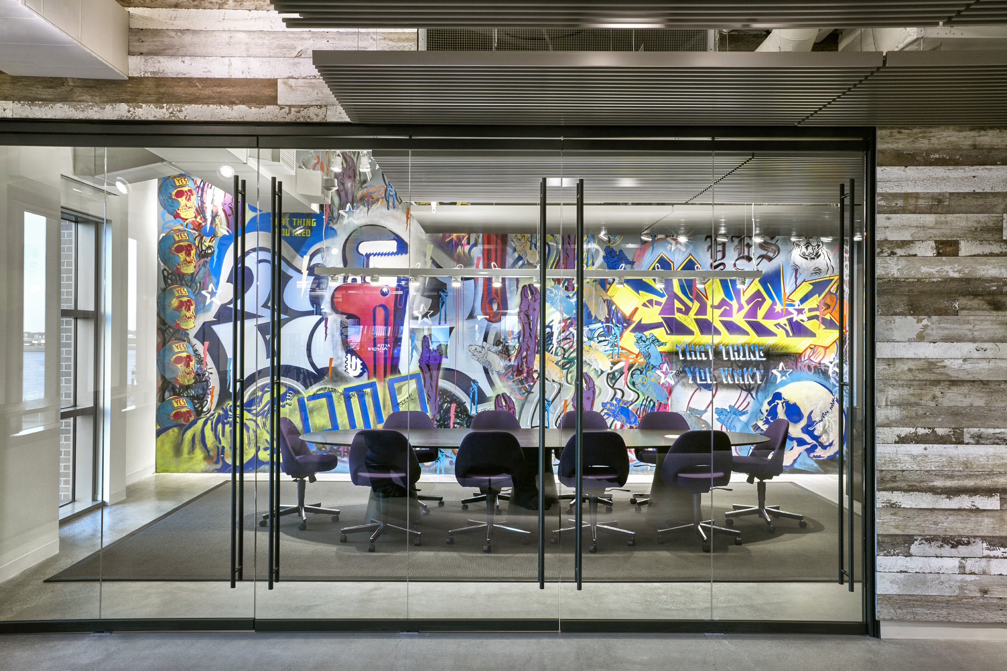 The hip, smart folks at Potamus Trading wanted their new office fit-out to reflect their youthful spirit. The space was conceived as a Sub-Saharan encampment, using ceiling trellises as the fly portion of tents and raw ceilings as the sky and surrounding environment. Fully indirect lighting creates the sky portion, while targeted track heads, concealed between the trellises, create drama and contrast.